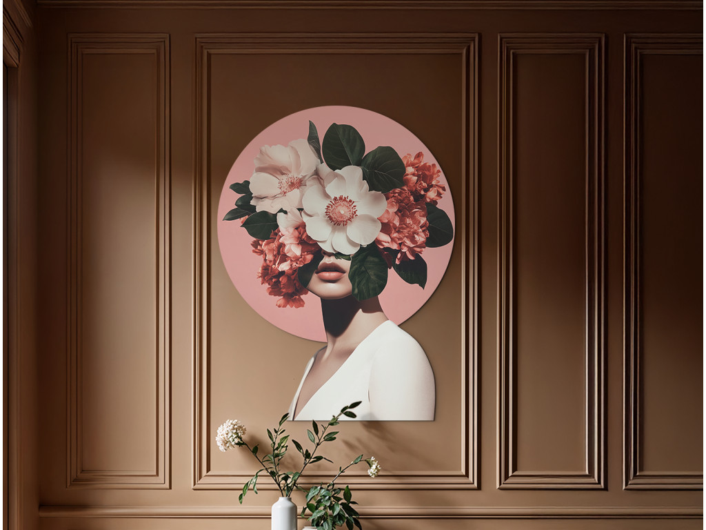 Die weibliche Figur, deren Gesicht hinter einem üppigen Blumenstrauß verborgen ist, verkörpert die Verbindung zwischen Mensch und Natur. Das rosa kreisförmige Motiv hinter ihrem Kopf erinnert an einen Heiligenschein – ein Symbol für Inspiration, Wachstum und Geheimnis. Im Kontrast zu den zarten Kleidern der Figur wirkt das Bild ruhig, ätherisch und zugleich bezaubernd. Botanische Muse ist eine Hommage an die stille Anmut und Kraft der natürlichen Schönheit.