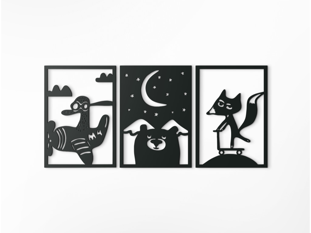 In Märchen ist alles möglich. Zum Beispiel auch, dass Tiere ein Flugzeug steuern oder Roller fahren. Wenn Ihr Kind Fantasie hat und sich ständig ungewöhnliche Geschichten ausdenkt, dass wird es sicher den dreiteiligen Holzsticker für die Wand mit fantastischen Bildern schätzen.