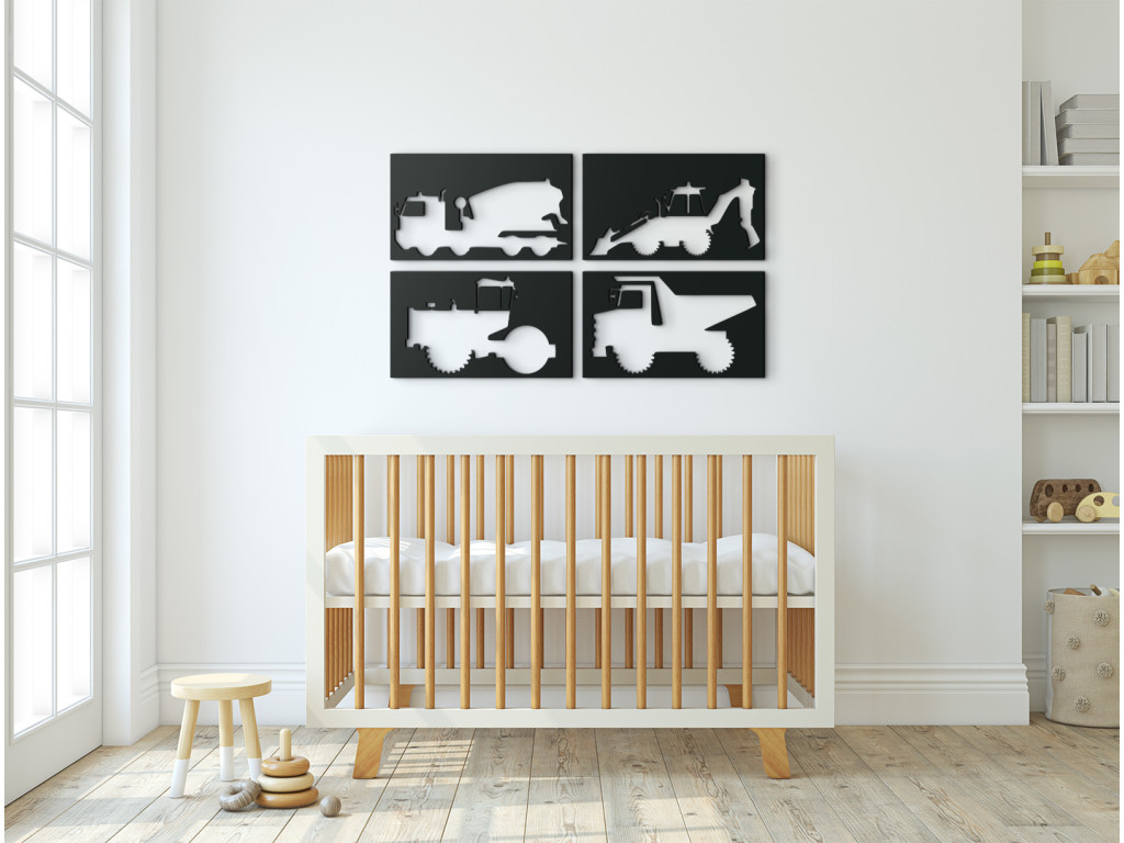 Das originelle Design des Holzstickers mit dem Motiv von Baufahrzeugen passt in jedes Jungenzimmer. Es lässt sich leicht an die Einrichtung anpassen und verleiht dem ganzen Raum ein trendiges Aussehen.