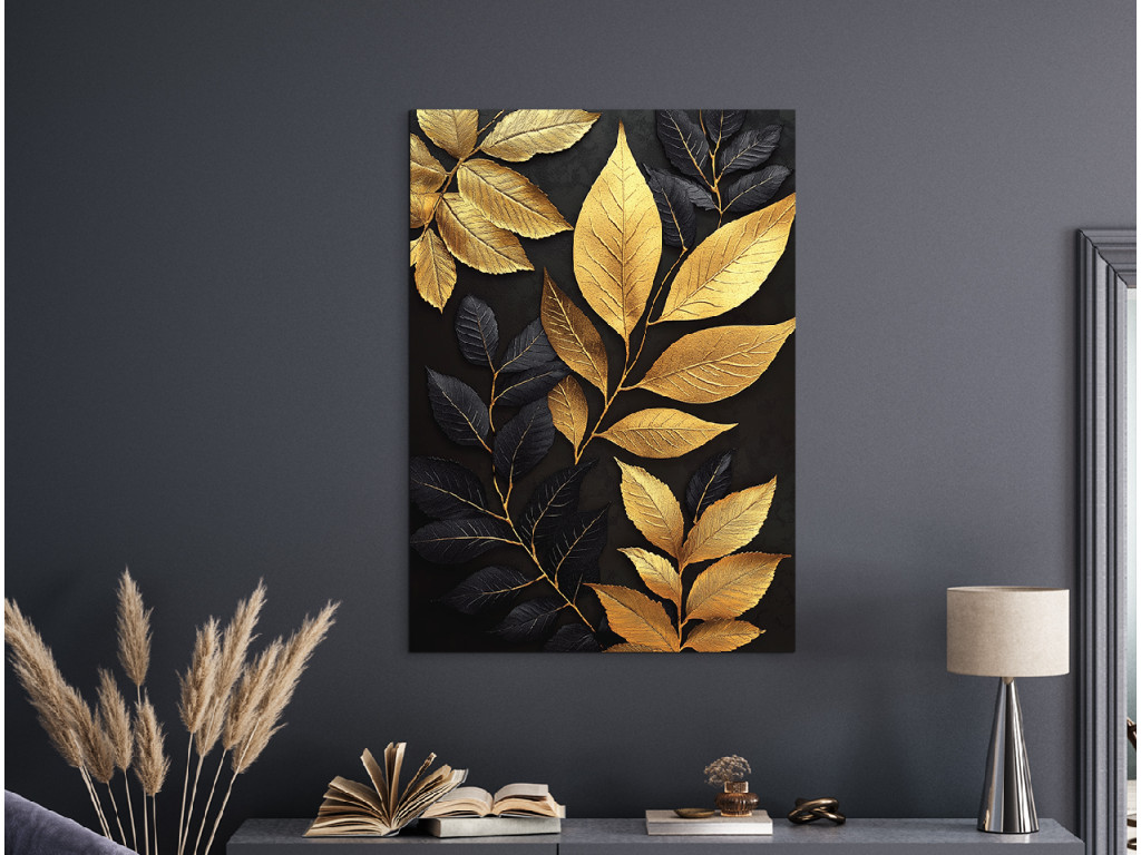 Goldene Blätter der Esche verbinden die Zartheit des Naturmotivs mit der Eleganz von Gold und dem Kontrast schwarzer Blätter auf dunklem Hintergrund. Das Bild wirkt zeitlos und verleiht dem Raum Noblesse und Ruhe. Ideal für die Wand im Schlafzimmer, Wohnzimmer oder modern eingerichteten Büro.