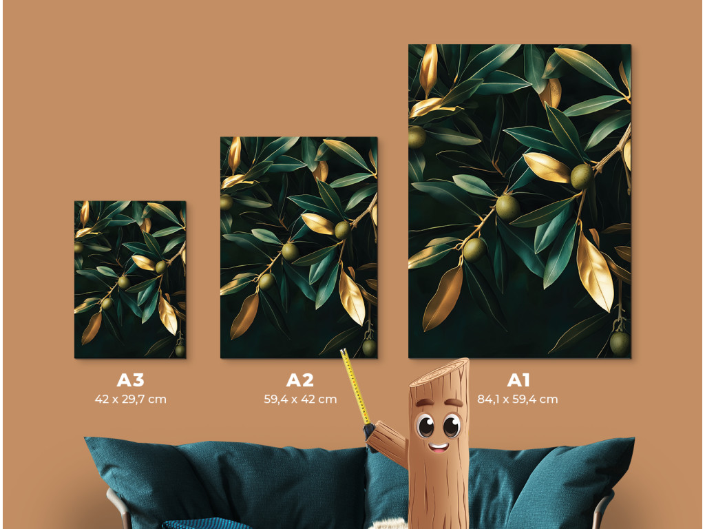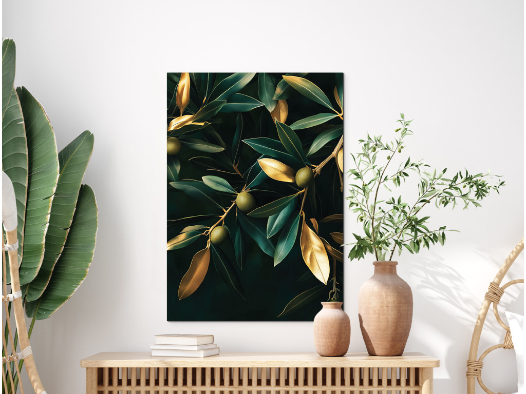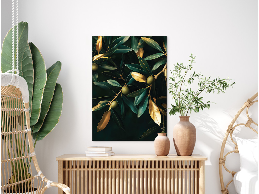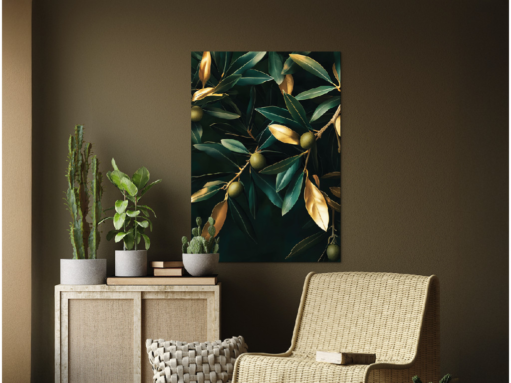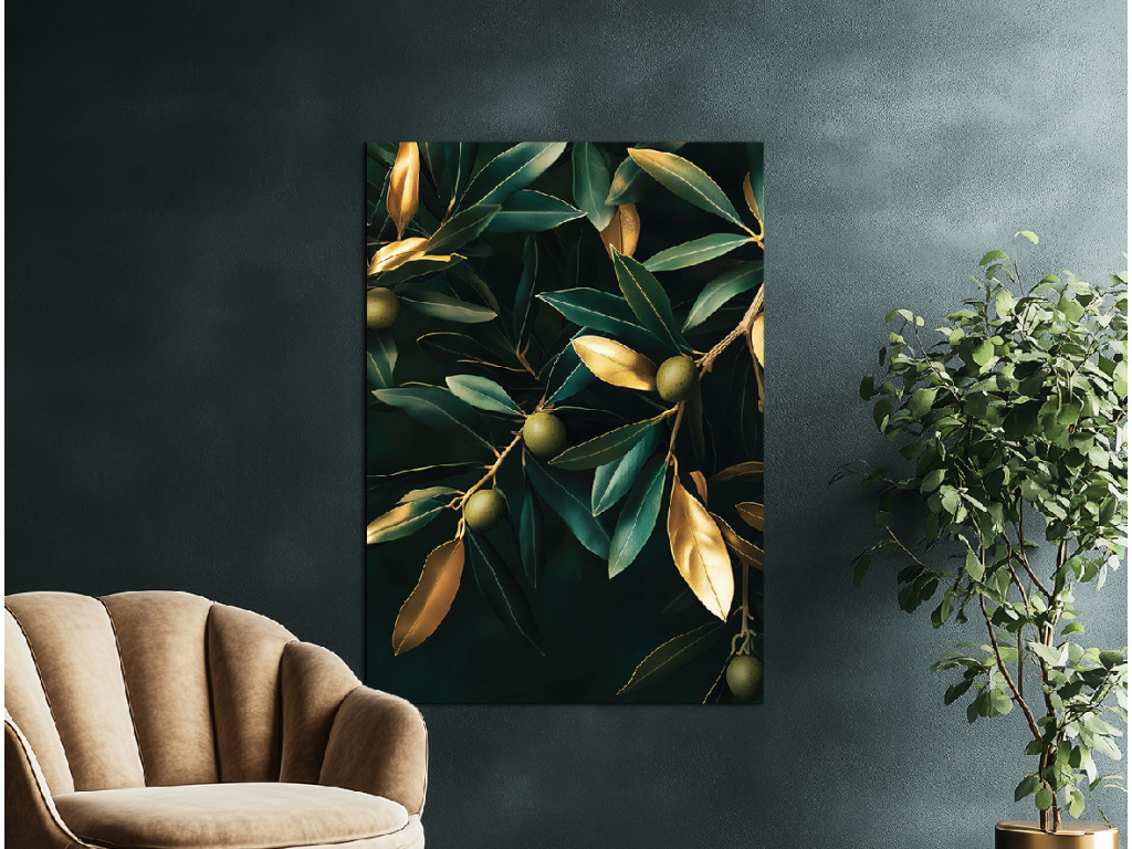 Goldene Olive ist ein modernes Bild, das einen Olivenzweig in Gold auf tiefschwarzem Hintergrund zeigt. Das minimalistische Motiv in kontrastreichen Farben wirkt luxuriös und dezent zugleich. Es passt hervorragend zu einem modernen oder natürlichen Einrichtungsstil – ideal für die Küche, das Esszimmer oder ein elegantes Arbeitszimmer.