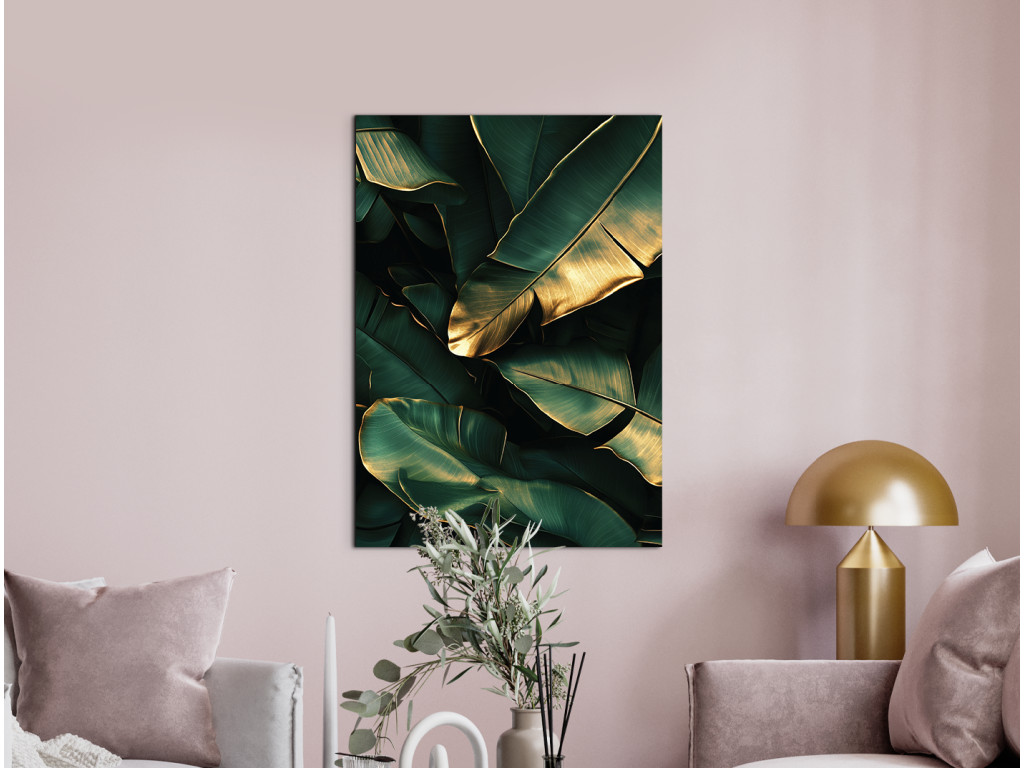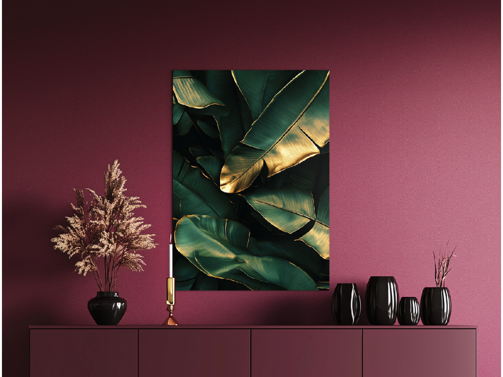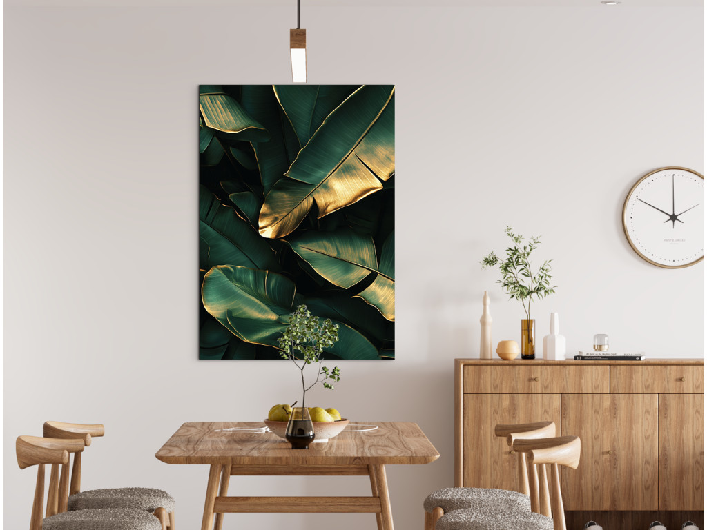 Sonnenverwöhnte Blätter ist ein Bild voller Zartheit und Licht – die grünen Blätter mit einem Hauch von goldenem Schimmer wirken, als würden sie gerade von den warmen Strahlen der Sonne beleuchtet. Die Kombination aus frischem Grün und goldenem Glanz schafft eine harmonische und beruhigende Komposition. Geeignet für die Wand im Schlafzimmer, Wohnzimmer oder in einem Raum, in dem Sie eine angenehme, natürliche Atmosphäre schaffen möchten.