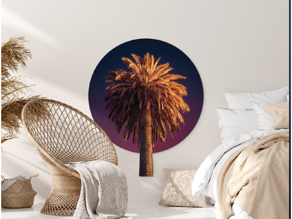Das Bild zeigt eine Dattelpalme mit hohem Stamm und großen, fächerförmigen Blättern. Diese Palmenart wächst in warmen Ländern und wird oft mit Stränden, Sonne und Entspannung in Verbindung gebracht.