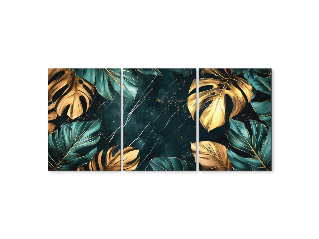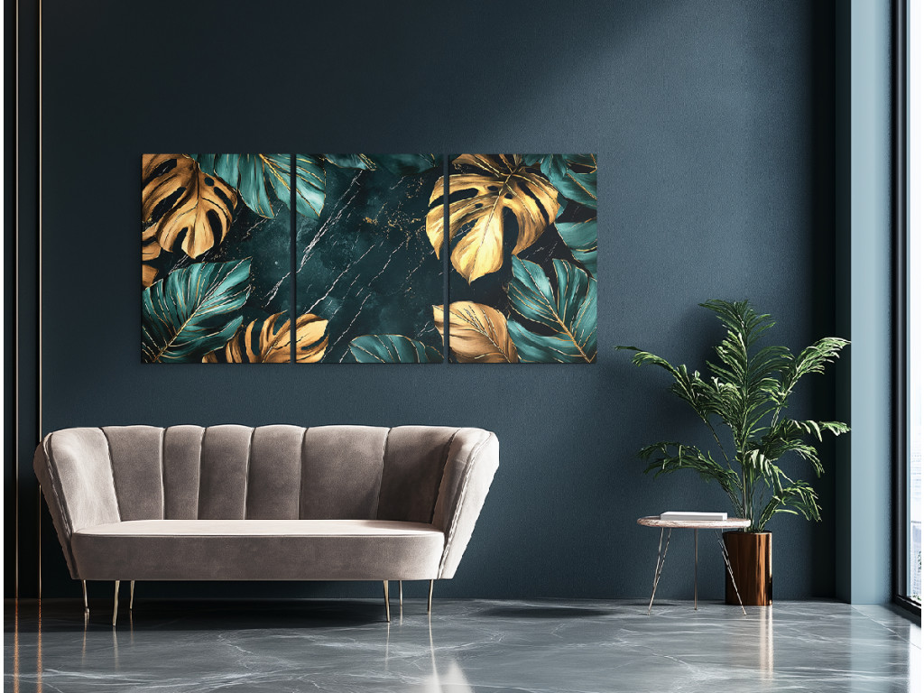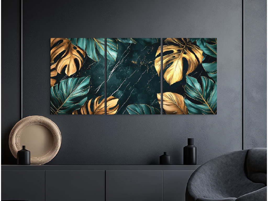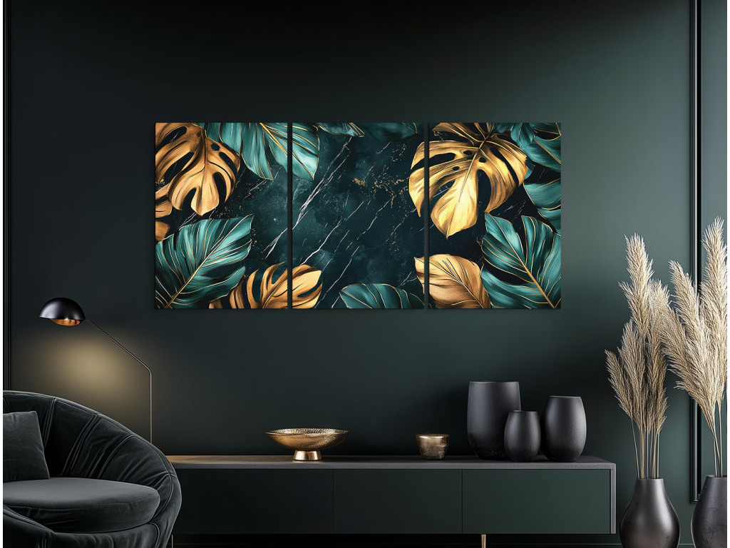 Die Monstera in dreiteiliger Ausführung wirkt dank der Kombination aus Gold, Schwarz und Smaragdgrün elegant und luxuriös. Die Blätter auf dunklem Hintergrund vermitteln einen Eindruck von Tiefe und tropischer Noblesse, der in einem modernen Ambiente besonders gut zur Geltung kommt.