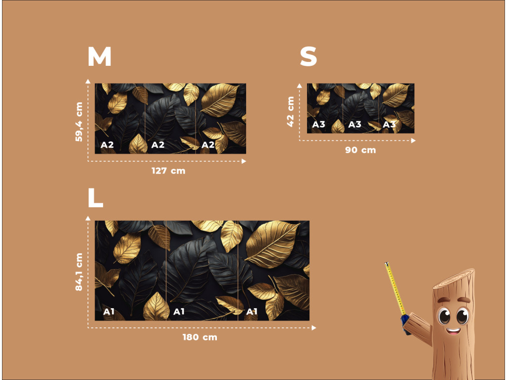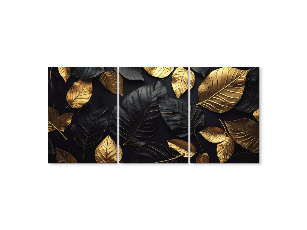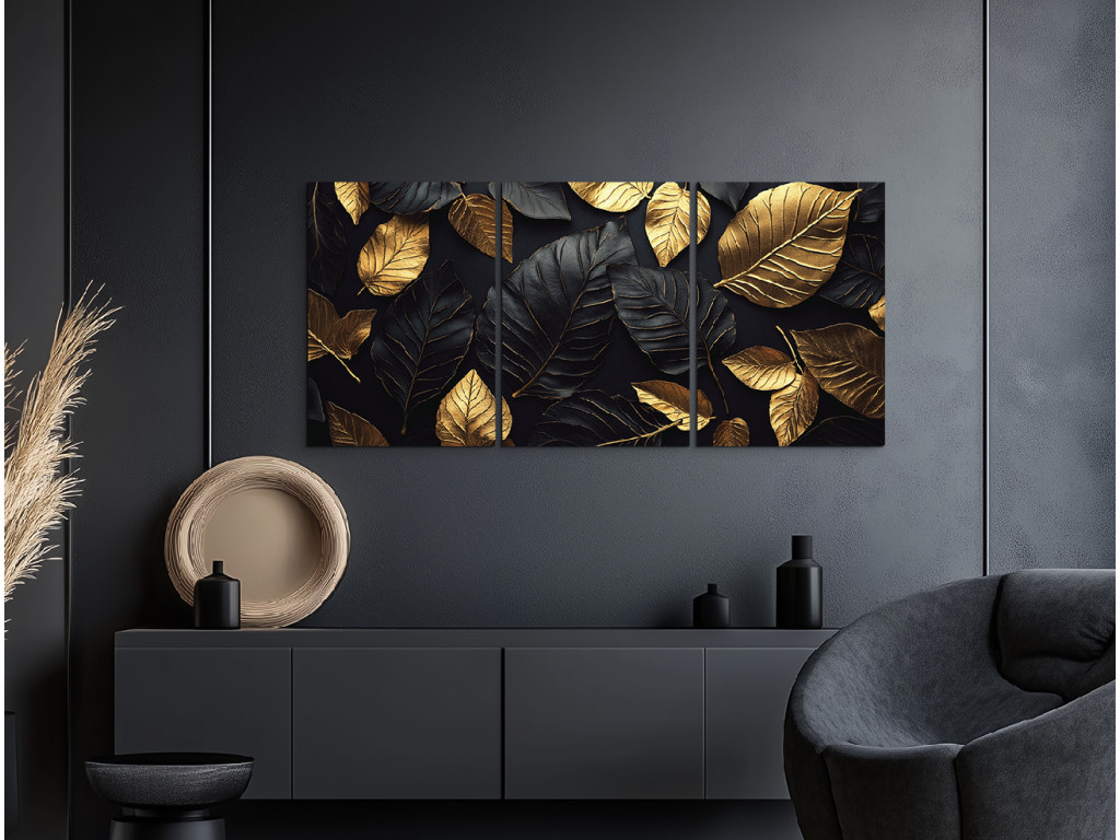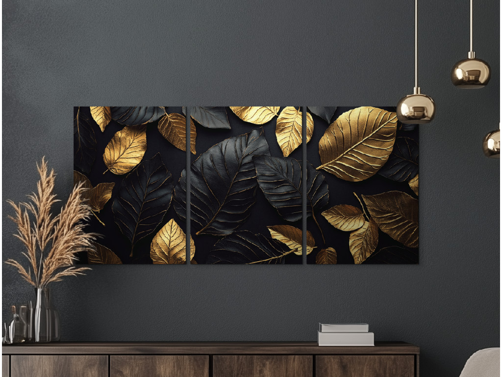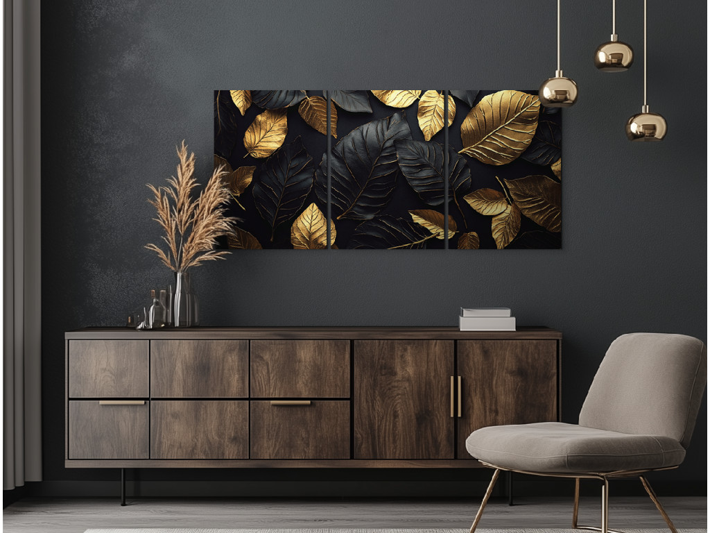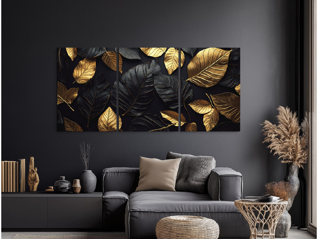Das dreiteilige Dekorationsbild Goldenes Blatt besticht durch das harmonische Zusammenspiel von goldenen und schwarzen Blättern vor einem tiefschwarzen Hintergrund. Dieses markante und elegante Werk wirkt luxuriös und modern zugleich. Es eignet sich hervorragend für die Wand hinter dem Sofa oder im Eingangsbereich, wo es sofort die Aufmerksamkeit auf sich zieht.