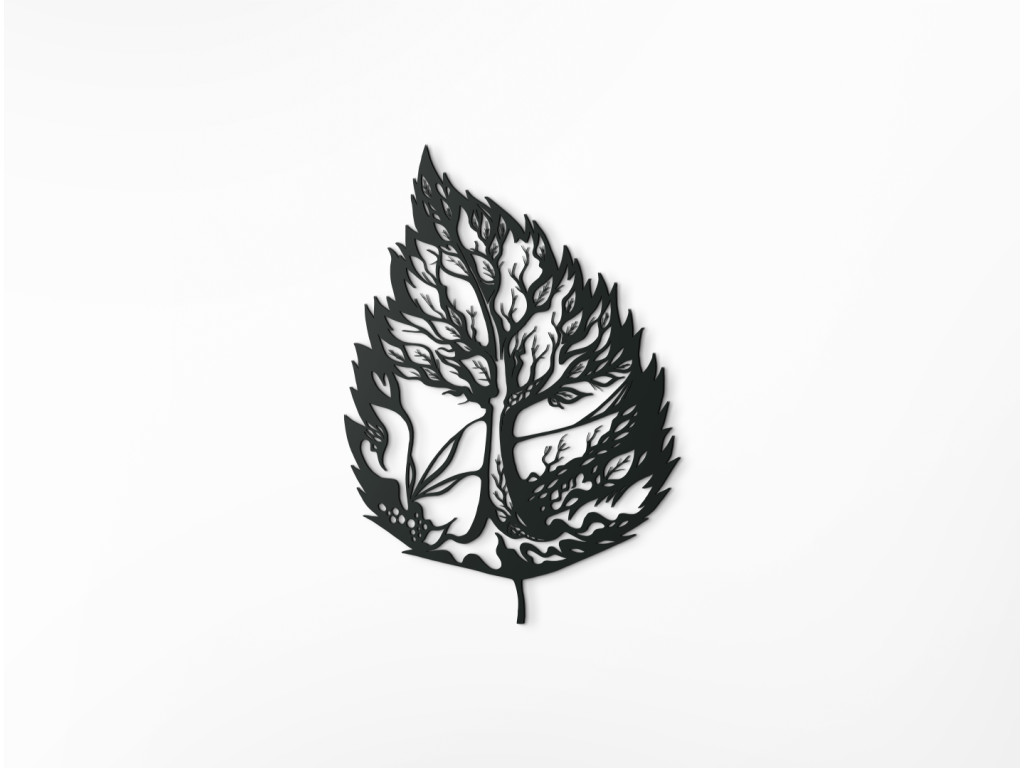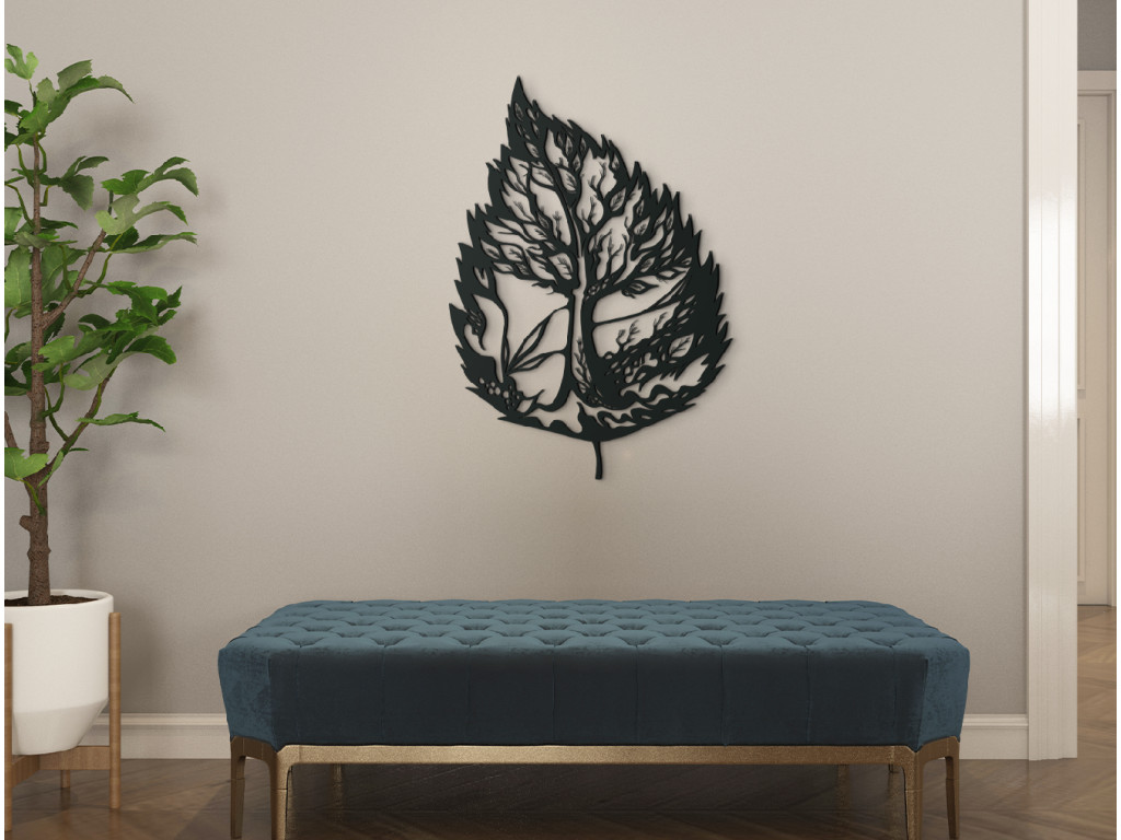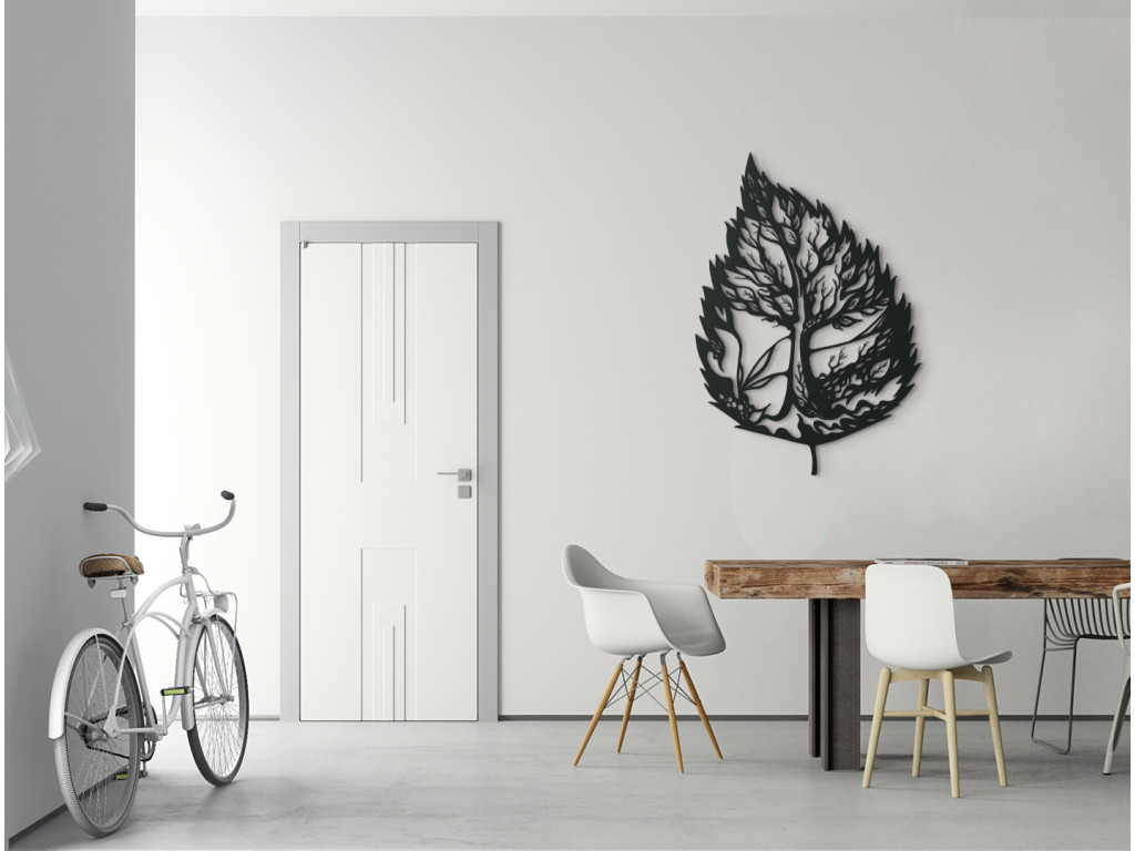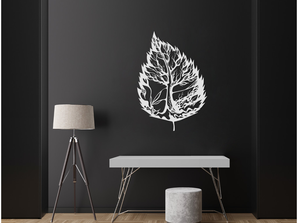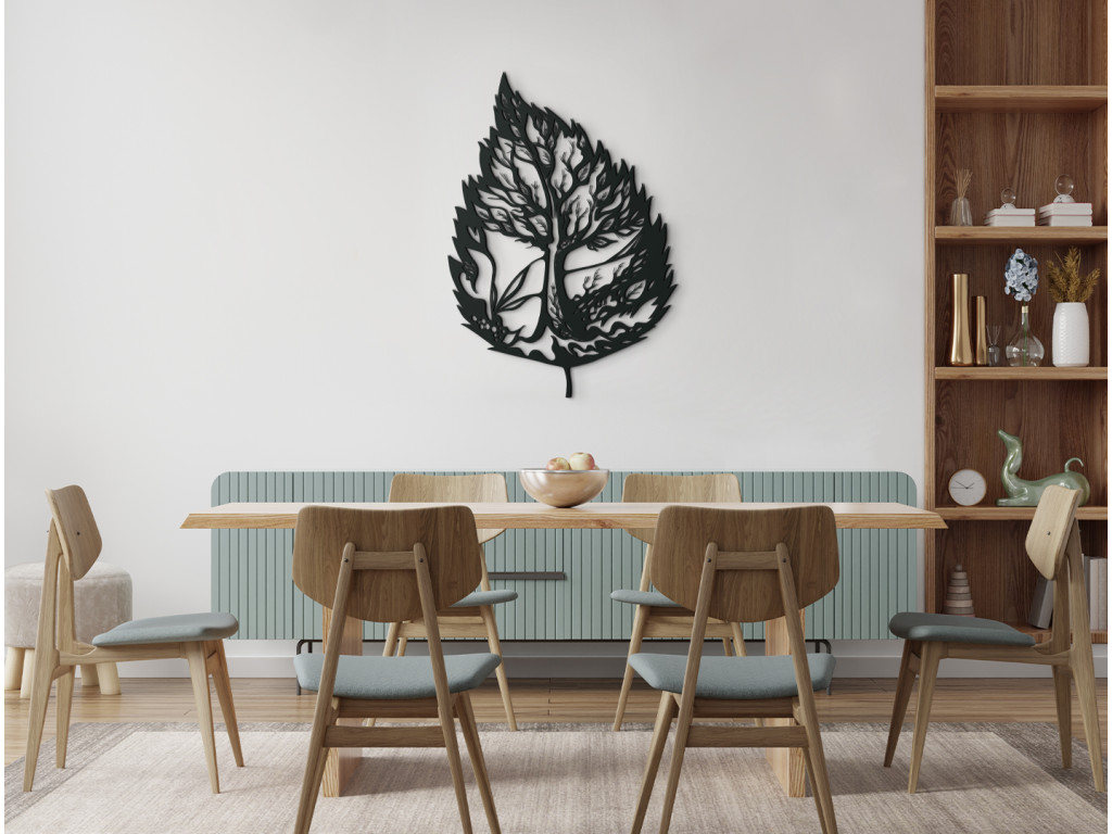 Sie mögen ungewöhnliche Dekorationen? Der originelle hölzerne Wandsticker ist eine hervorragende Dekoration für moderne Haushalte. Der Baum befindet sich im Rahmen eines Blatts, weshalb das Bild einfallsreich und originell daherkommt. Es passt in jeden beliebigen Raum.