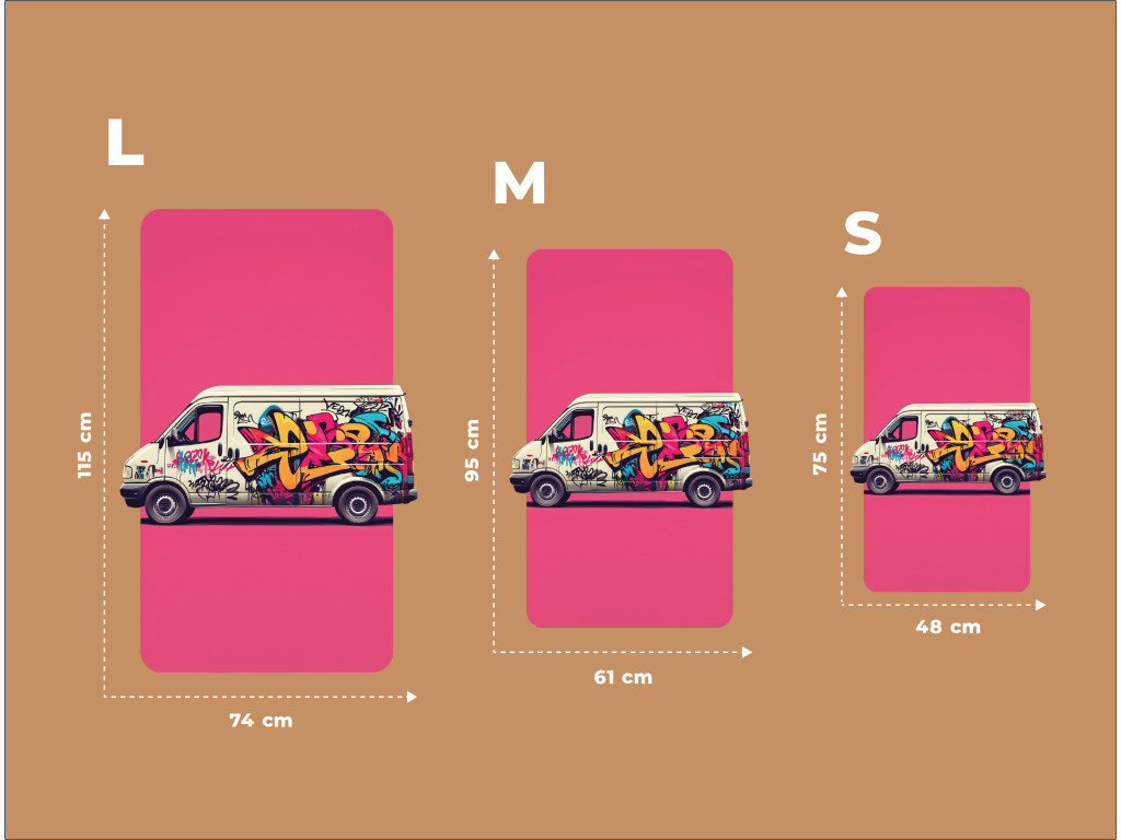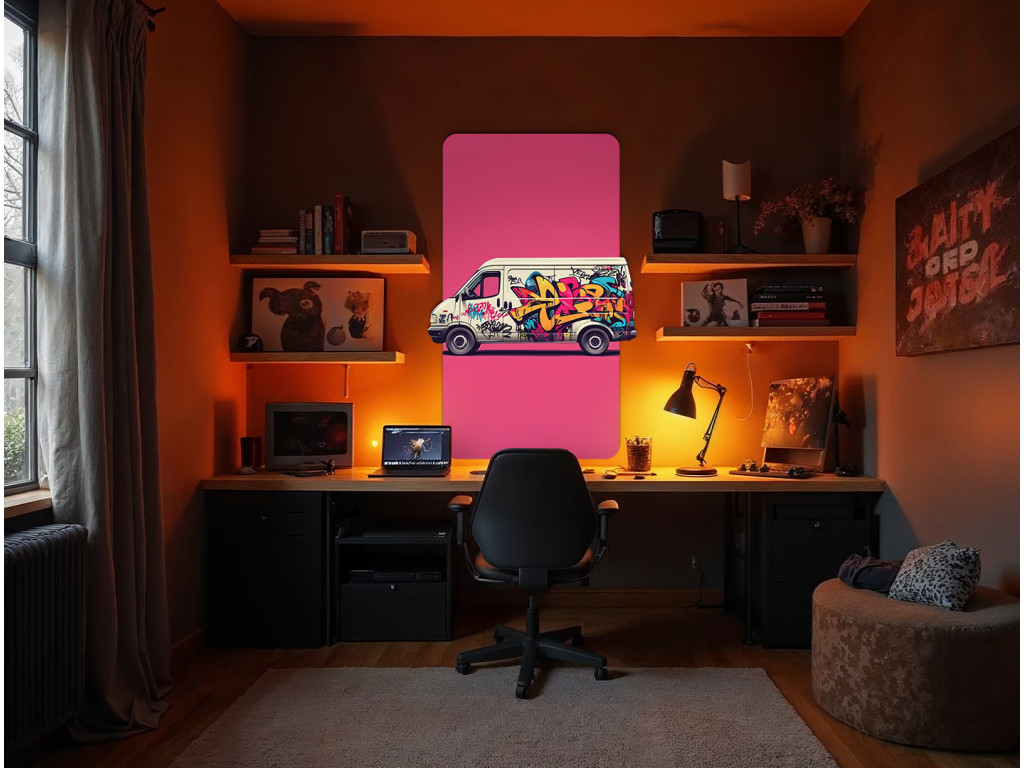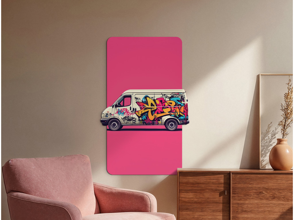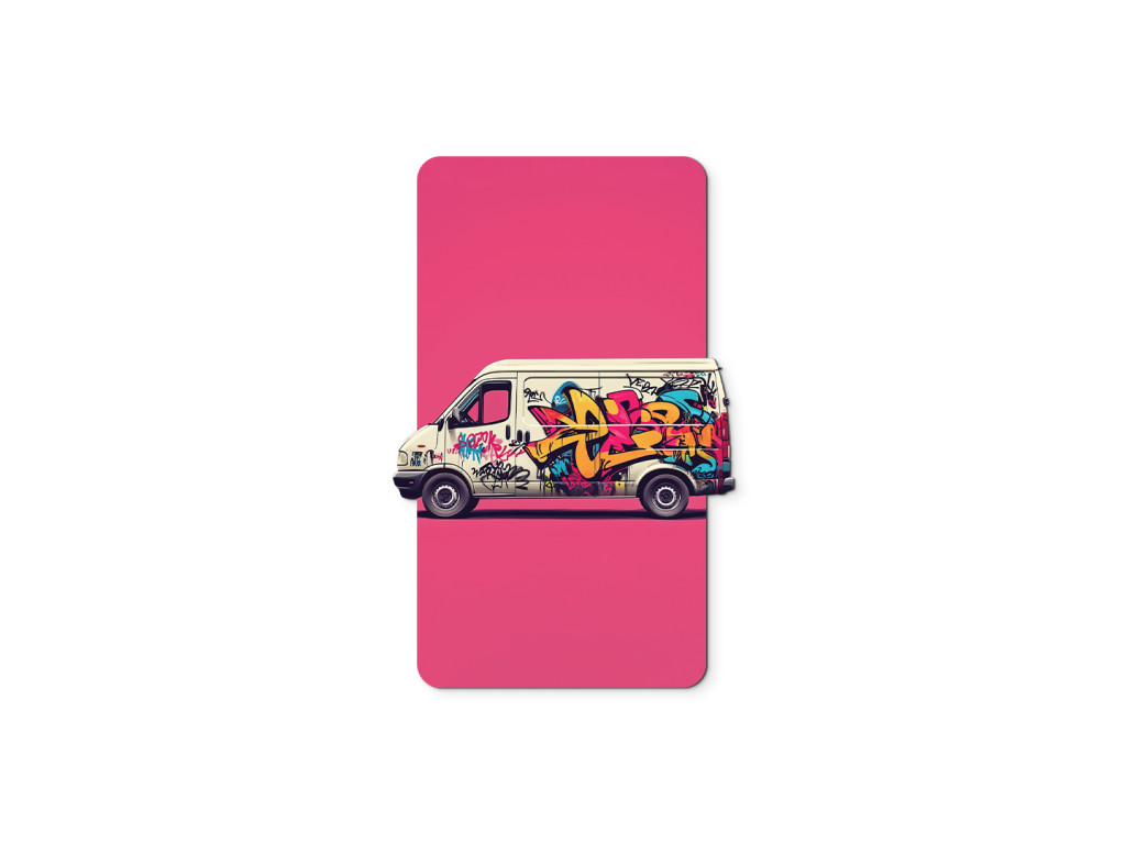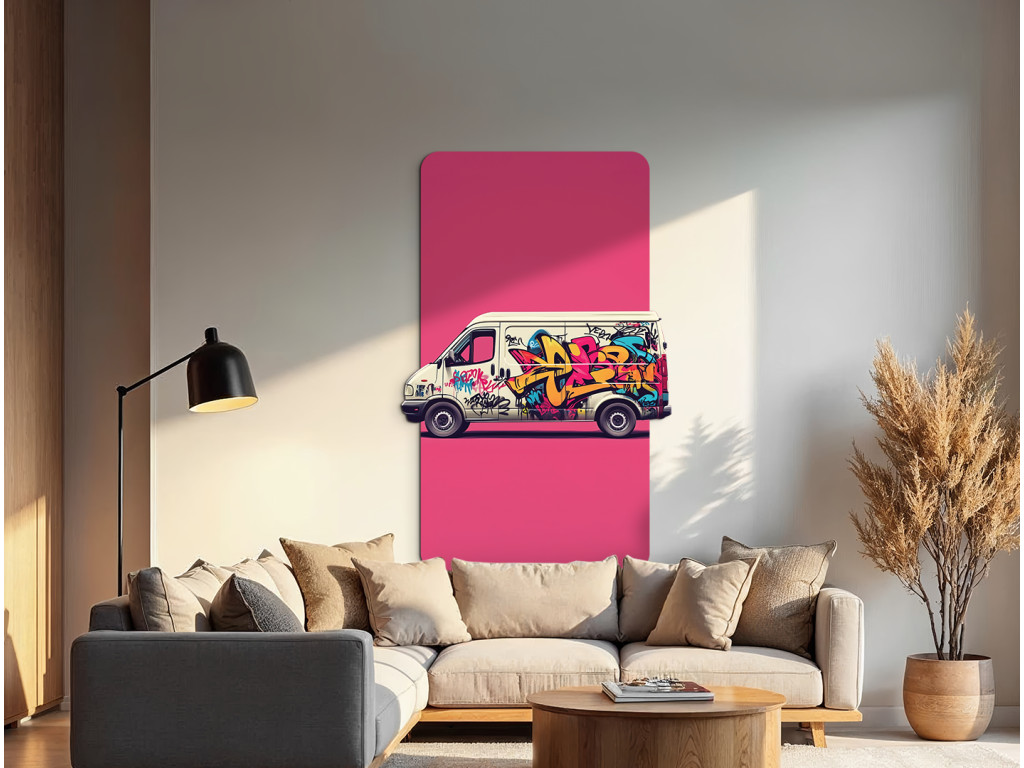 Das Bild zeigt einen Lieferwagen, der mit farbenfrohen Graffitis bedeckt ist und vor einem rosa rechteckigen Hintergrund steht. Das dynamische Street-Art-Design wirkt wie ein Teil eines modernen Dekors oder wie ein Aufdruck auf einer Verpackung.