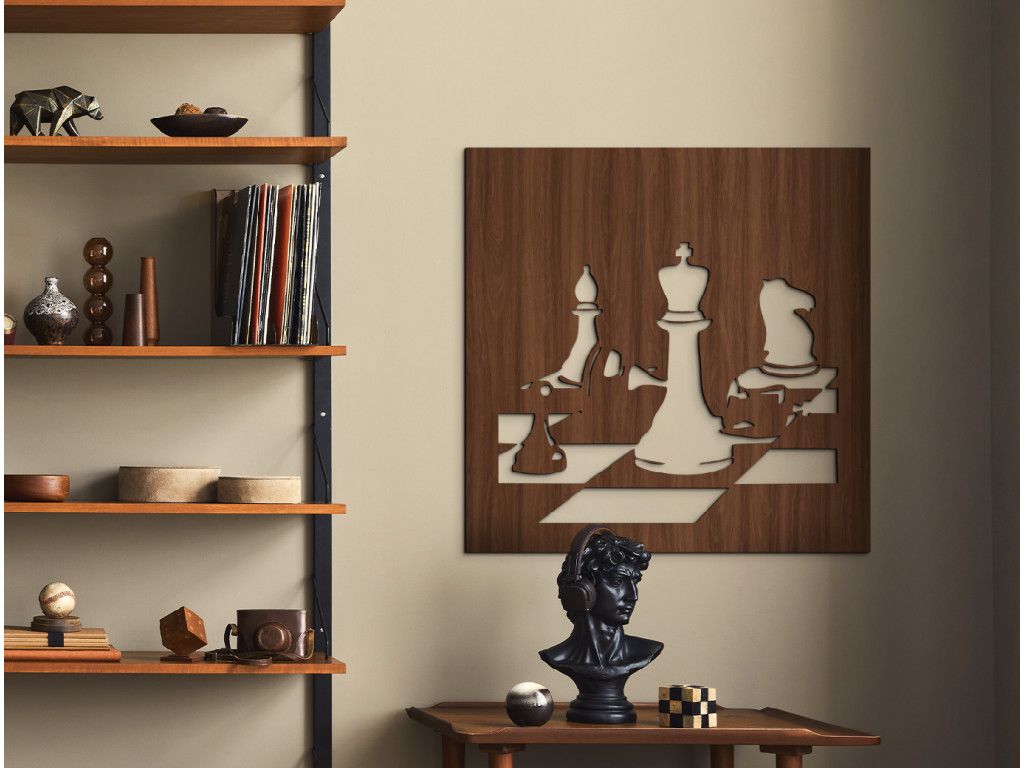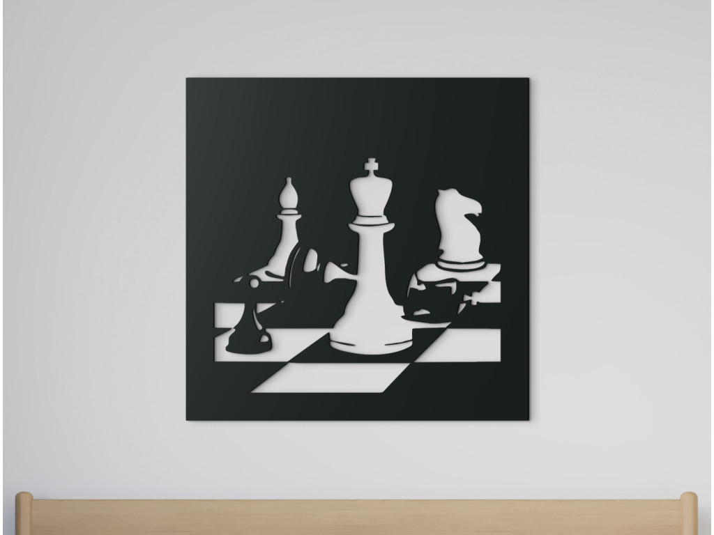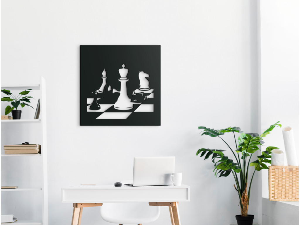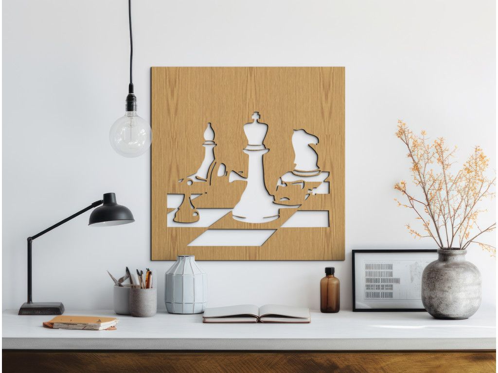 Das Holzbild SCHACH MATT bringt originelles Design in den Raum. Es passt vor allem zu modernen Einrichtungen, über das Bett, eine Kommode oder die Couch. Auf dem Bild sind Schachfiguren zu sehen.