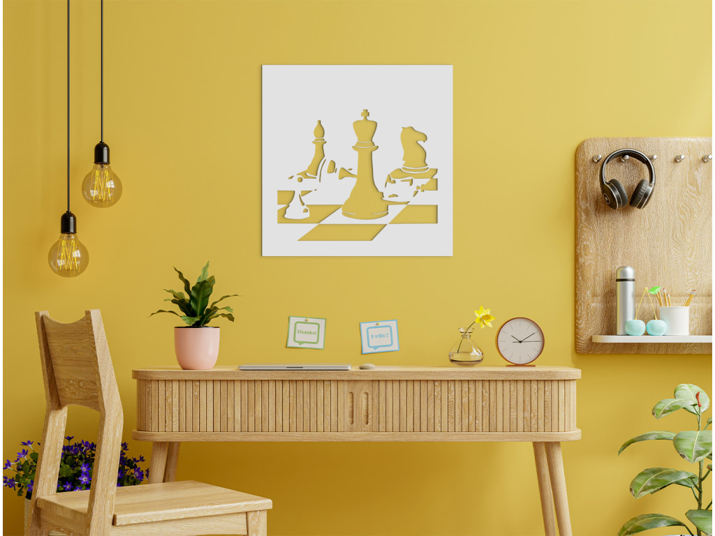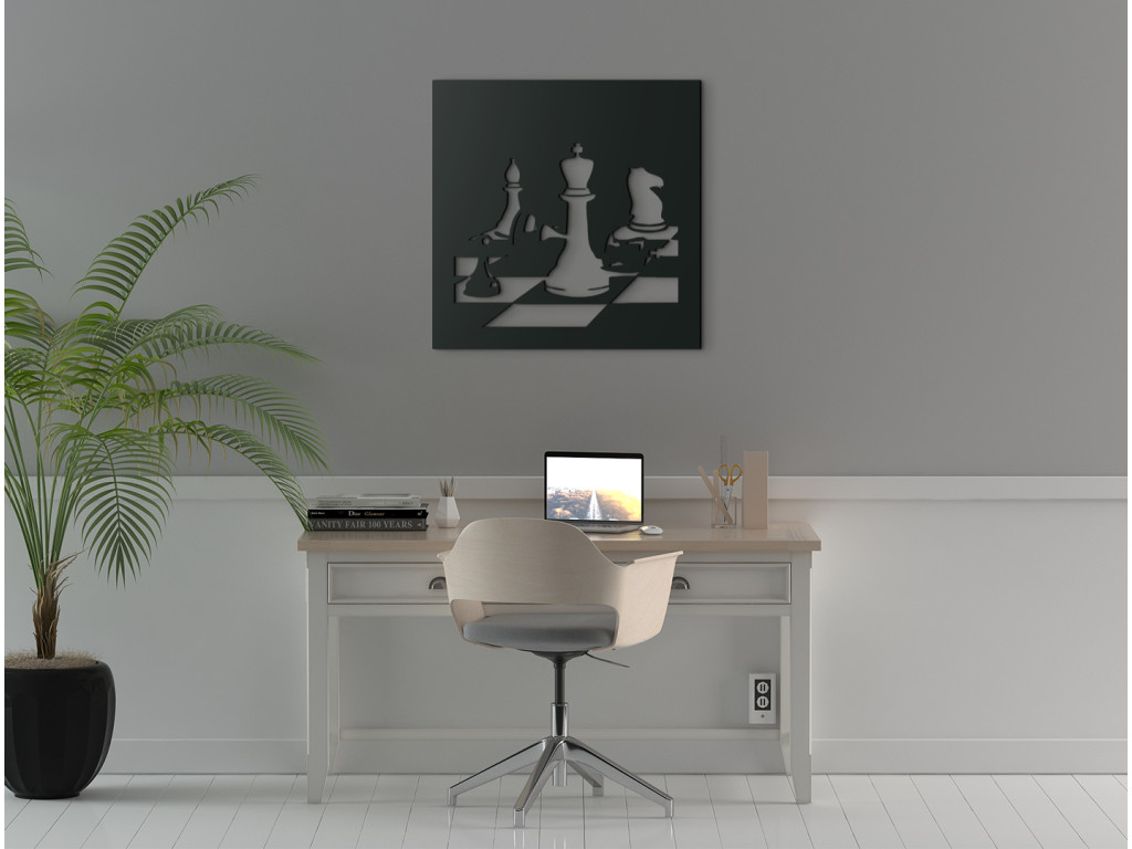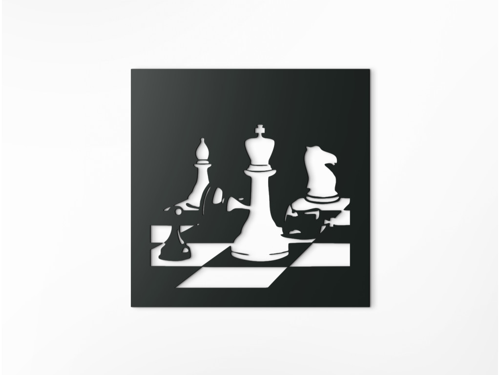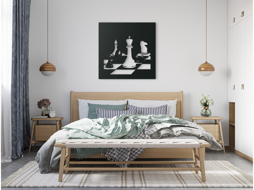 Das Holzbild SCHACH MATT bringt originelles Design in den Raum. Es passt vor allem zu modernen Einrichtungen, über das Bett, eine Kommode oder die Couch. Auf dem Bild sind Schachfiguren zu sehen.