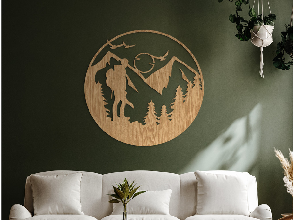 Die Dekoration zeigt eine Figur auf einem Wanderausflug, die das Panorama der Berge und der Natur genießt . Es ist eine Einladung, in die Wildnis zu entkommen und die Schönheit zu entdecken, die uns umgibt.