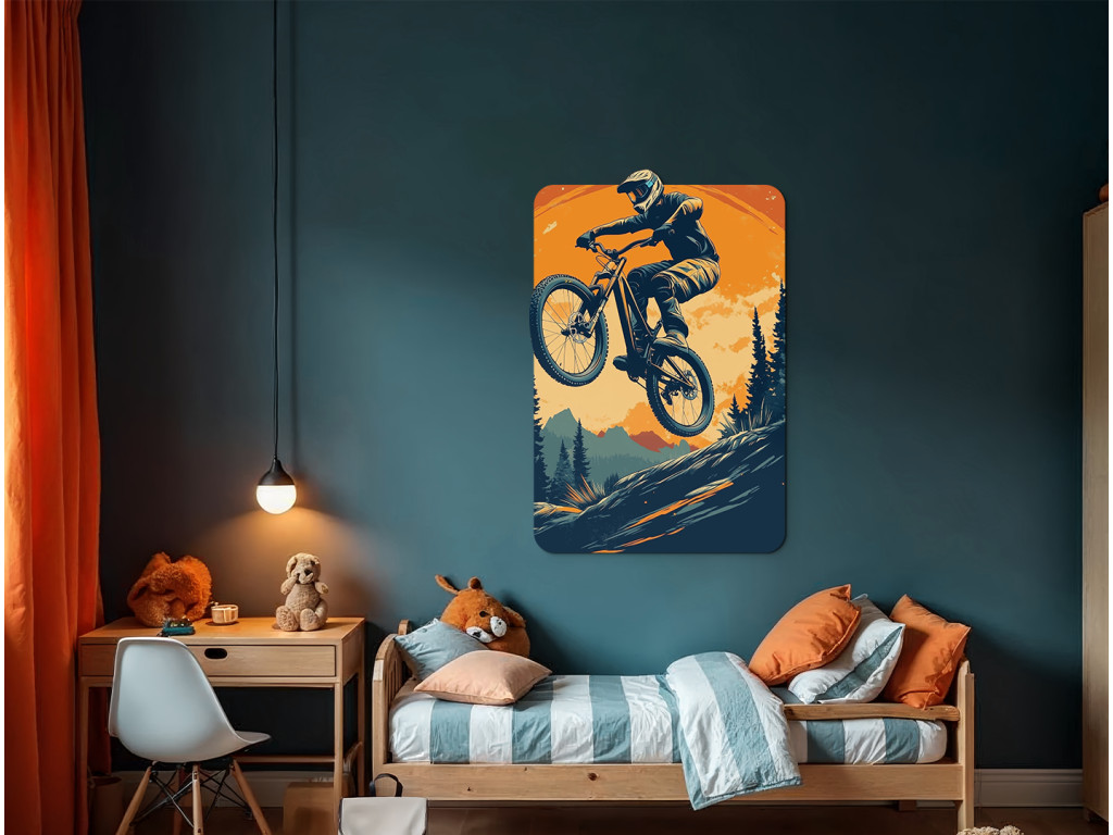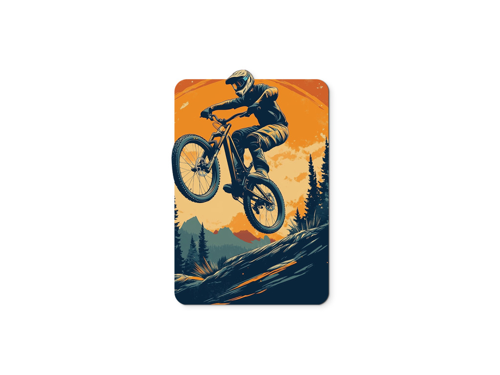 Das Bild zeigt einen Mountainbiker in rauer Naturlandschaft – über Hänge, Wurzeln und Steine. Die dynamische Szene unterstreicht die Kraft, das Gleichgewicht und den Abenteuergeist dieses Sports. Geeignet für alle Natur- und Adrenalinliebhaber.