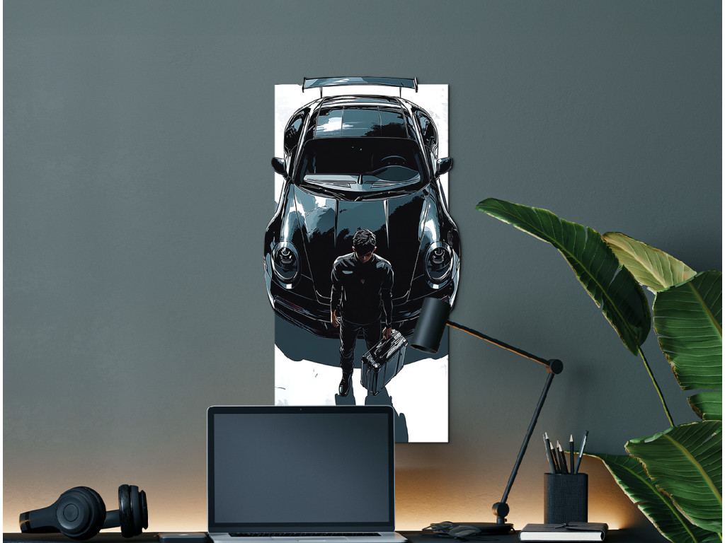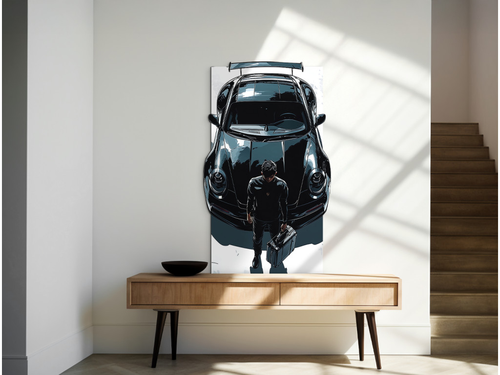 Das Bild zeigt die Draufsicht auf einen eleganten dunklen Sportwagen, wahrscheinlich vom Typ Porsche, mit einem markanten Heckflügel, der seinen dynamischen Charakter unterstreicht. Vor dem Fahrzeug steht eine einsame Person mit einem Koffer, die mit dem Gesicht zum Auto gewandt ist. Die gesamte Komposition wirkt durchdacht und erinnert an das Thema Abschied, Abenteuer oder eine lebenswichtige Entscheidung.
