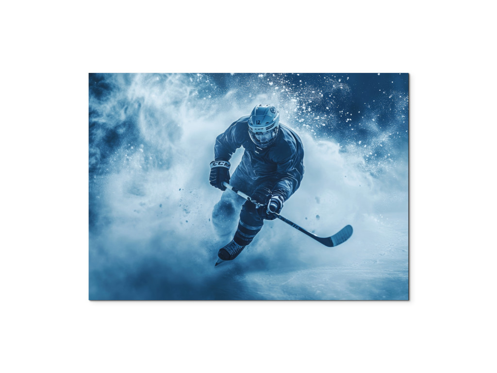 Das moderne Bild zeigt einen dynamischen Eishockeyspieler in voller Aktion, wie er sich mit Schläger und Puck schnell über das Eis bewegt, während um ihn herum Eisstaub wirbelt, was das Gefühl von Geschwindigkeit und Intensität verstärkt.