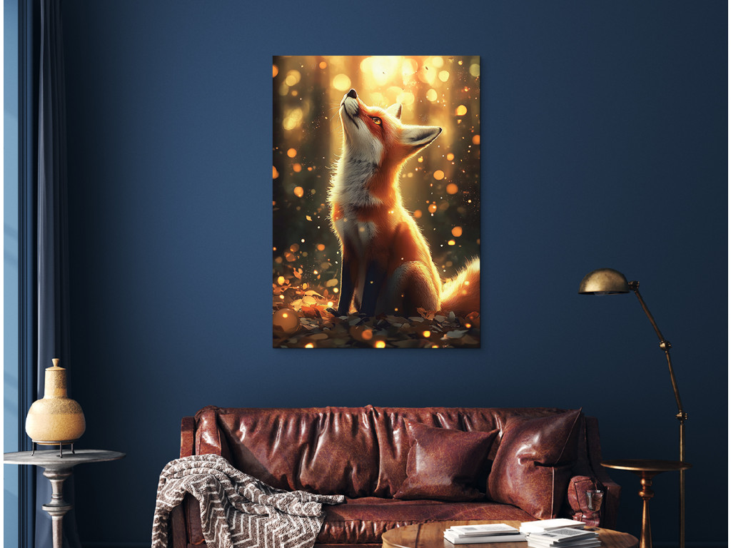 Der Gruß des Fuchses an die Sonne ist ein liebevolles Bild, das einen Fuchs zeigt, der ruhig dasitzt und nach oben schaut – als würde er still mit der Natur kommunizieren oder das durch die Baumkronen fallende Licht bewundern. Sein Fell schimmert sanft in den Sonnenstrahlen, was der gesamten Szene eine warme, beruhigende Atmosphäre verleiht. Das Bild wirkt wie ein Symbol für Neugier, Ruhe und Verbundenheit mit dem Moment.