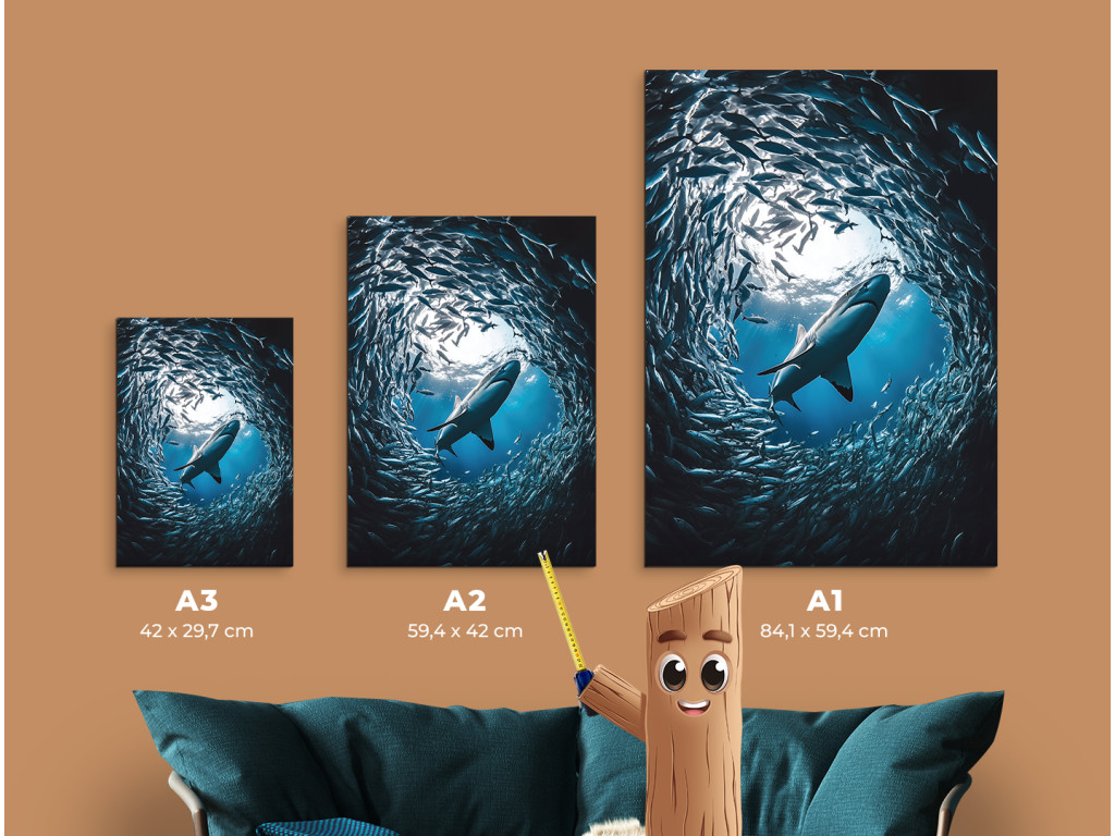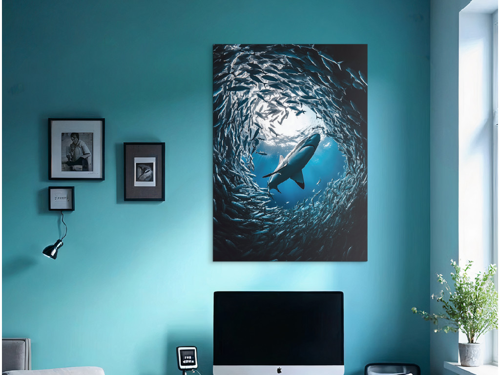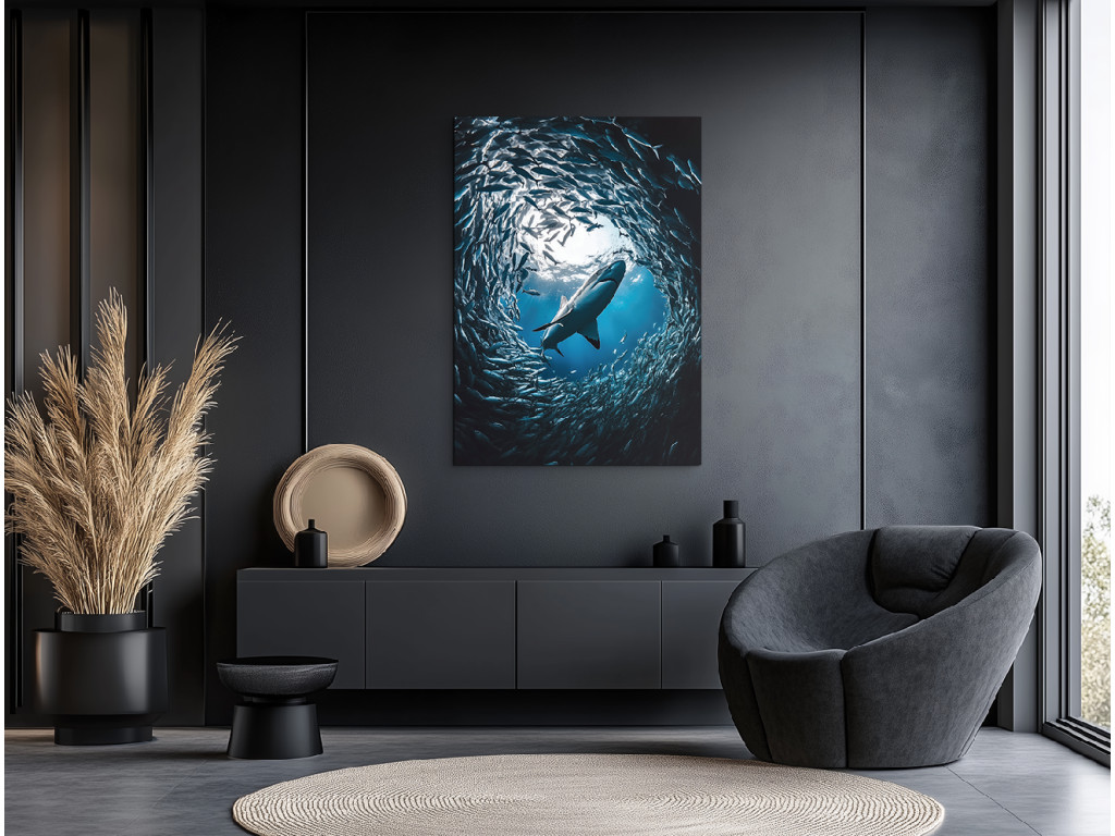 Der Herrscher unter der Oberfläche ist ein faszinierendes Unterwasserbild, das einen Hai zeigt, der inmitten eines riesigen Fischschwarms schwimmt, welcher wie ein lebhafter Ozeanstrudel um ihn herumwirbelt. Das von der Oberfläche eindringende Licht erzeugt dramatische Strahlen, die die Dynamik und Spannung der Szene unterstreichen. Der Hai, ruhig und stark, ist sowohl visuell als auch symbolisch der Mittelpunkt der Komposition – die Verkörperung von Kraft, Ruhe und Kontrolle im Chaos.