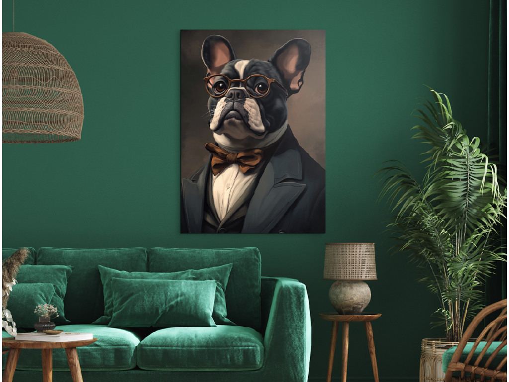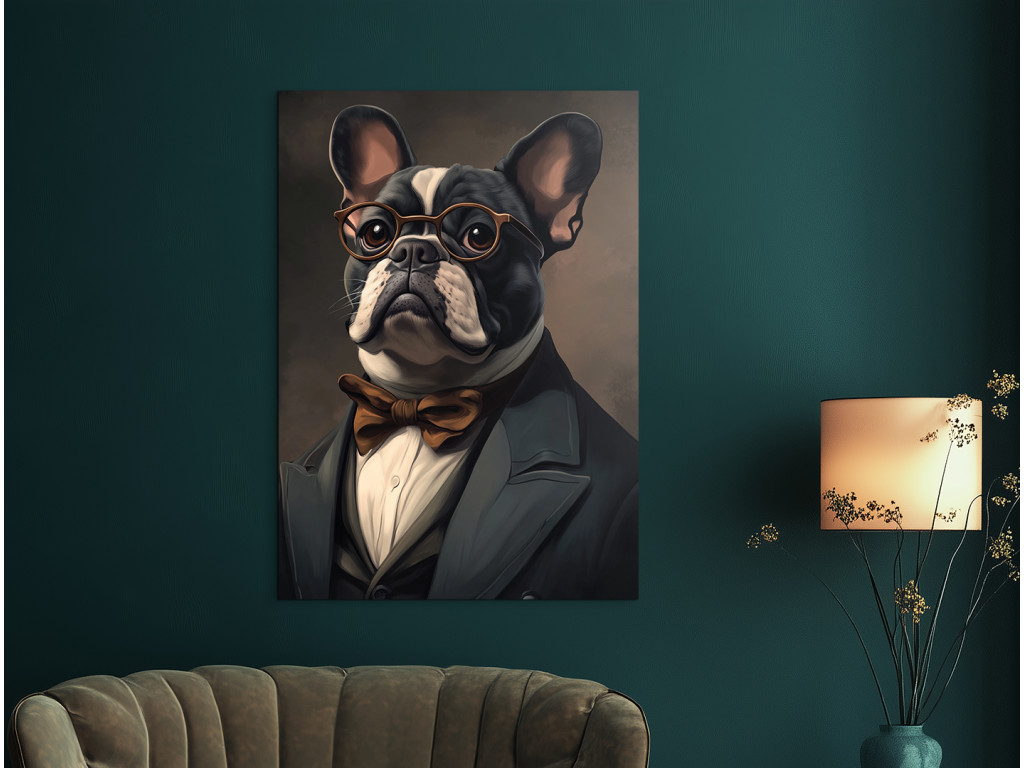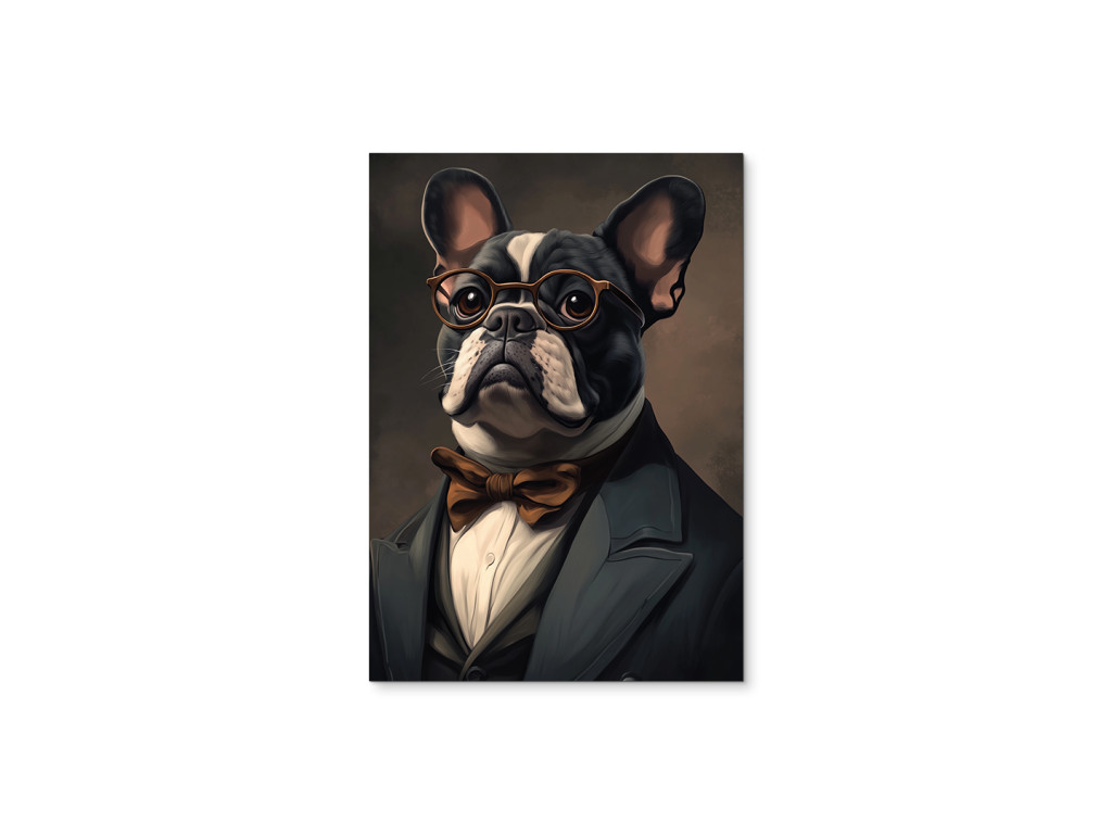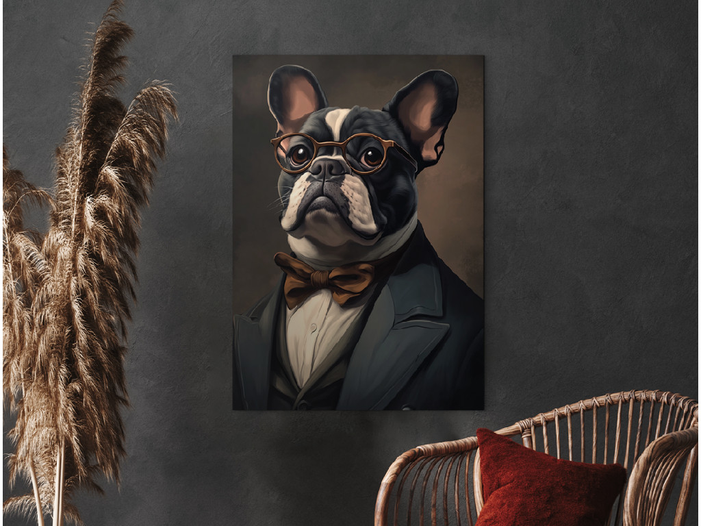 Herr Bulldogge ist ein stilvolles und unterhaltsames Porträt einer französischen Bulldogge, die in einem Anzug mit Fliege und runden Brillen wie ein vornehmer Herr mit eigener Meinung wirkt. Seine ikonischen „Fledermausohren”, sein flaches Gesicht und sein selbstbewusster Ausdruck bilden in Kombination mit dem dunklen Hintergrund einen starken visuellen Kontrast und eine unverwechselbare Atmosphäre. Ein ideales Bild für das Wohnzimmer, das Arbeitszimmer oder einen stilvollen Raum, in dem Individualität, Design und ein wenig Hundehumor geschätzt werden.