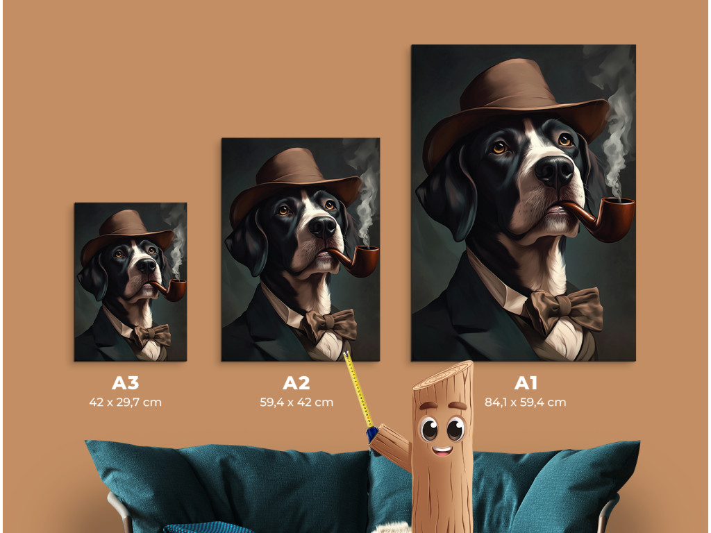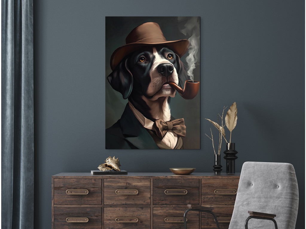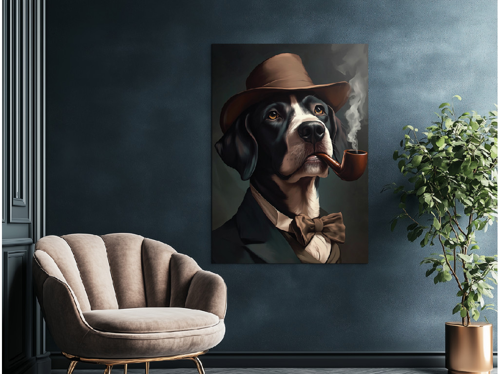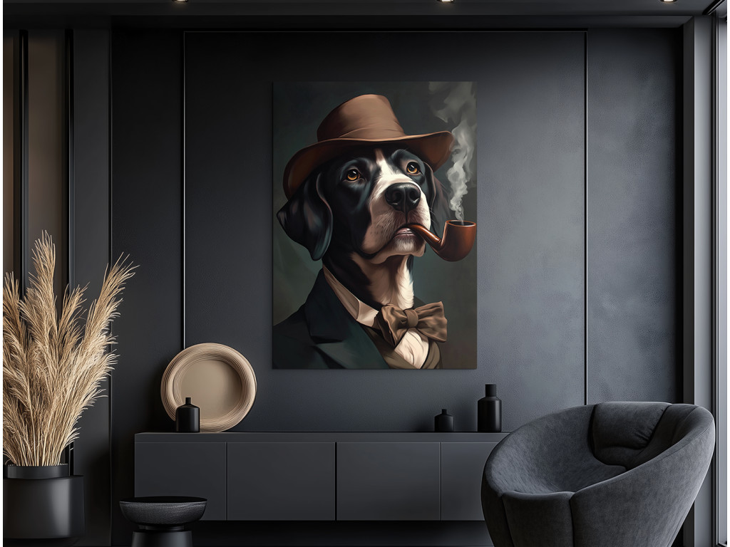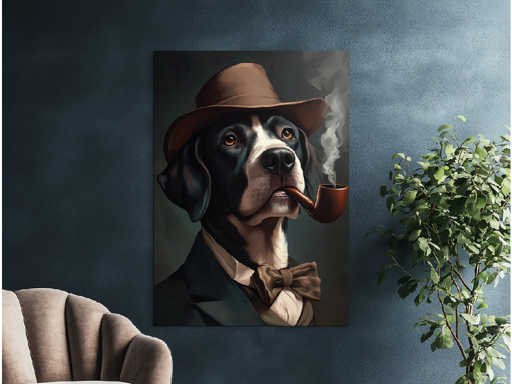Herr Pointer mit Stil ist das Porträt eines Hundes der Rasse English Pointer, der ruhig mit einem Buch und einem Glas Brandy in einem alten englischen Club sitzen könnte. In seinem dunklen Anzug, mit Fliege, Hut und Pfeife im Maul wirkt er wie ein echter Gentleman mit ernstem Gesicht und einem Funken Weisheit – ein ideales Bild für Hundeliebhaber und Liebhaber von Inneneinrichtungen mit Charakter.