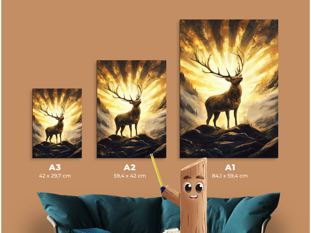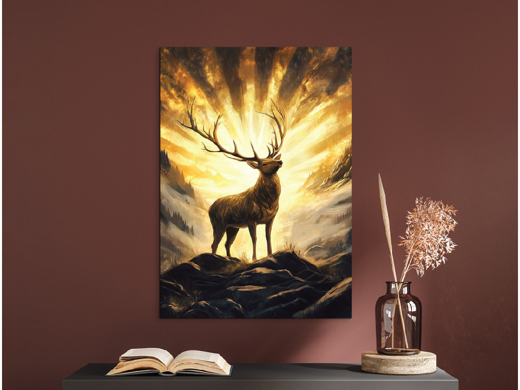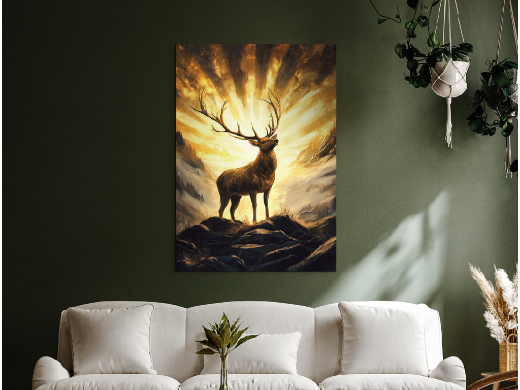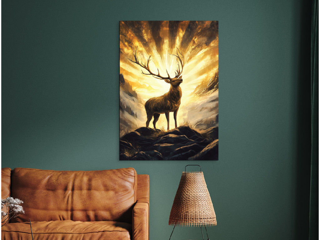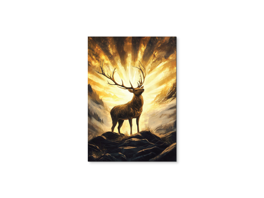Der König der Morgenröte ist ein eindrucksvolles Bild, das einen Hirsch zeigt, der auf einem Felsen über einem Tal steht, das vom goldenen Licht der aufgehenden Sonne überflutet wird. Die orange-gelben Farbtöne im Kontrast zur schwarzen Silhouette schaffen eine dramatische und majestätische Szenerie. Dieses Bild verkörpert Kraft, Stolz und eine stille Verbindung mit der Natur – ideal für einen Raum, in dem Sie die Energie eines Neuanfangs zum Ausdruck bringen oder ein markantes visuelles Element mit tiefer Bedeutung einbringen wollen.