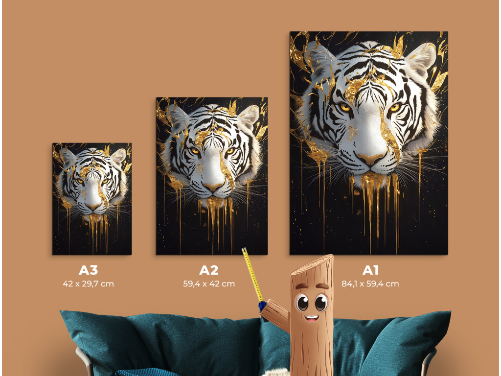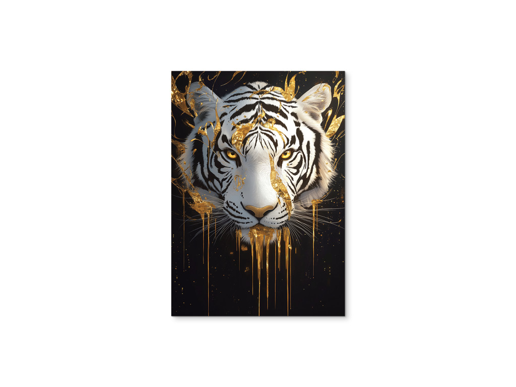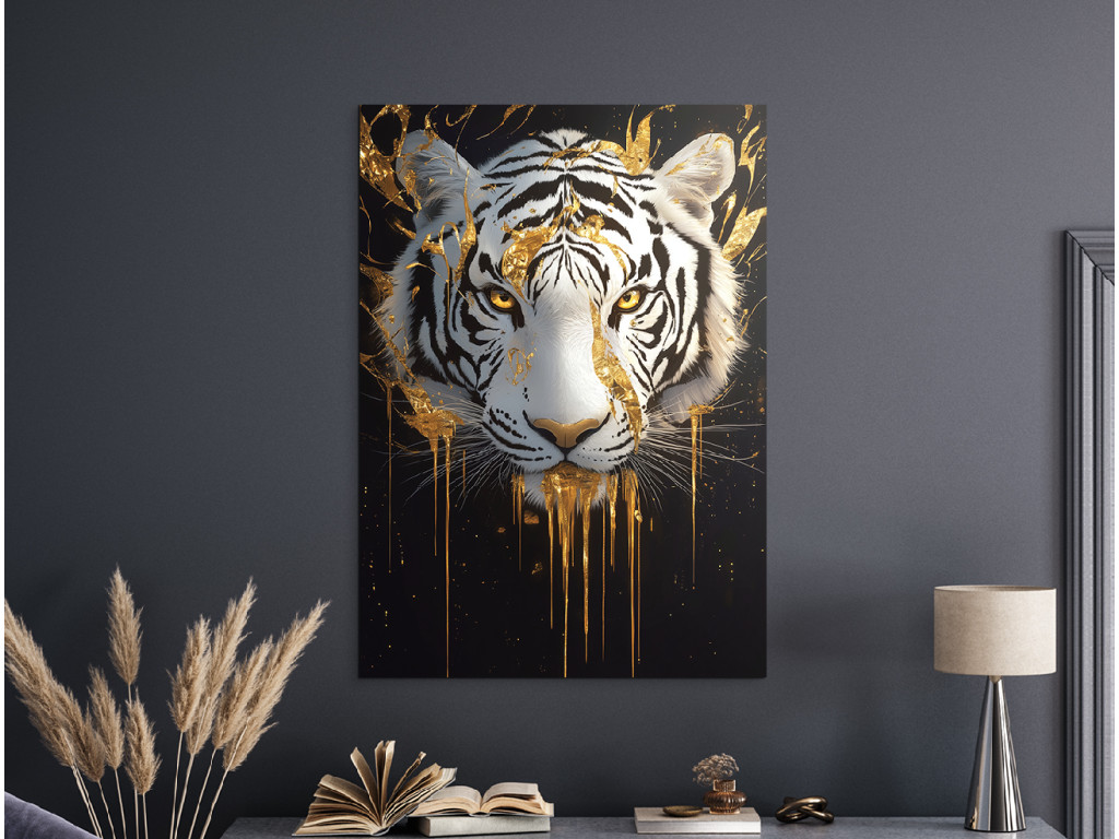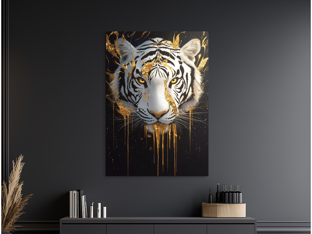 Mit den Augen des weißen Tigers ist ein außergewöhnliches Bild, das Wildheit und Noblesse in einer einzigen Silhouette vereint – dem Kopf eines weißen Tigers. Seine gelben Augen leuchten mit durchdringender Kraft in der Dunkelheit, während goldene Akzente wie flüssiges Metall wirken, das über sein Fell fließt und sich auf dem schwarzen Hintergrund ausbreitet. Der Kontrast zwischen weißem Fell, schwarzen Streifen und metallischen Details vermittelt einen Eindruck von Luxus, Macht und unbewegten Emotionen in Bewegung. Das Bild ist ein idealer Blickfang für Innenräume, die einen außergewöhnlichen visuellen Akzent suchen.
