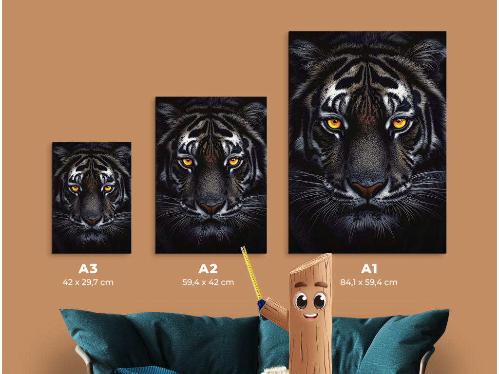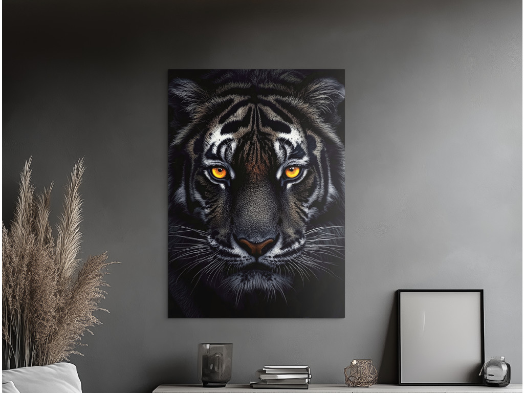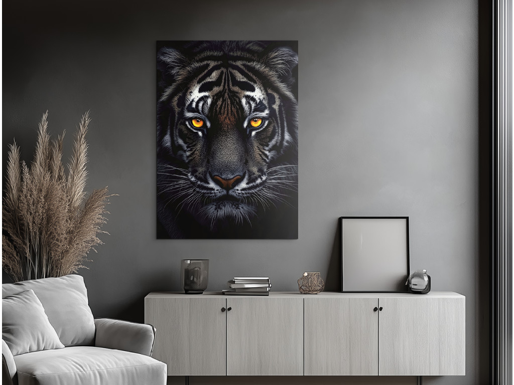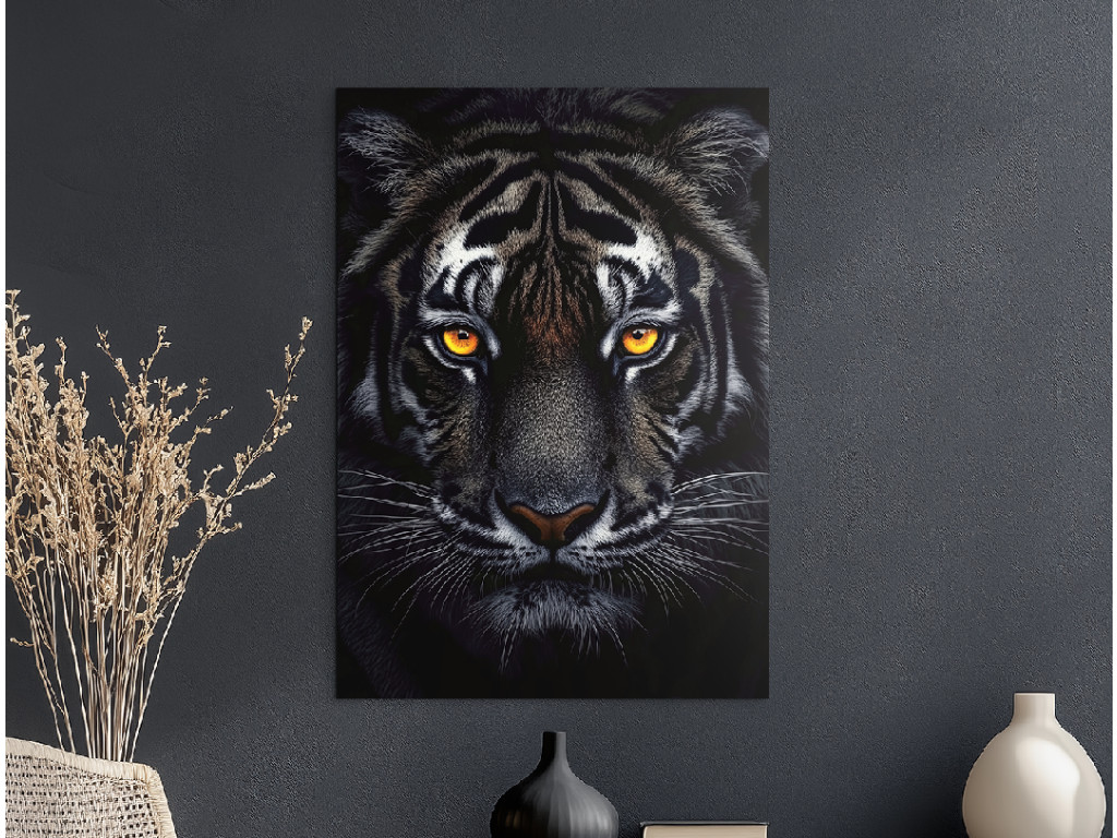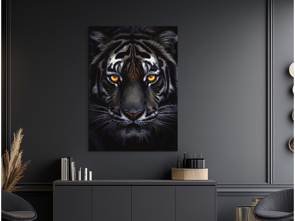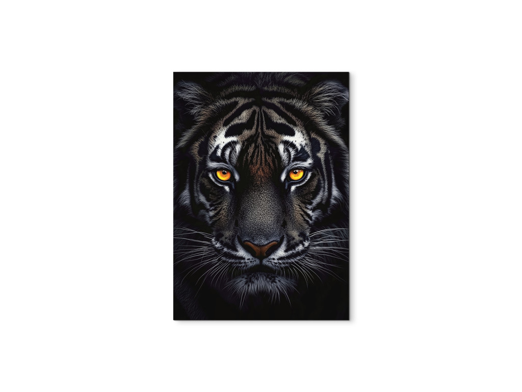Der Schatten des Raubtiers fängt den intensiven Blick des Tigers ein, der sich in der Dunkelheit versteckt. Auf dem Bild sticht nur sein Kopf hervor – getaucht in Schatten, wobei das einzige Licht seine durchdringenden, leuchtenden Augen sind. Die Atmosphäre ist angespannt und hypnotisch, als würde das Raubtier seine Beute in absoluter Stille beobachten. Dieses Bild strahlt Respekt, Kraft und die natürliche Autorität des Tigers aus, geschaffen aus Dunkelheit und Konzentration.