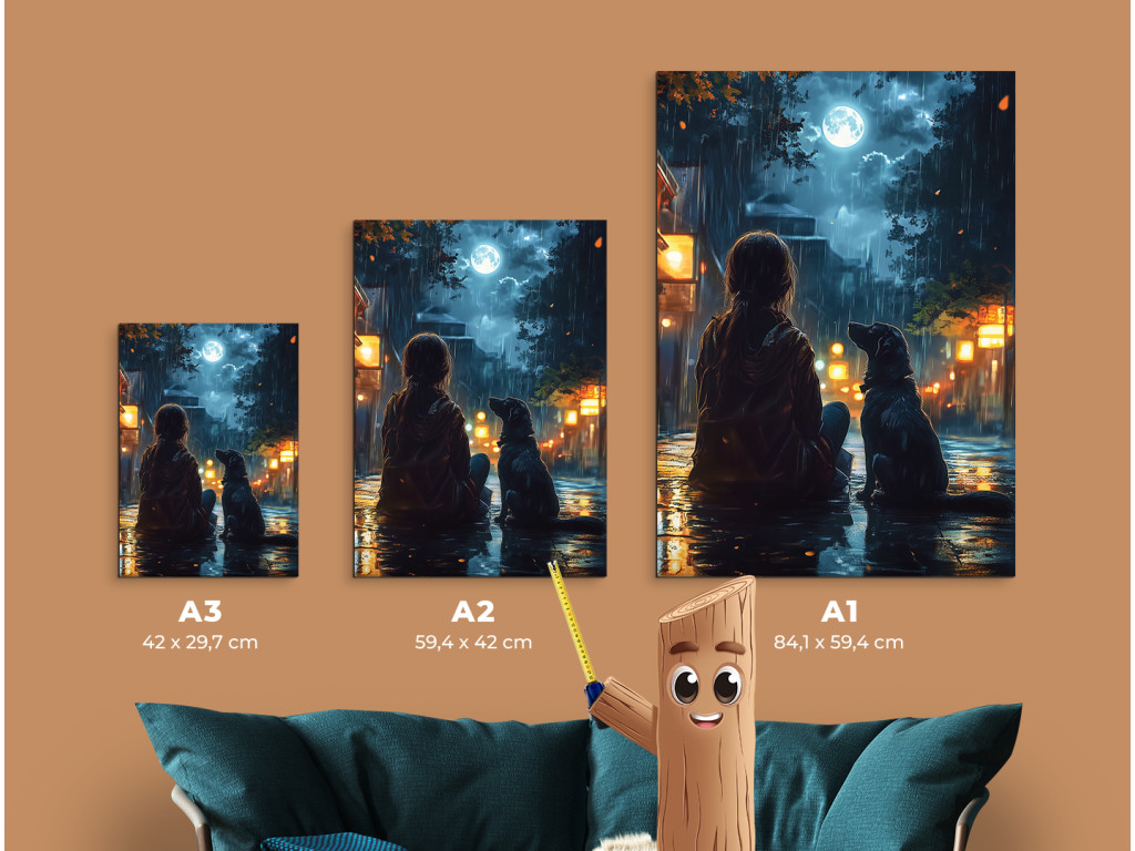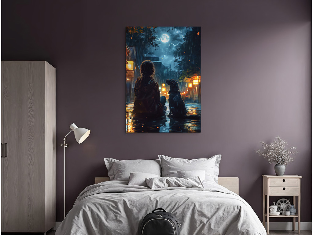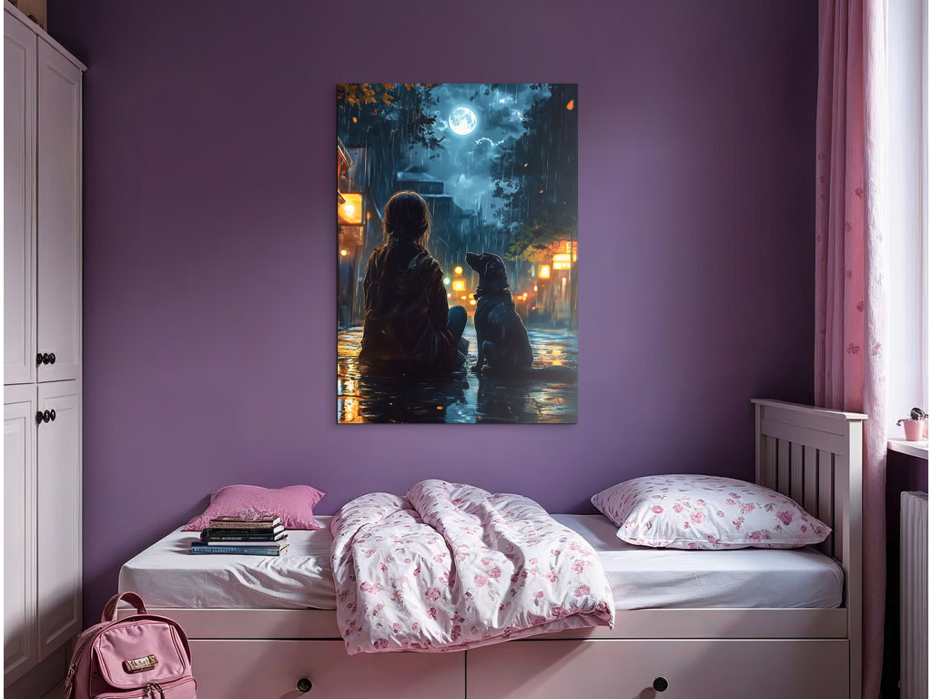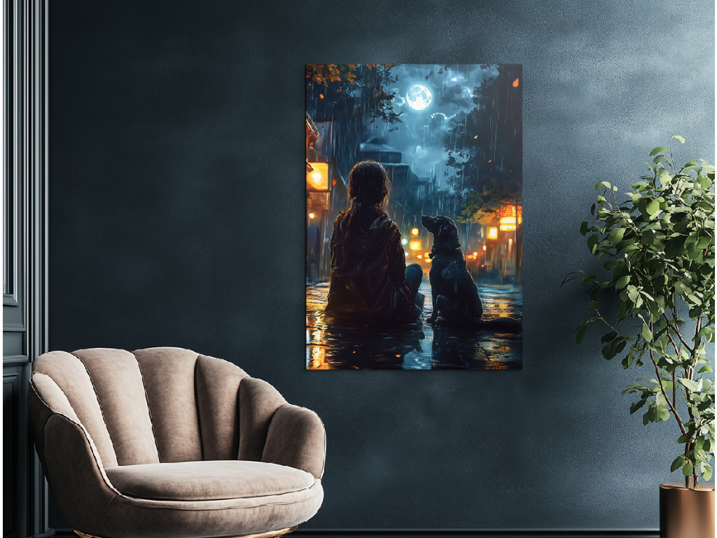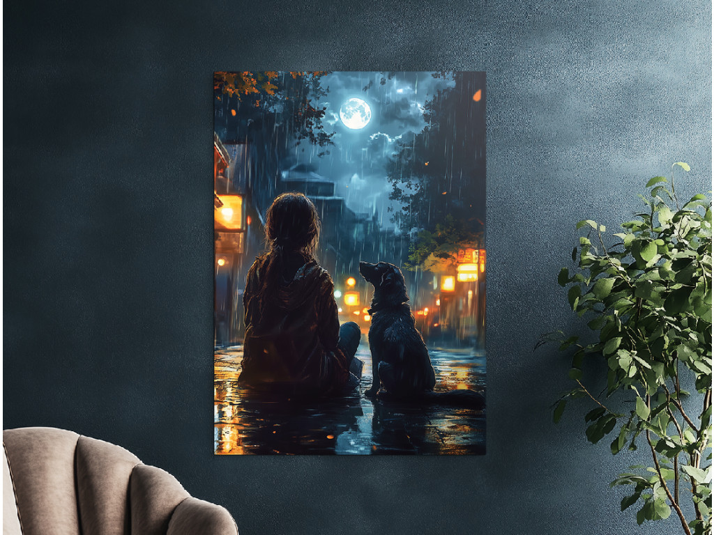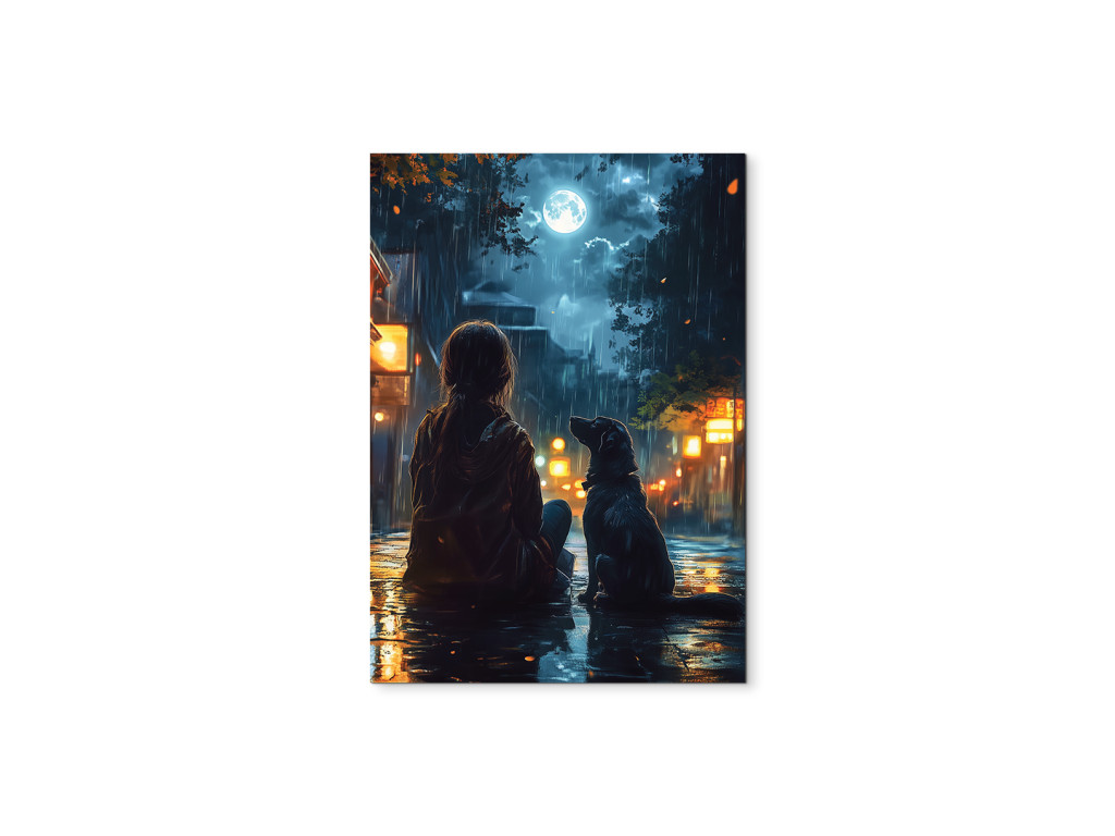 Ein treuer Freund im Regen fängt den intimen Moment eines Mädchens ein, das während eines nächtlichen Regenschauers auf dem nassen Boden sitzt. An ihrer Seite steht ein Hund – ruhig, treu, wie ein treuer Beschützer in der Stille und im Sturm. Die Regentropfen glitzern im Licht der nächtlichen Szene, die Farben sind satt, aber gedämpft, was eine tiefe Atmosphäre der Zusammengehörigkeit, Hoffnung und bedingungslosen Treue schafft. Das Bild spricht ohne Worte – von der Liebe, die auch in den regnerischsten Momenten bestehen bleibt.