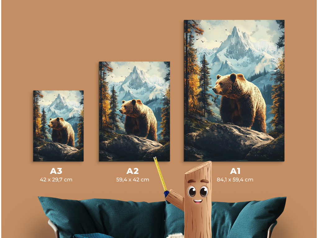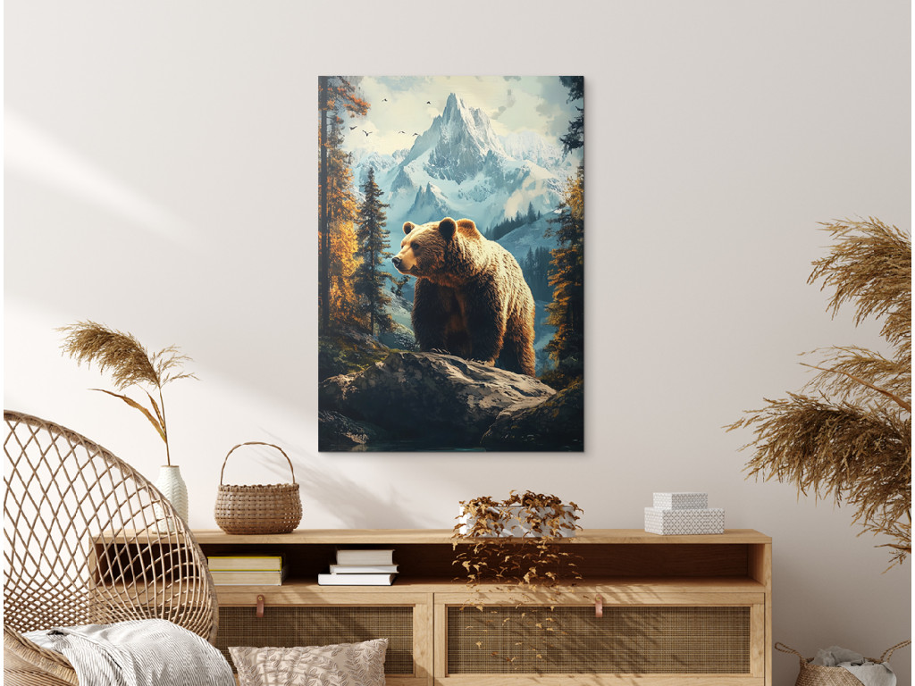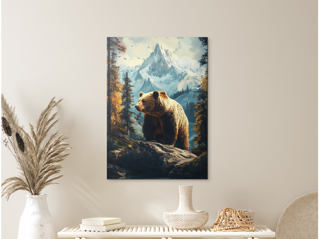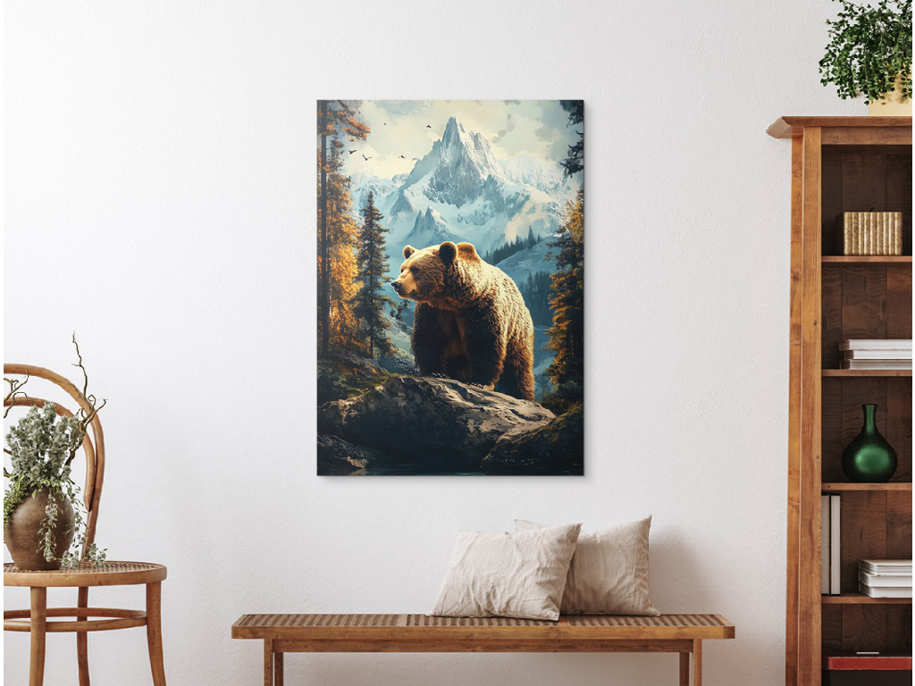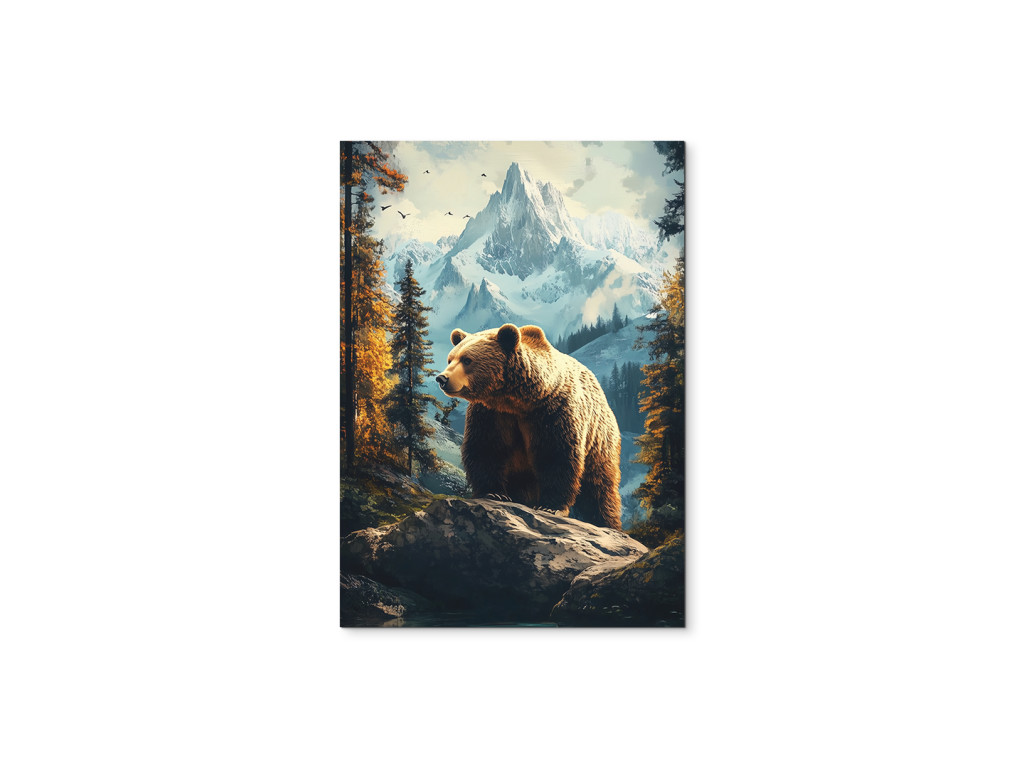 Der Wächter des Tals zeigt einen Braunbären in monumentaler Haltung auf einem Felsvorsprung, umgeben von einer farbenfrohen Waldlandschaft. Im Hintergrund ragen majestätisch schneebedeckte Berge empor, über denen Vögel kreisen, wodurch das gesamte Bild ein tieferes Gefühl von Freiheit und Weite vermittelt. Die Kombination aus Nadel- und Laubbäumen mit herbstlicher Färbung unterstreicht den Übergang in der Natur – zwischen Ruhe und Wildheit. Das Bild wirkt ausgewogen, symbolisch und gleichzeitig natürlich kraftvoll.
