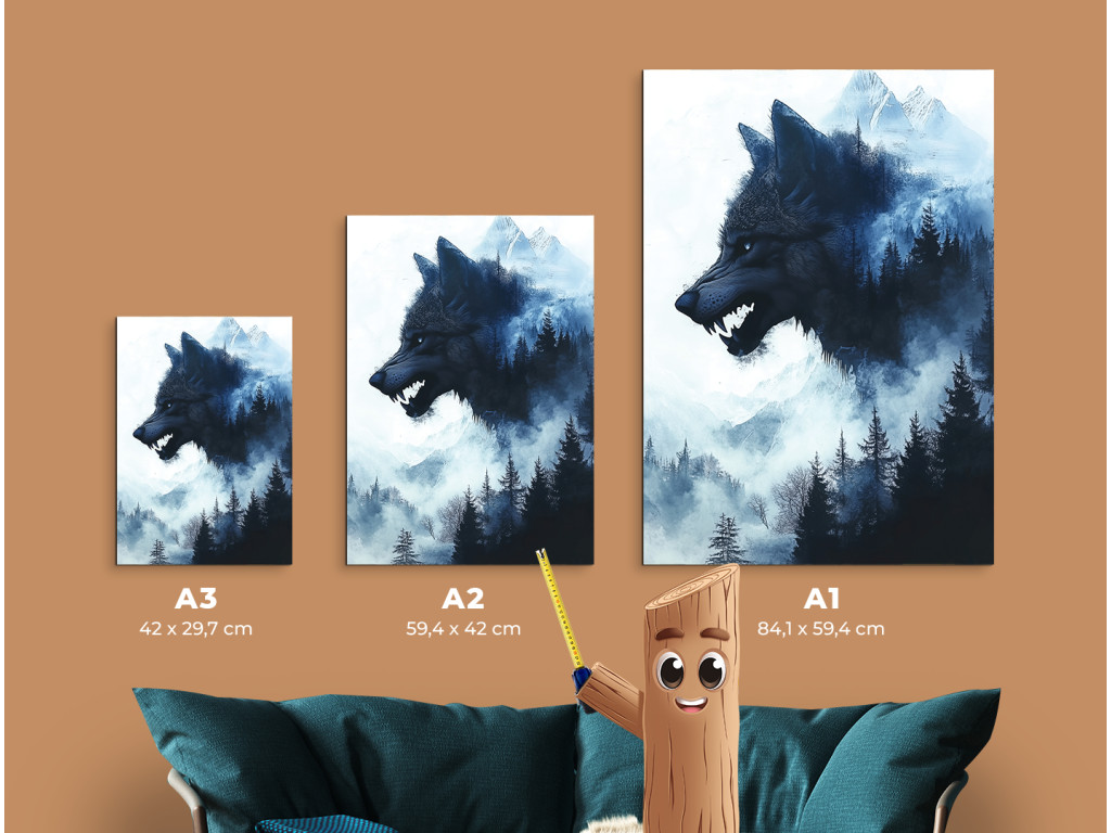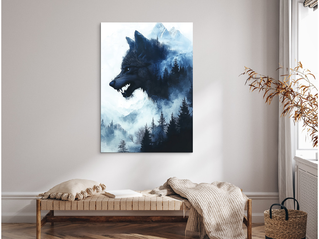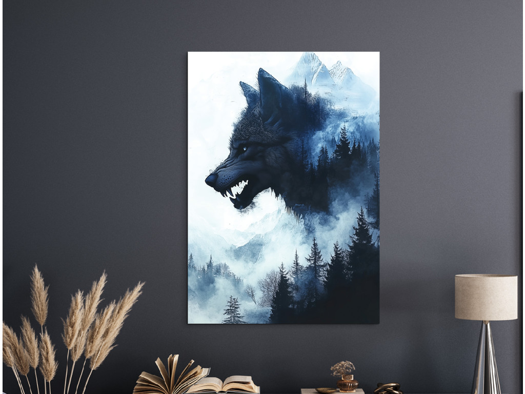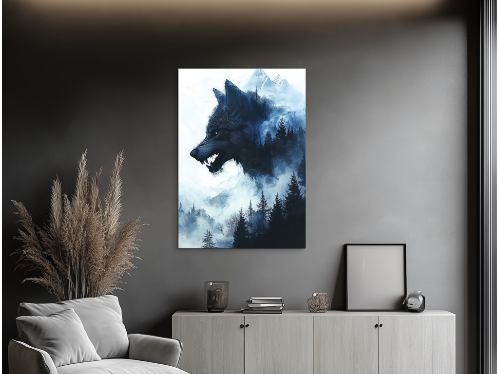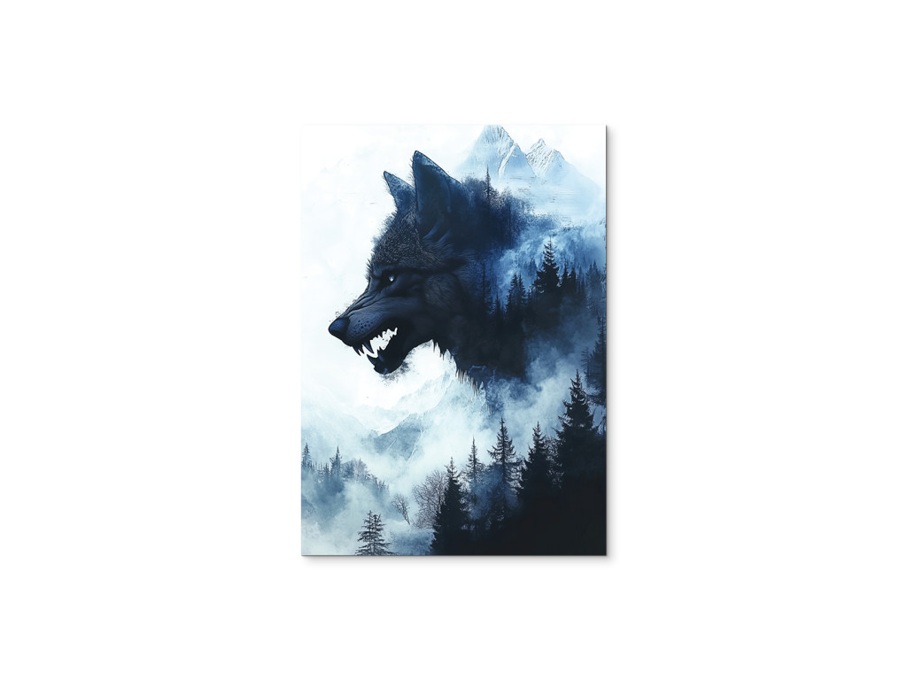 Der Wolfsschatten der Berge ist ein Bild, das die Kraft des Tieres mit der Erhabenheit der Natur verbindet. Der Wolf, im Profil dargestellt mit scharfen Zähnen und leuchtenden Augen, verschmilzt mit den dunklen Silhouetten der Bäume und der nebligen Berglandschaft. Sein Körper verschmilzt mit dem Wald, als wäre er ein Geist, der aus den Bergen auftaucht und gleichzeitig in ihnen verschwindet. Kühle Blau- und Weißtöne schaffen eine Atmosphäre der Stille, des Geheimnisses und des Respekts vor der Wildnis.