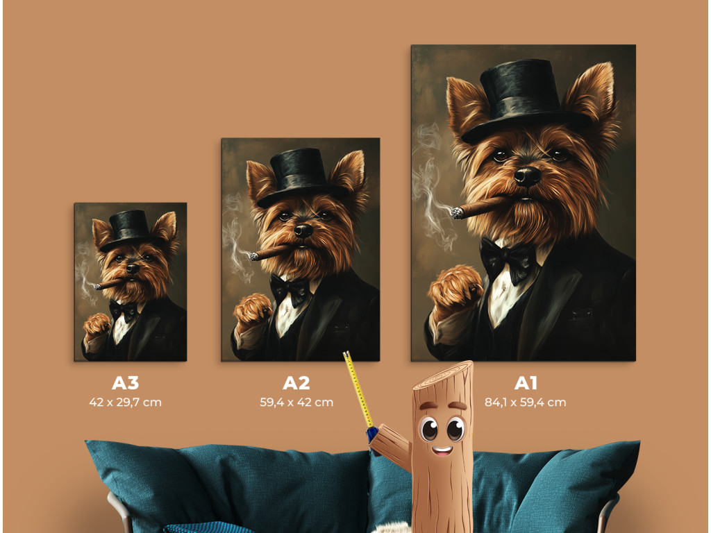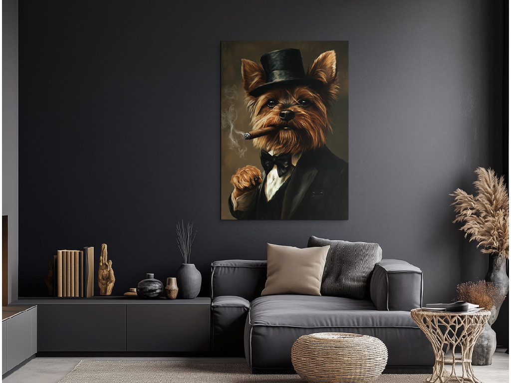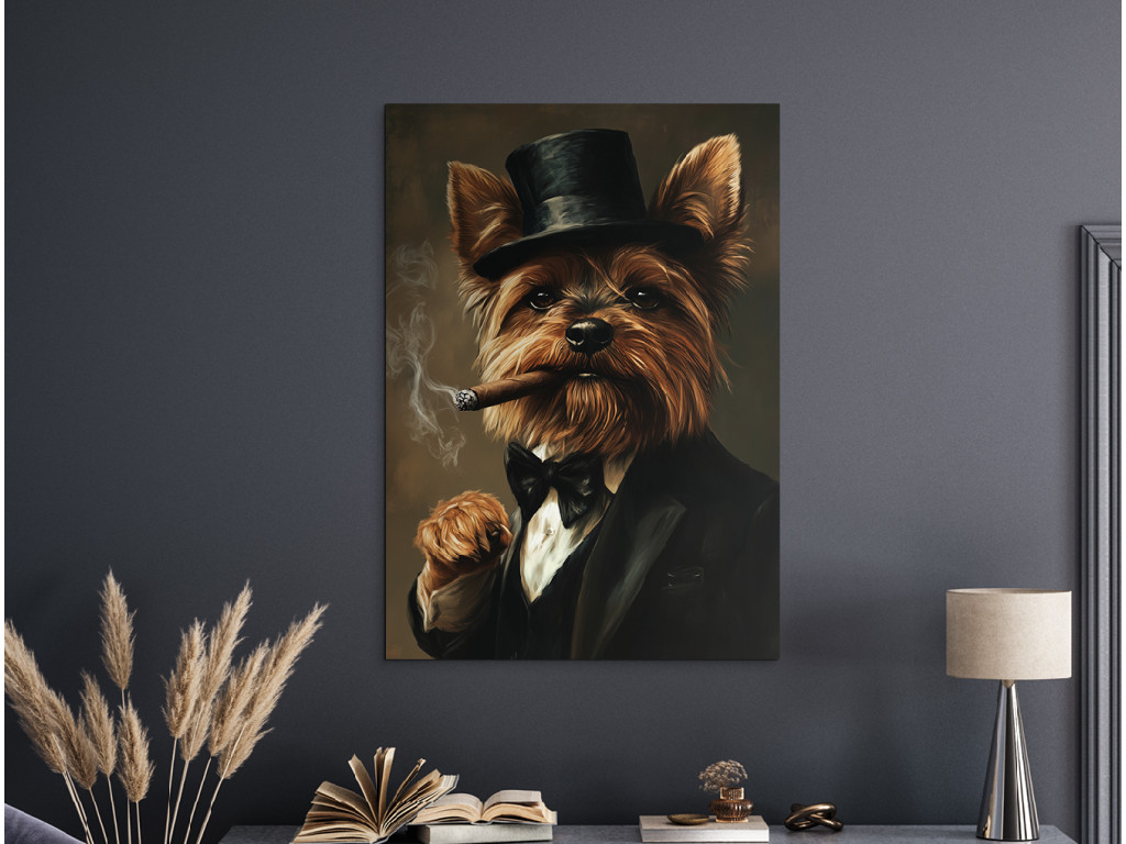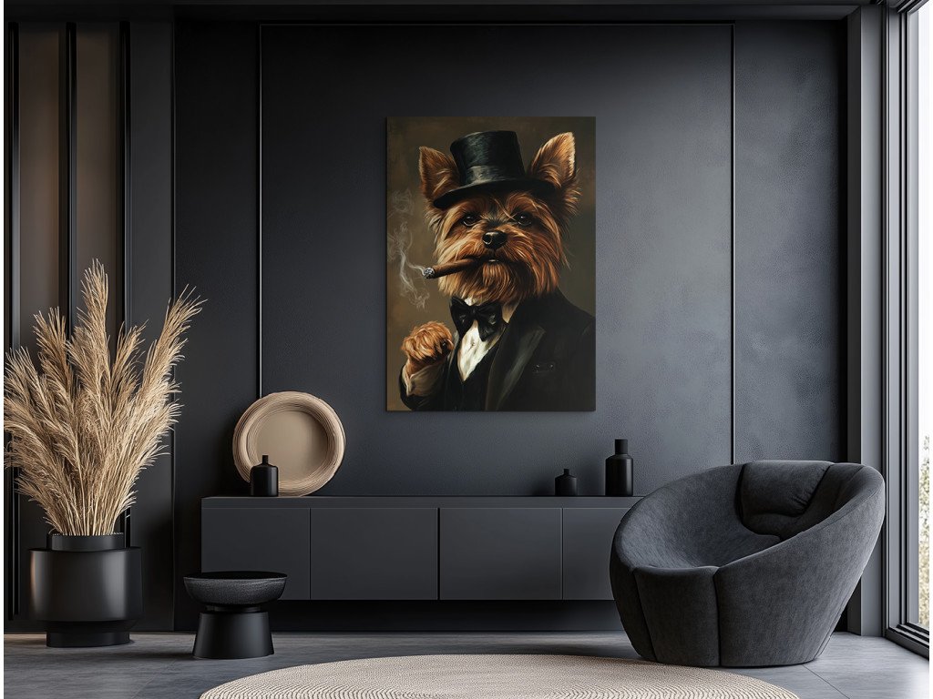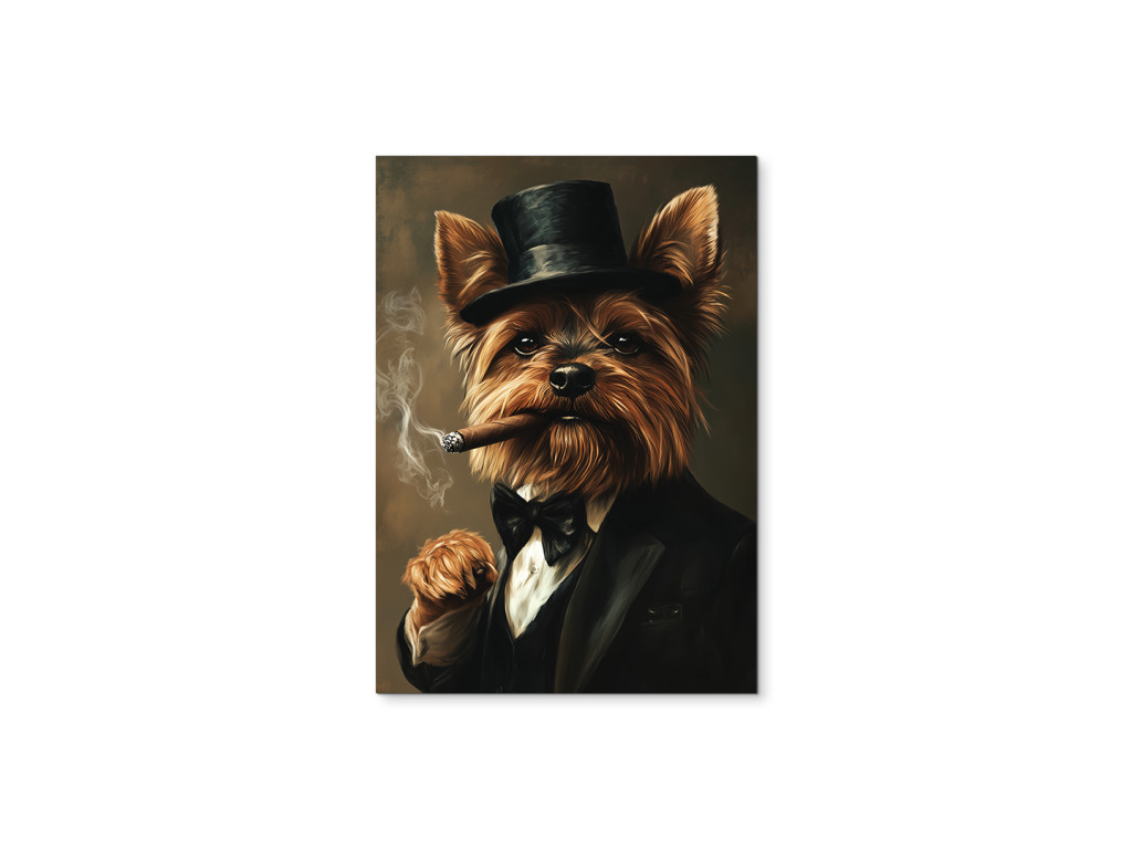 Yorkie aus der Unterwelt ist ein markantes und unterhaltsam provokantes Porträt eines Yorkshire Terriers, der einen schwarzen Anzug mit Fliege und Zylinder trägt. In seinem Maul hält er eine brennende Zigarre, aus der Rauch aufsteigt, was ihm ein elegantes, leicht gangsterhaftes Aussehen voller Selbstbewusstsein verleiht. Der dunkle Hintergrund lässt die starke Persönlichkeit seines kleinen Körpers hervorstechen – ein ideales Bild für alle, die stilvolle Tierporträts mit einer ordentlichen Portion Charakter und Humor lieben.