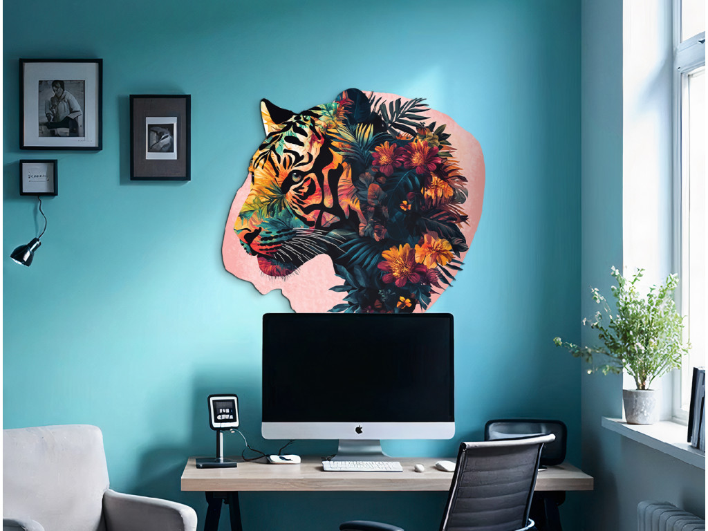 Dieses interessante Bild verbindet die Kraft und Wildheit des Tigers mit der Zartheit pflanzlicher und blumiger Motive. Es symbolisiert das Gleichgewicht zwischen Wildheit und Schönheit der Natur. Es eignet sich als eindrucksvolles visuelles Element für Innenräume, die sowohl Energie als auch Ruhe ausstrahlen sollen.