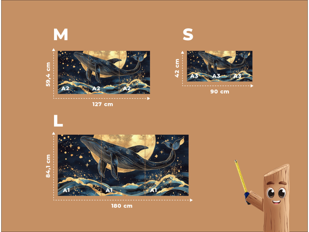 Der nächtliche Tanz des Ozeans ist ein majestätisches dreiteiliges Werk, das einen grandiosen Moment einfängt – den Sprung eines Wals aus den dunklen Wellen des nächtlichen Ozeans direkt unter dem goldenen Vollmond. Die dunkelblaue Meeresoberfläche, der funkelnde Sternenhimmel und die zarten goldenen Reflexe schaffen einen Kontrast zwischen Ruhe und Kraft.