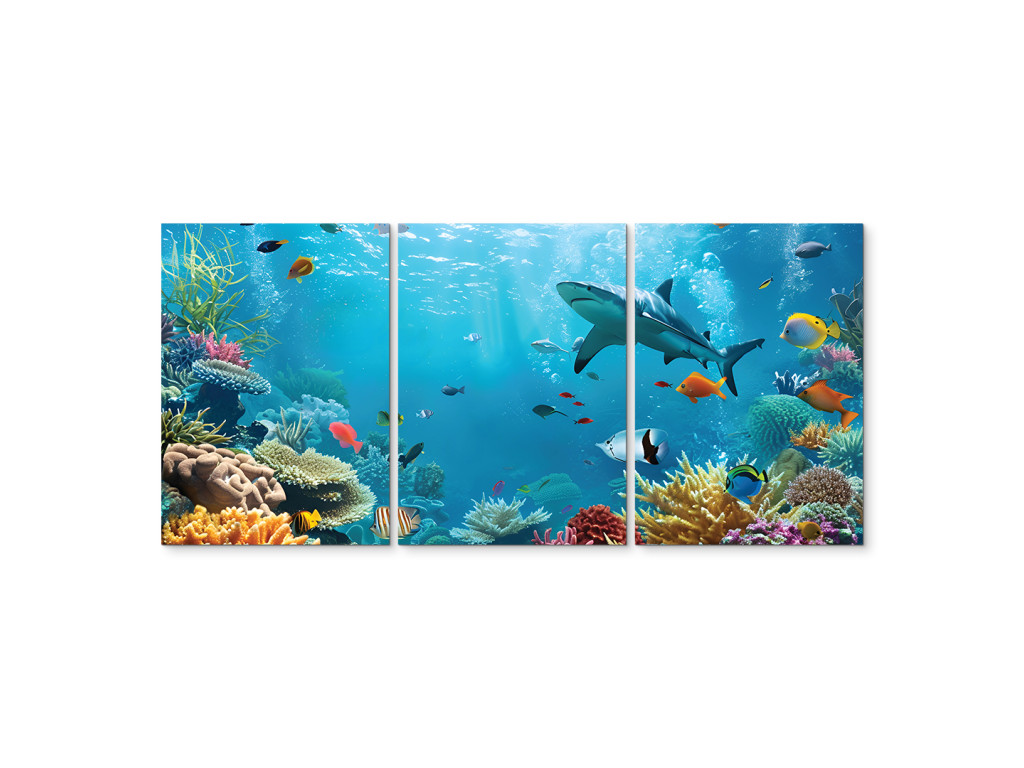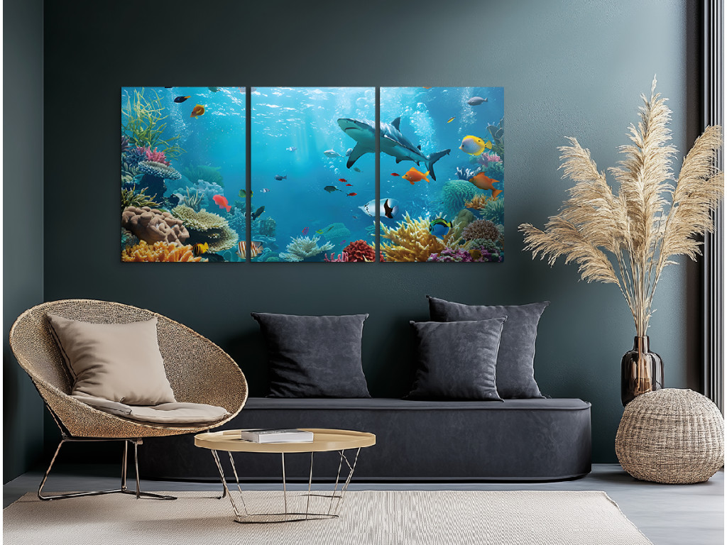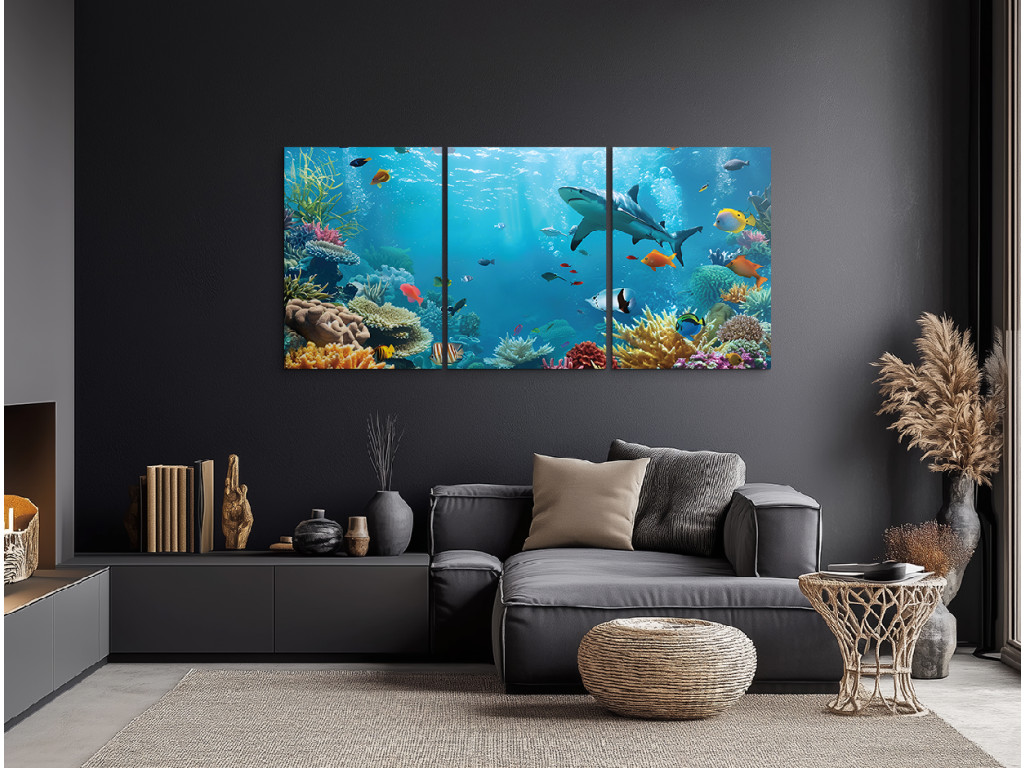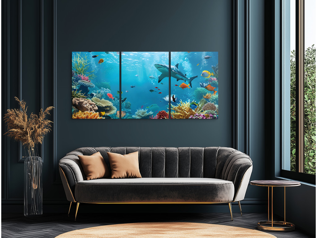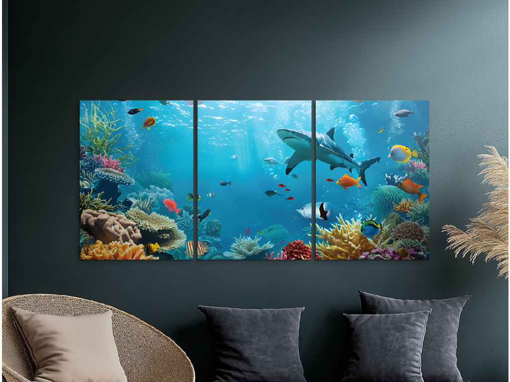 Das ruhige Leben im Meer ist ein dreiteiliges Bild, das Sie in die farbenfrohe Welt unter der Meeresoberfläche entführt. Bunte Fische, elegant schwimmende Haie und Korallen in verschiedenen Formen und Farbtönen bilden eine harmonische Meereslandschaft voller Bewegung und Leben. Das Bild strahlt Ruhe und Ausgeglichenheit aus.