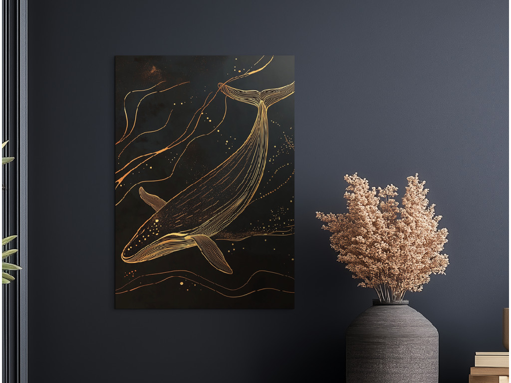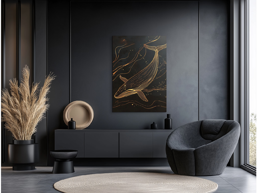 Goldene Tiefe ist ein minimalistisches Bild, das die Silhouette eines Wals aus Gold zeigt, der in der Dunkelheit des Ozeans schwimmt. Der schwarze Hintergrund symbolisiert unendliche Tiefe, während die goldene Linie des Walkörpers Ruhe, Eleganz und Mystik ausstrahlt. Das Bild wirkt klar und doch kraftvoll – eine ideale Ergänzung für ein modernes Interieur, das Ruhe und Symbolik in der Einfachheit sucht.
