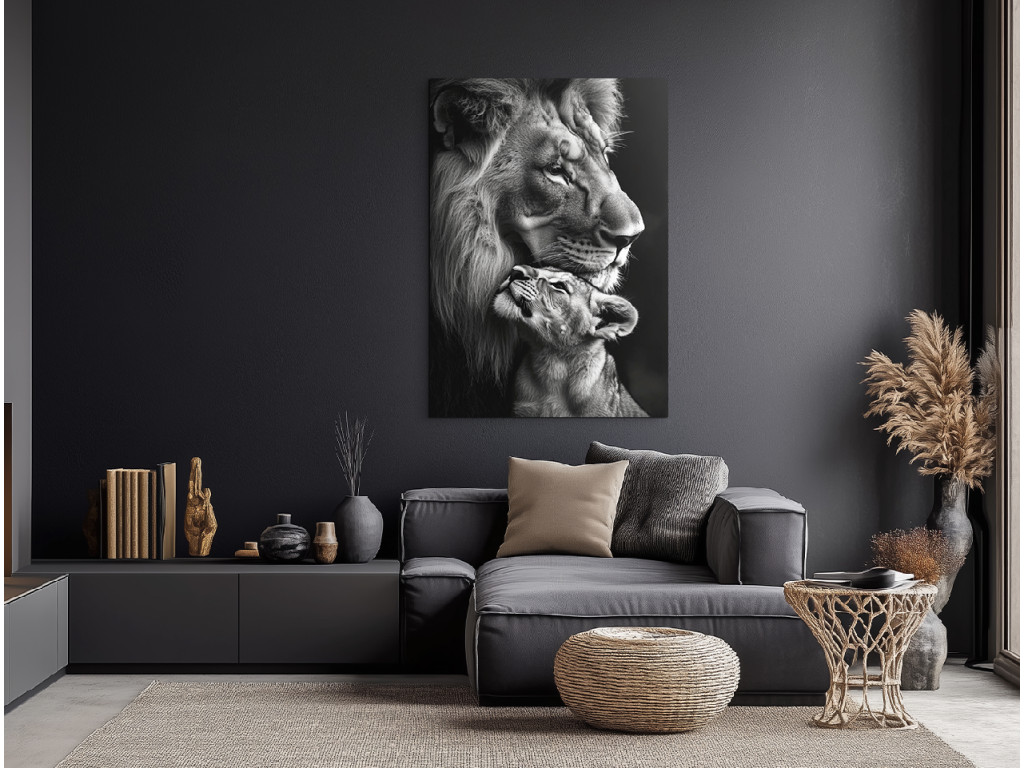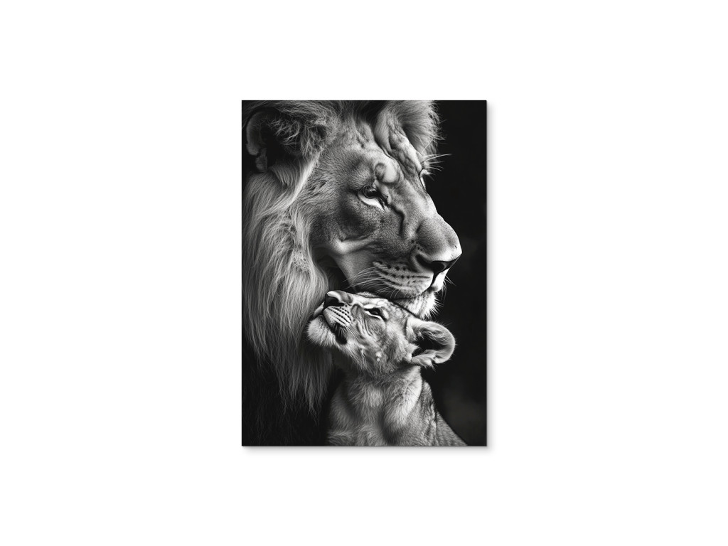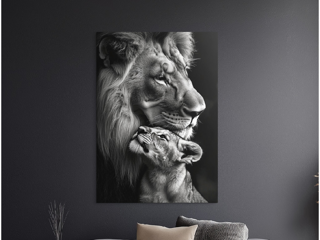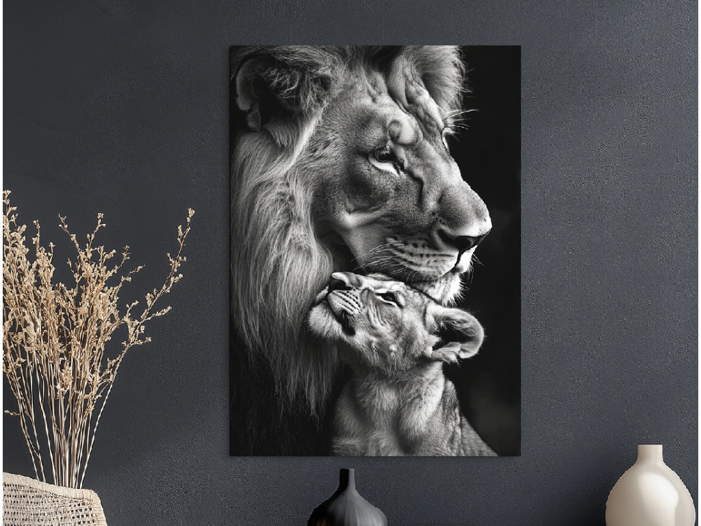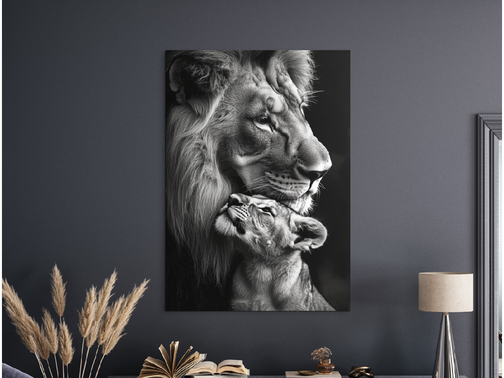 Unter dem Schutz des Löwen ist ein Schwarz-Weiß-Porträt zu sehen, das die starke Bindung zwischen dem Löwen und seinem Jungen zeigt. Der majestätische Löwe blickt ruhig und wachsam geradeaus, während das Junge ihn mit Vertrauen und Bewunderung ansieht. Die Details des Fells, der Augen und des Ausdrucks kommen durch den Kontrast von Licht und Schatten besonders gut zur Geltung, wodurch das Bild sowohl kraftvoll als auch intim wirkt. Das Werk strahlt Respekt, Geborgenheit und eine tiefe Verbundenheit aus, die jeden Liebhaber der Natur, der Familie und der Stille in der Kraft anspricht.