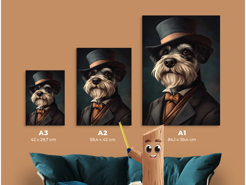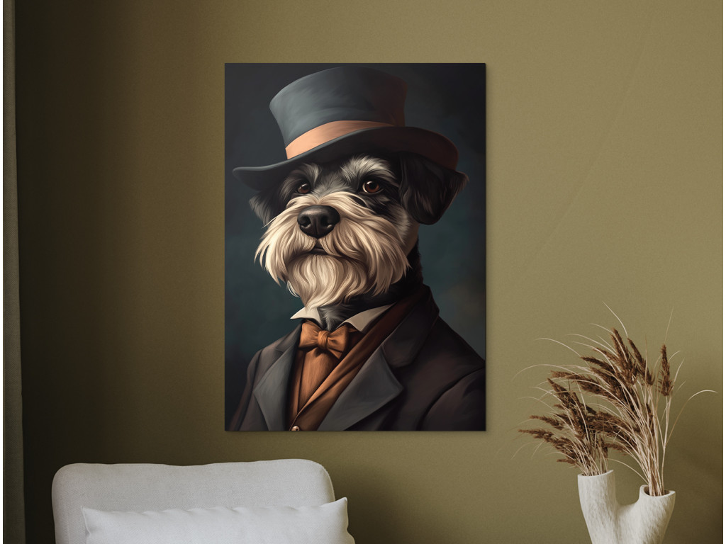 Der bärtige Aristokrat ist ein einzigartiges Porträt, das einen charismatischen Schnauzer in einem Anzug mit Zylinder und Fliege zeigt. Sein typisches bärtiges Gesicht und sein würdevoller Ausdruck passen perfekt zu seiner eleganten Kleidung und schaffen ein Bild voller Noblesse und feinem Humor. Geeignet für Hundeliebhaber, insbesondere der Rasse Schnauzer, oder als stilvolle und originelle Ergänzung zu einem modernen Ambiente mit Weitblick.