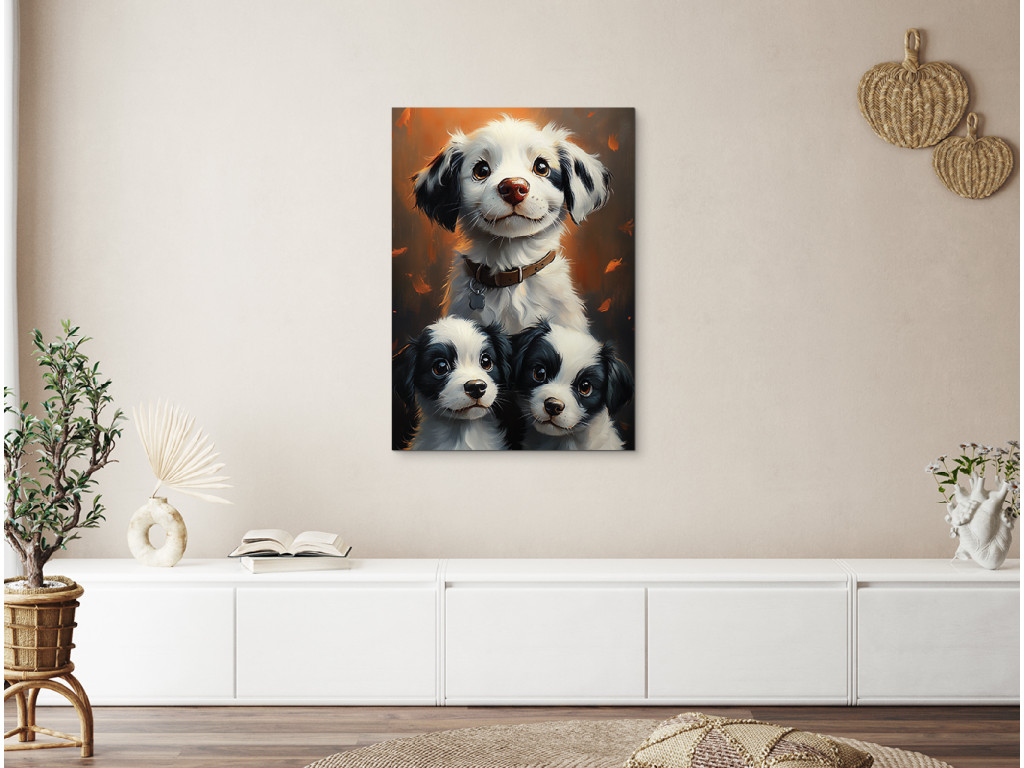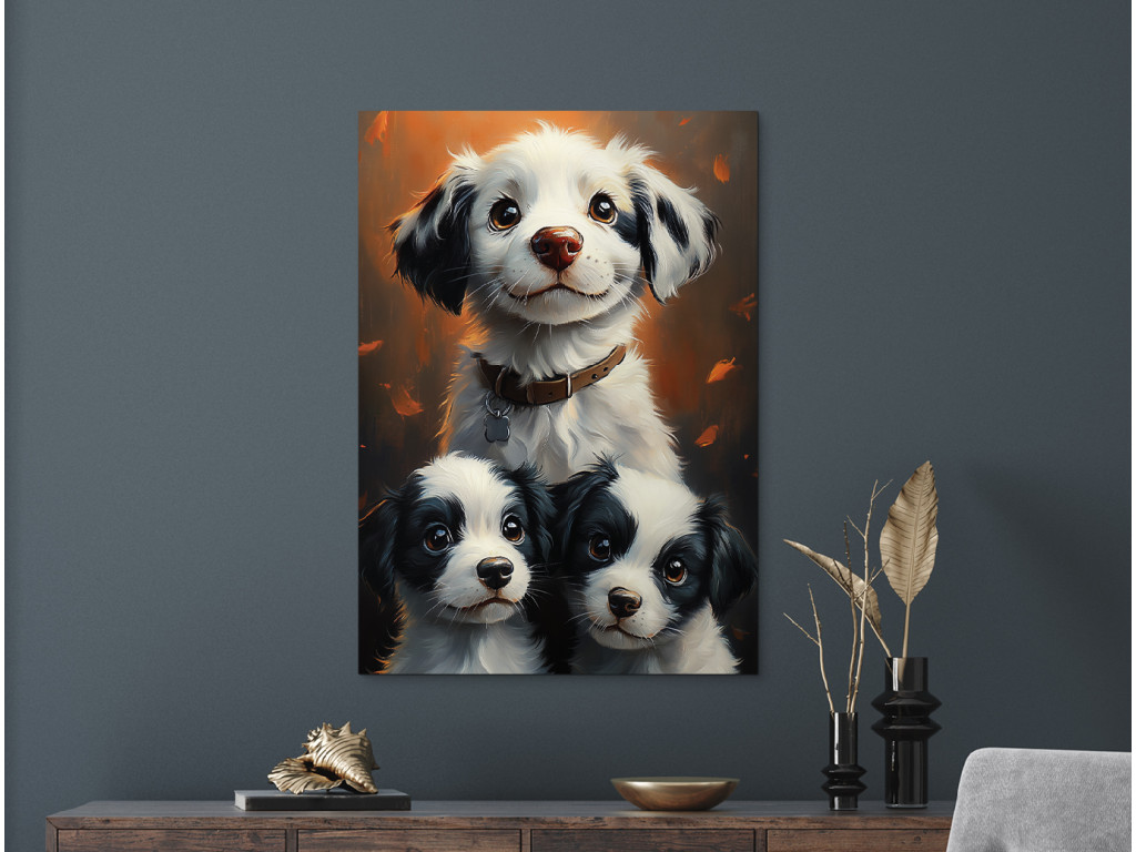Glückliches Rudel ist ein fröhliches und warmherziges Bild, das eine Hündin mit glücklichem Gesichtsausdruck und ihre beiden verspielten Welpen zeigt. Es wirkt wie ein Moment der Freude, Ruhe und familiären Harmonie in Hundegestalt – ideal für Tierliebhaber. Dieses Bild belebt auf schöne Weise ein Kinderzimmer, einen Flur, eine Tierarztpraxis oder jeden anderen Raum, in dem ein Lächeln und gute Laune herrschen sollen.