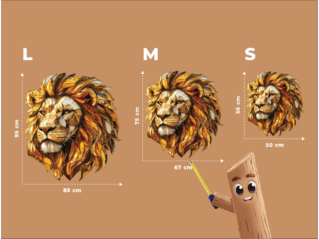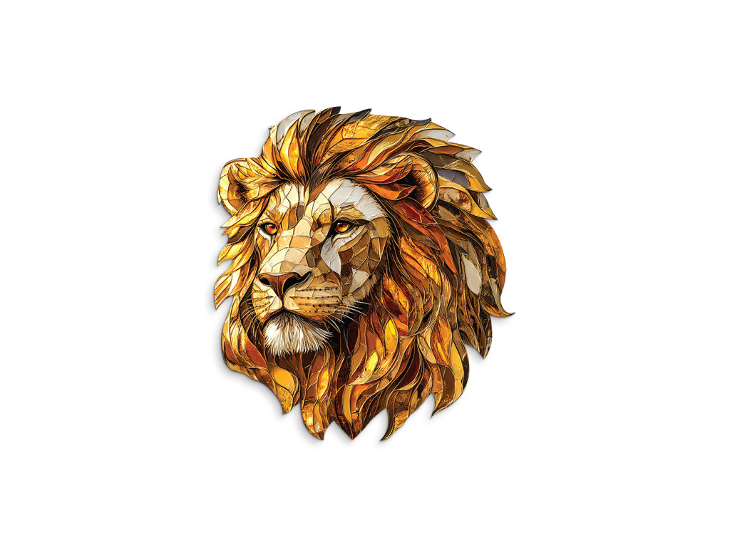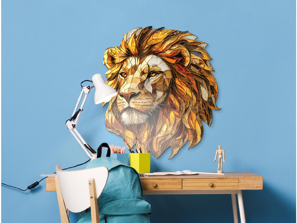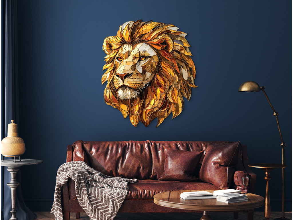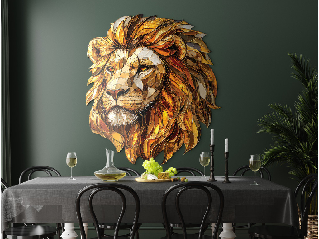 Das dekorative Wandbild zeigt einen Löwenkopf als Mosaik, wobei die einzelnen Elemente der Mähne in Gold- und Orangetönen einen reichhaltigen, mehrschichtigen Effekt erzeugen. Die Textur und Farbgebung unterstreichen die Erhabenheit des Löwen und verleihen dem Ambiente einen markanten, künstlerischen Akzent mit einem Hauch von Kraft und Eleganz.
