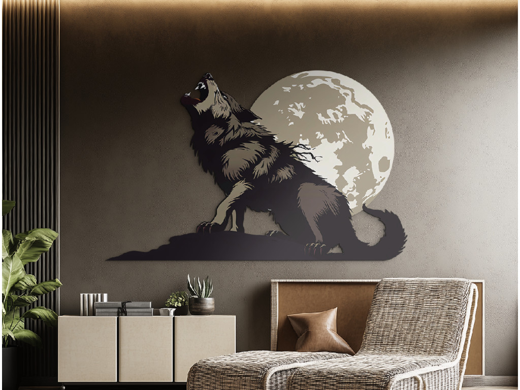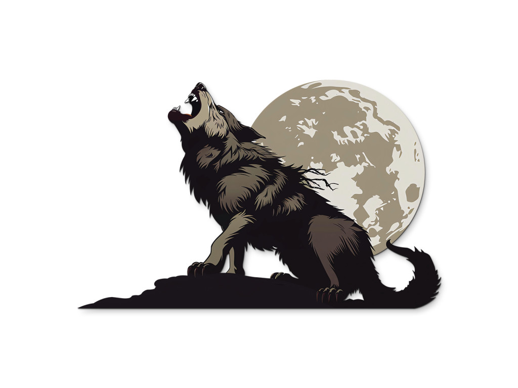 Das stilisierte Bild zeigt einen Wolf, der einen riesigen Mond anheult. Die dunklen Farbtöne des Fells und die dynamischen Linien drücken Kraft, Spannung und die wilde Schönheit des Augenblicks aus. Das visuell starke Motiv evoziert Freiheit, Einsamkeit und die uralte Verbindung zwischen der Natur und der Nacht.