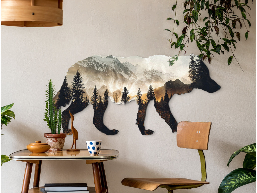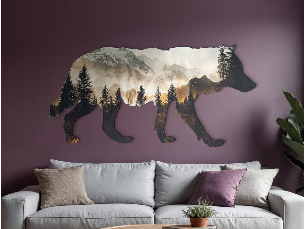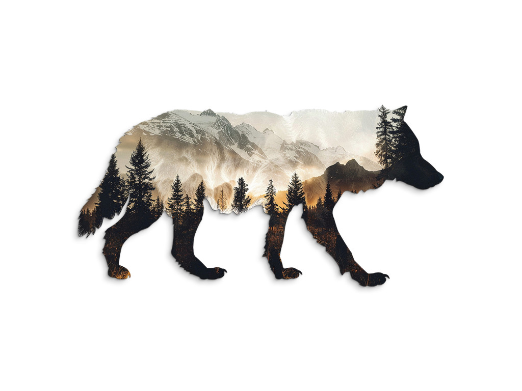 Die künstlerische Illustration zeigt die Silhouette eines Wolfes, in der sich eine Berglandschaft mit dichten Wäldern und schneebedeckten Gipfeln widerspiegelt. Das Bild erzeugt einen beeindruckenden visuellen Effekt, der die Kraft und Wildheit des Wolfes mit dem Majestat der Natur verbindet. Dieses Bild vermittelt ein Gefühl von Freiheit, der Stille der Wildnis und der Verbundenheit des Tieres mit seiner natürlichen Umgebung.