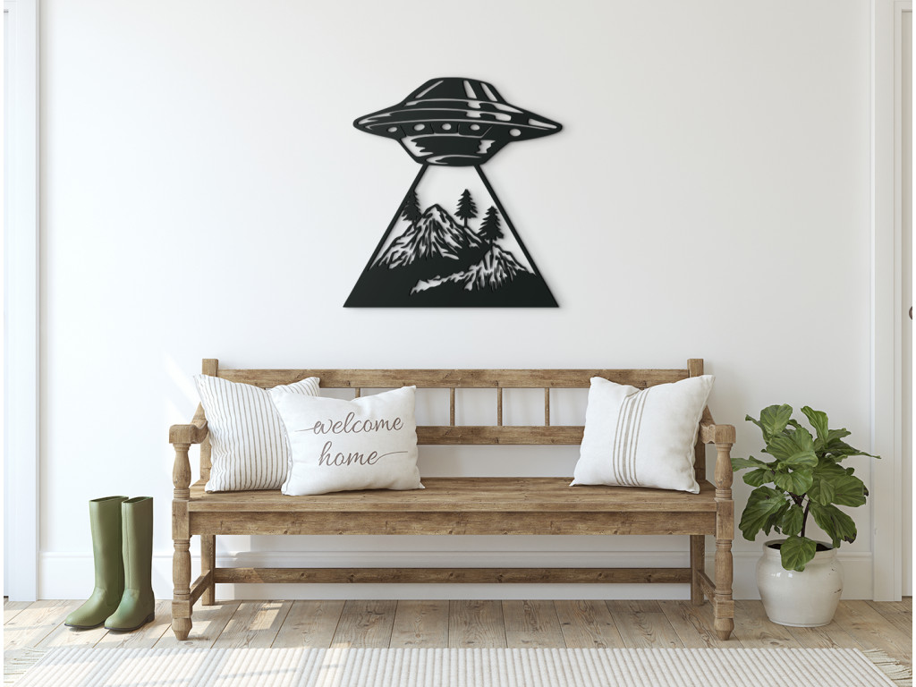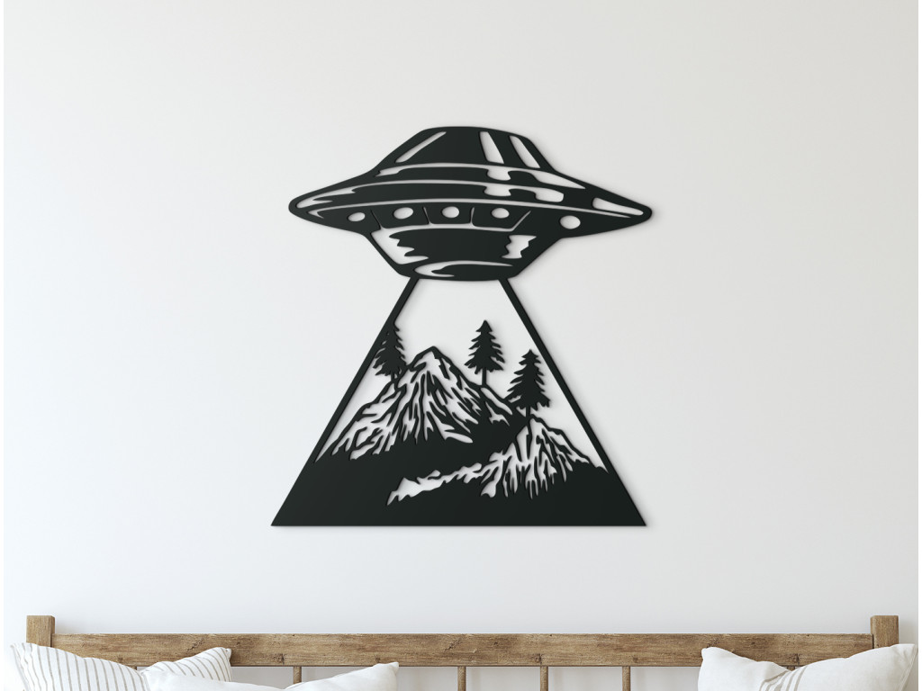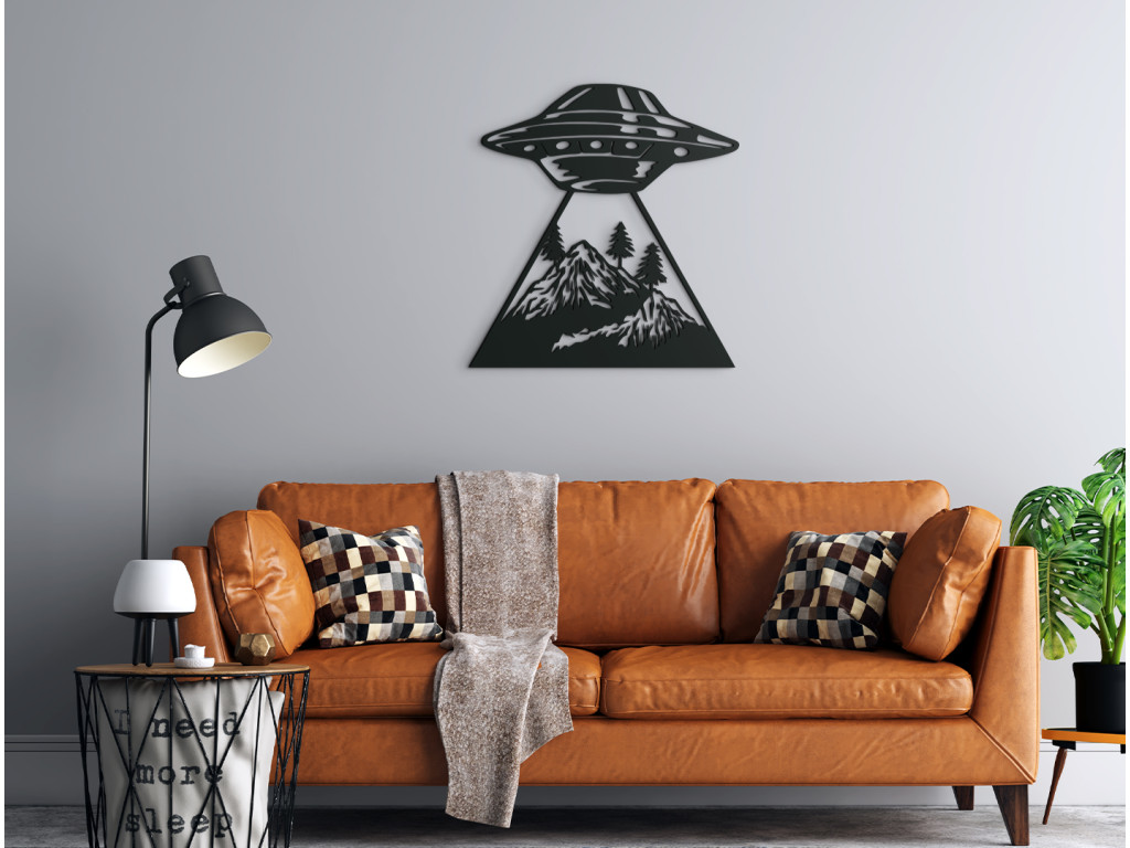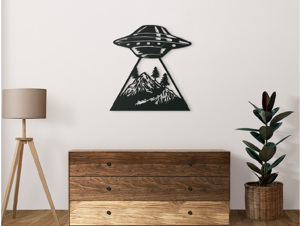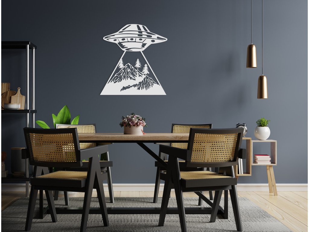 Diese originelle UFO-Dekoration wird garantiert zum Blickfang. Das fliegende UFO können Sie in fast allen Räumen anbringen, auch im Kinderzimmer. Der Holzsticker macht sich gut über dem Bett, dem Tisch oder der Kommode. Das Holzbild verschönert einfach jedes Zimmer.