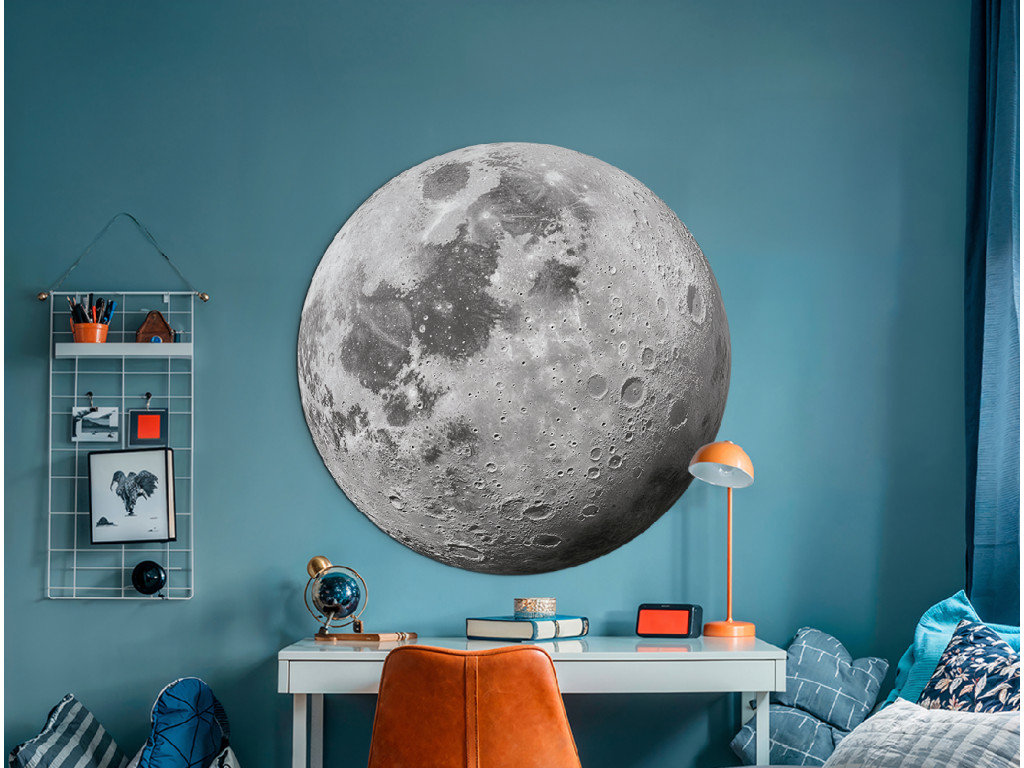 Diese beeindruckende Wanddekoration zeigt realistische Details des Mondes mit sichtbaren Kratern und Oberflächenstrukturen. Die sanften Grautöne sorgen für einen natürlichen Eindruck, wodurch sich die Dekoration sowohl für Kinderzimmer als auch für moderne Innenräume eignet. Die ideale Wahl für Liebhaber des Weltraums, der Ästhetik und einer ruhigen Atmosphäre.