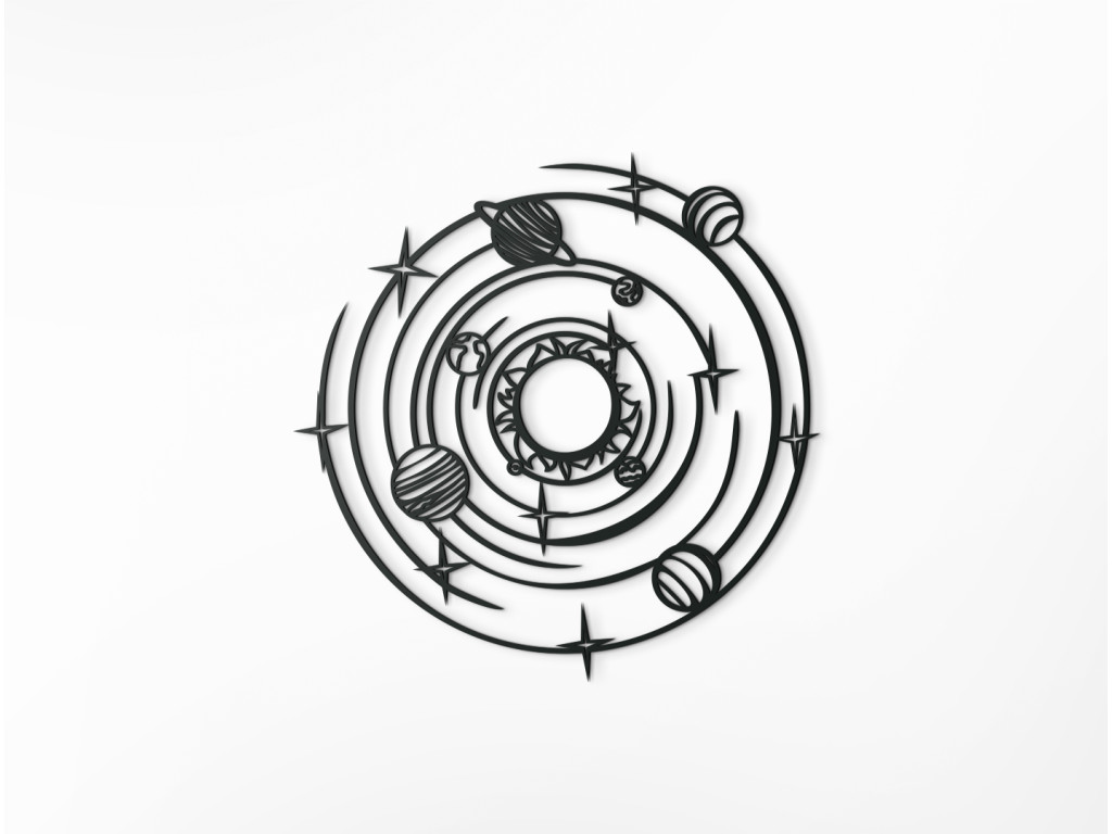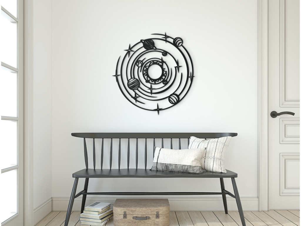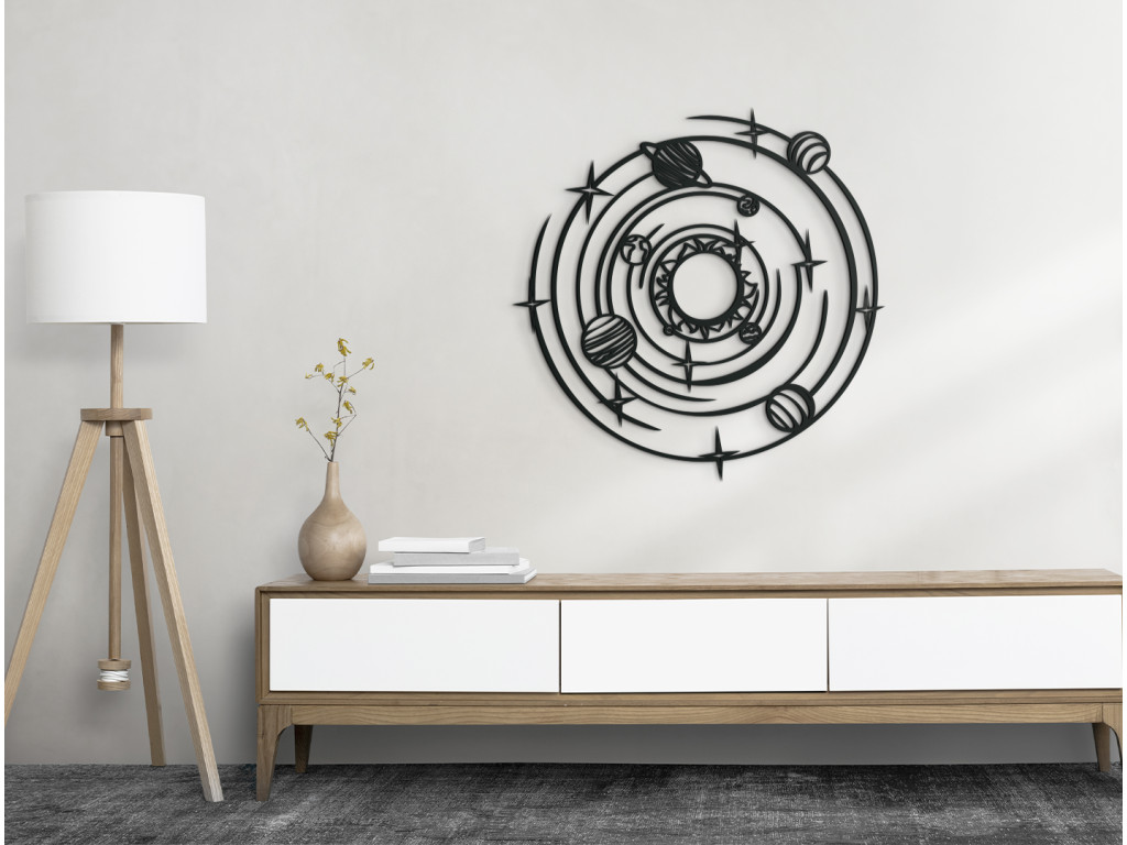 Das Holzbild Sonnensystem wird in Innenräumen zum Blickfang. Der Holzsticker passt in jeden modernen Raum und macht sich zum Beispiel über einem Bett, einem Tisch oder einer Kommode gut.