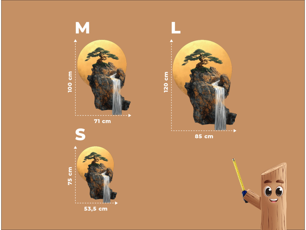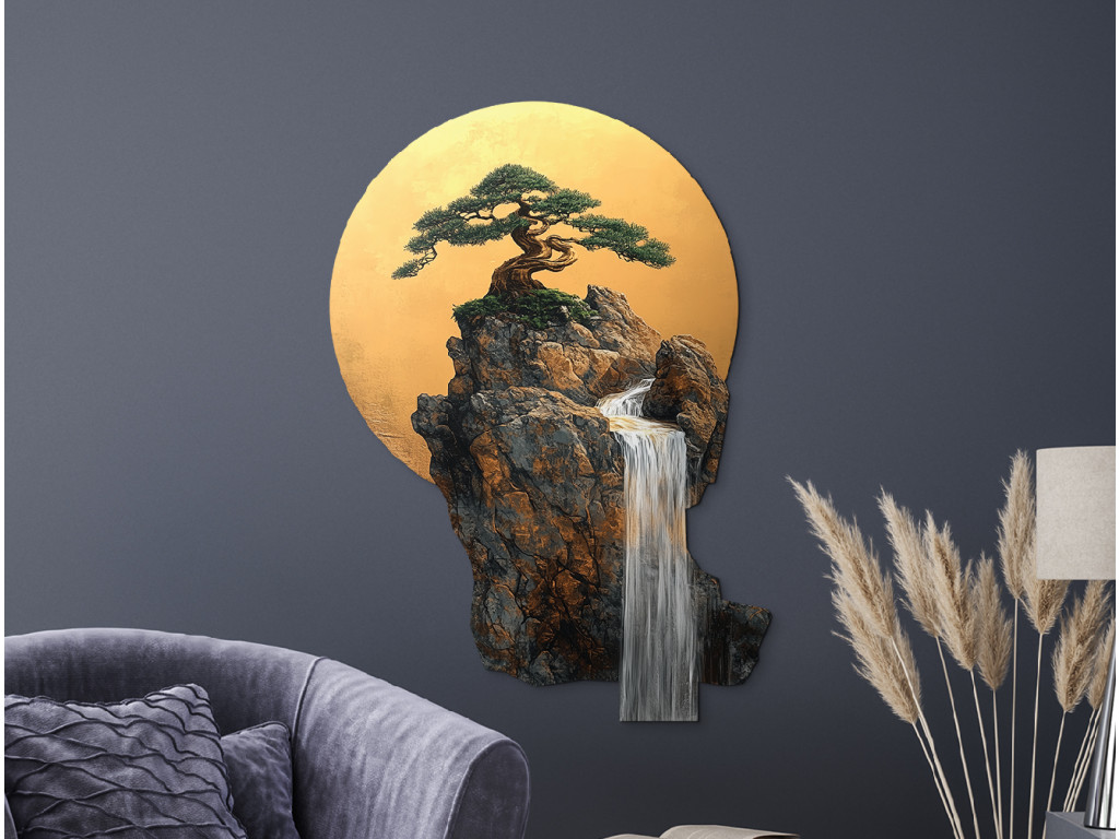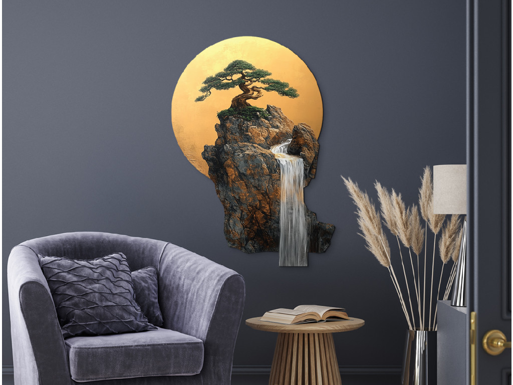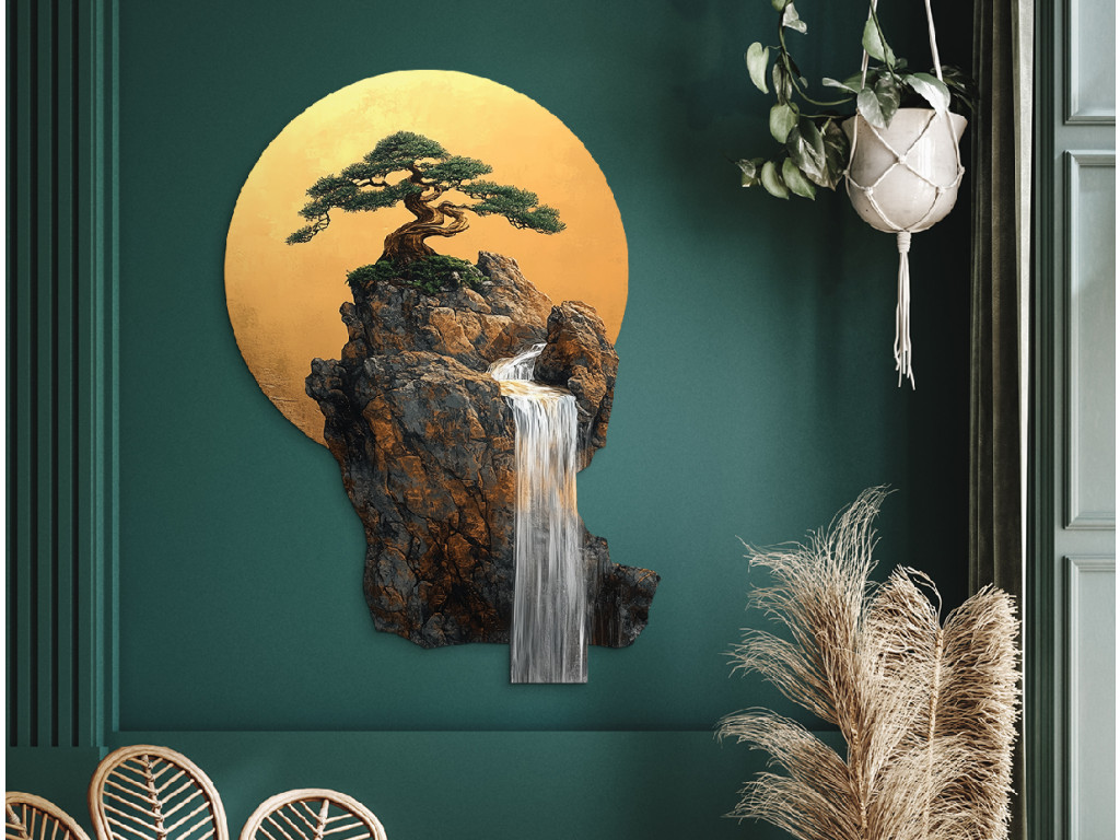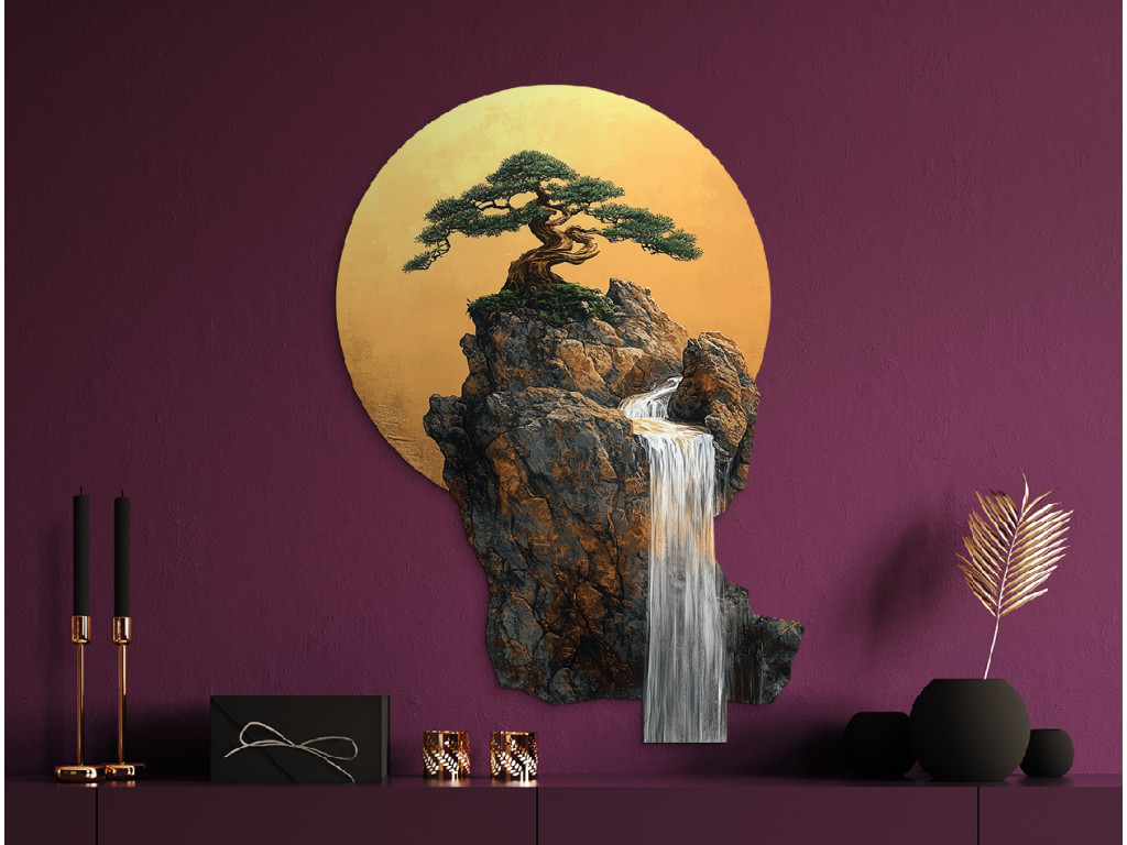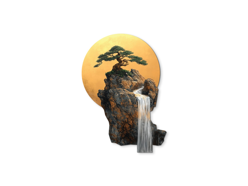 Der Bonsai-Baum auf einem Felsvorsprung wirkt wie ein Symbol für Ausdauer und Ausgeglichenheit. Hinter ihm strahlt ein goldener Kreis, der an die Sonne oder den Mond erinnert und die harmonische Komposition vervollständigt. Der herabfließende Wasserfall verleiht dem Bild eine ruhige, meditative Note und visuelle Tiefe.