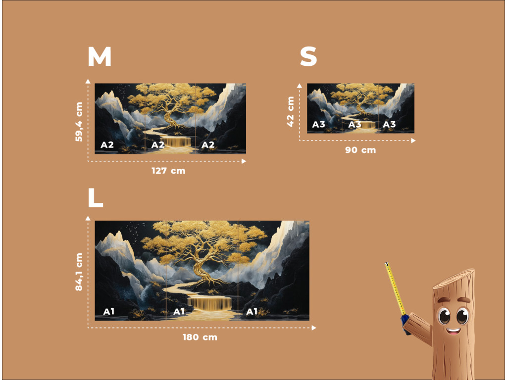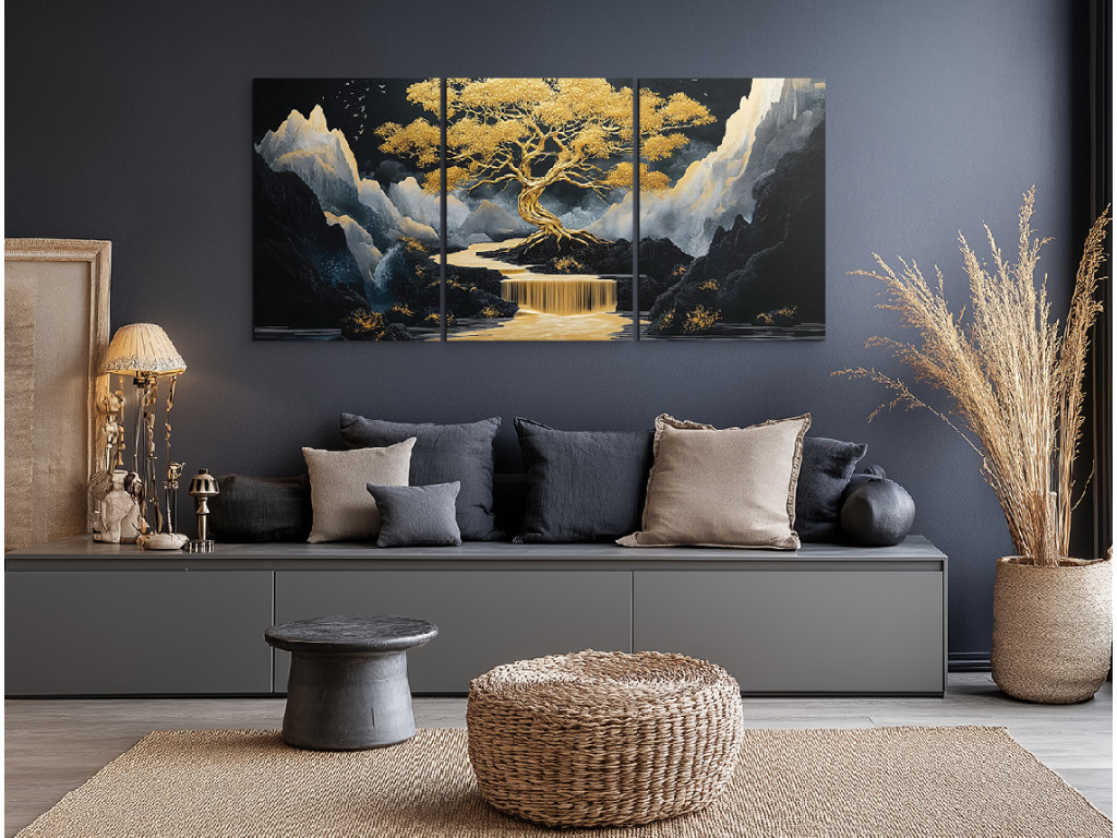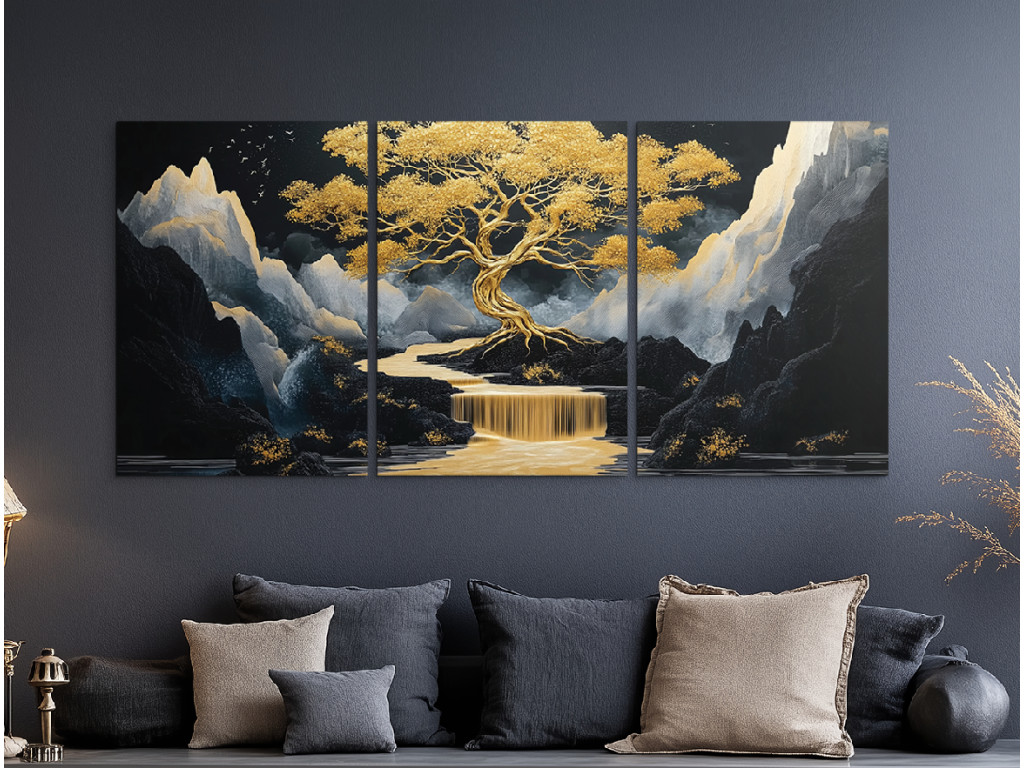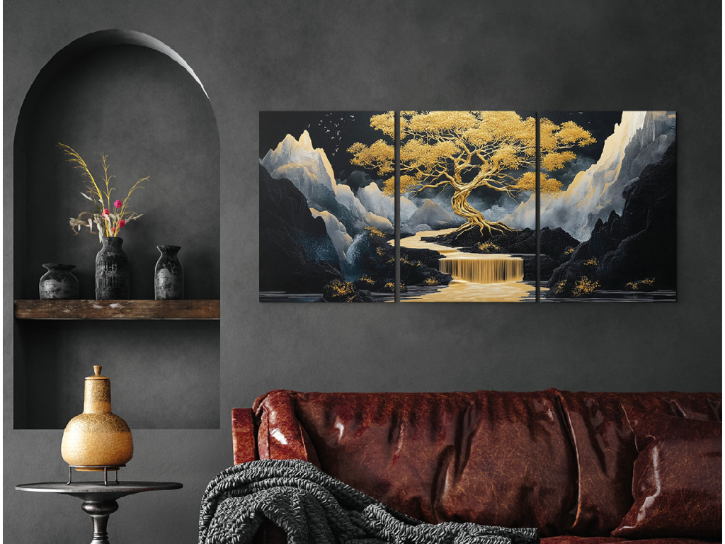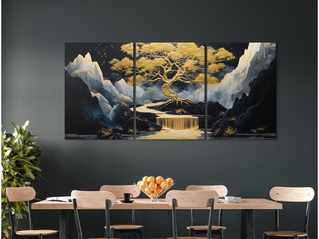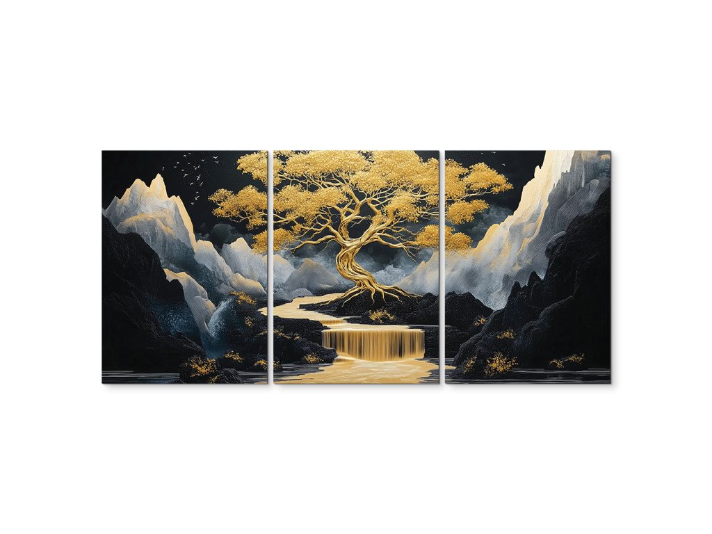 Der goldene Baum in der Mitte des Triptychons wirkt wie ein harmonischer Mittelpunkt der Natur und Energie. Unter ihm ergießt sich ein goldener Wasserfall, umgeben von dunklen und hellen Bergmassiven. Der dramatische Kontrast zwischen dem Baum des Lebens und den goldenen Akzenten schafft eine visuelle Symphonie aus Ruhe und Kraft.