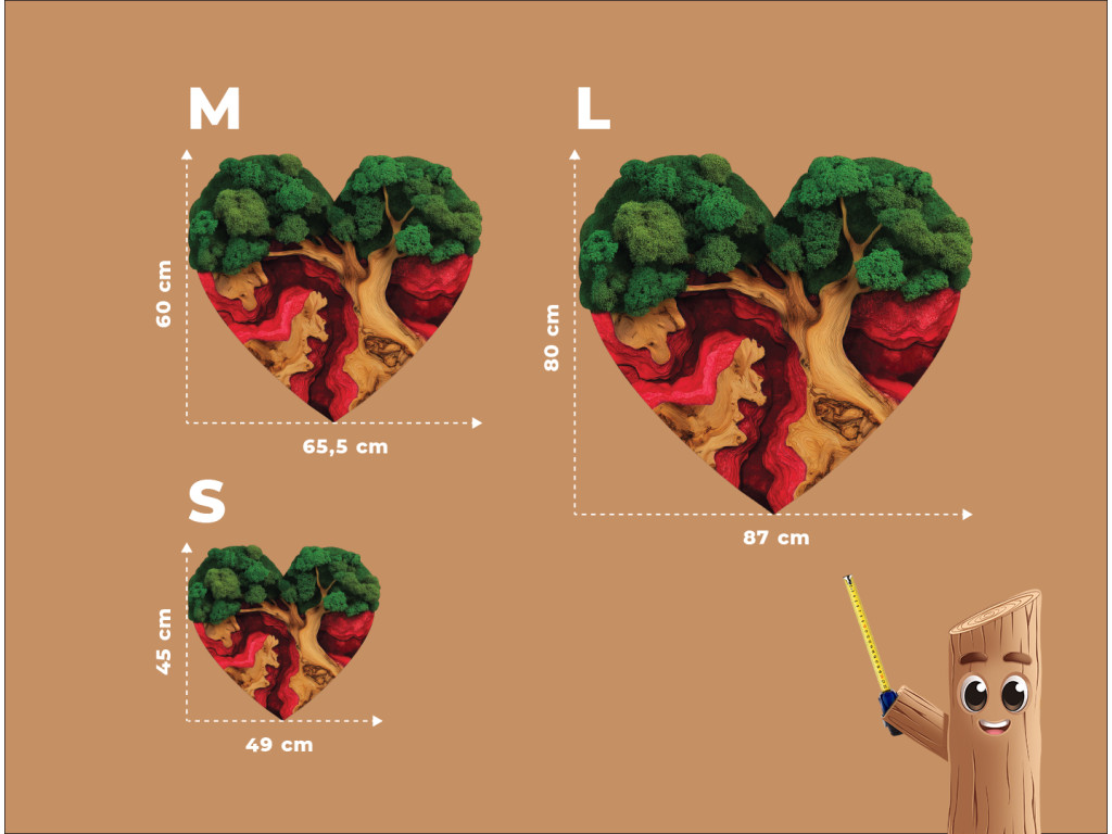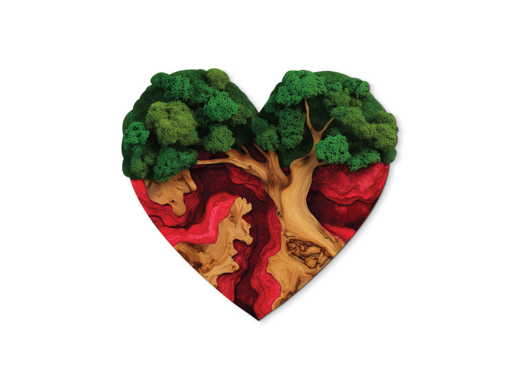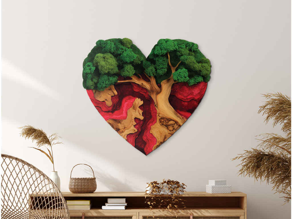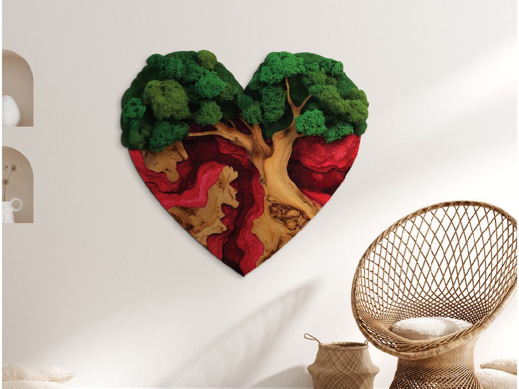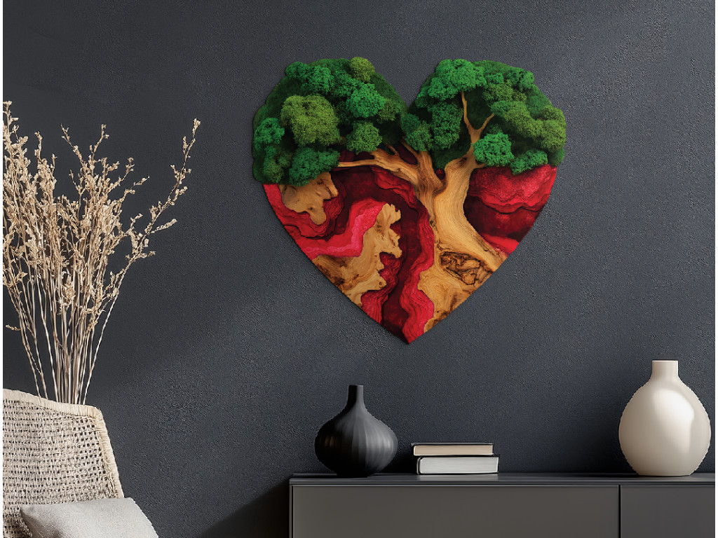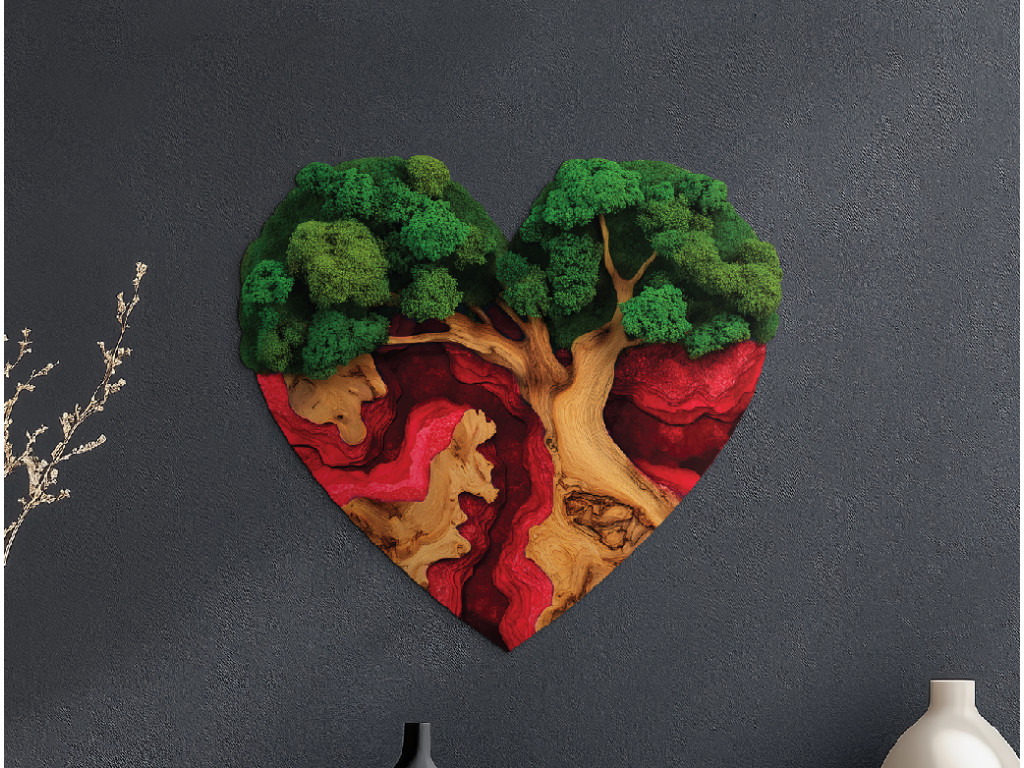 Der Mooslebensbaum Sehnsucht des Herzens ist ein einzigartiges UV-gedrucktes Bild, in dem das Symbol des Lebens mit dem Symbol der Liebe verbunden ist. Der Baum ist in Form eines Herzens geschnitzt, seine Krone wirkt wie aus dichtem grünem Moos und die Wurzeln gehen fließend in einen dunkelroten Epoxid-Effekt über. So entsteht ein Kontrast zwischen Natur und Leidenschaft, der die Kraft der Verbindung unterstreicht.