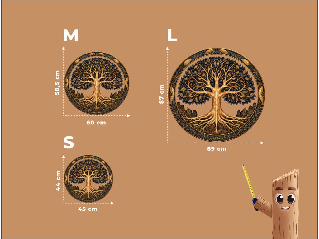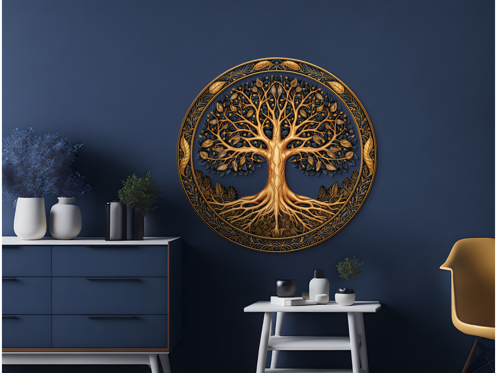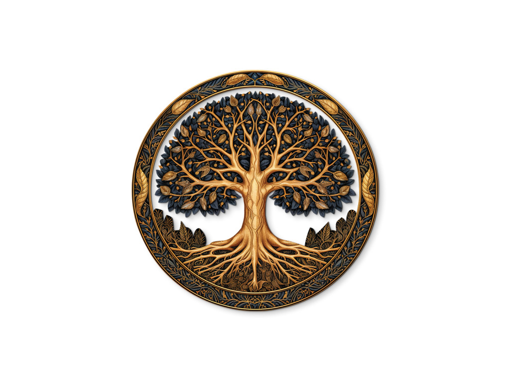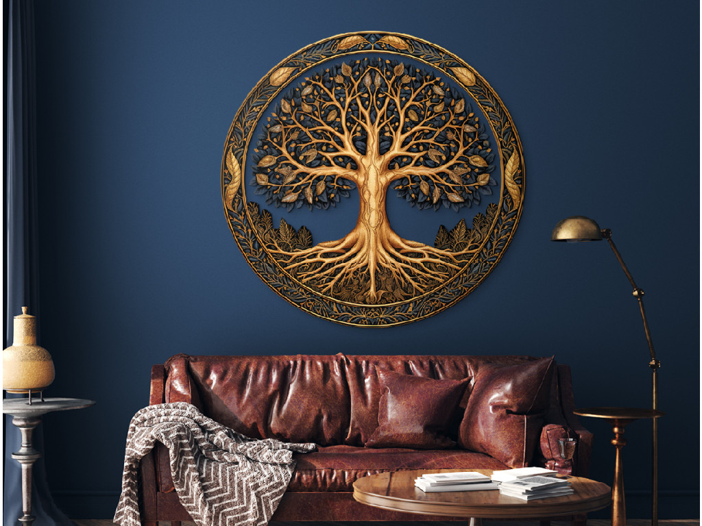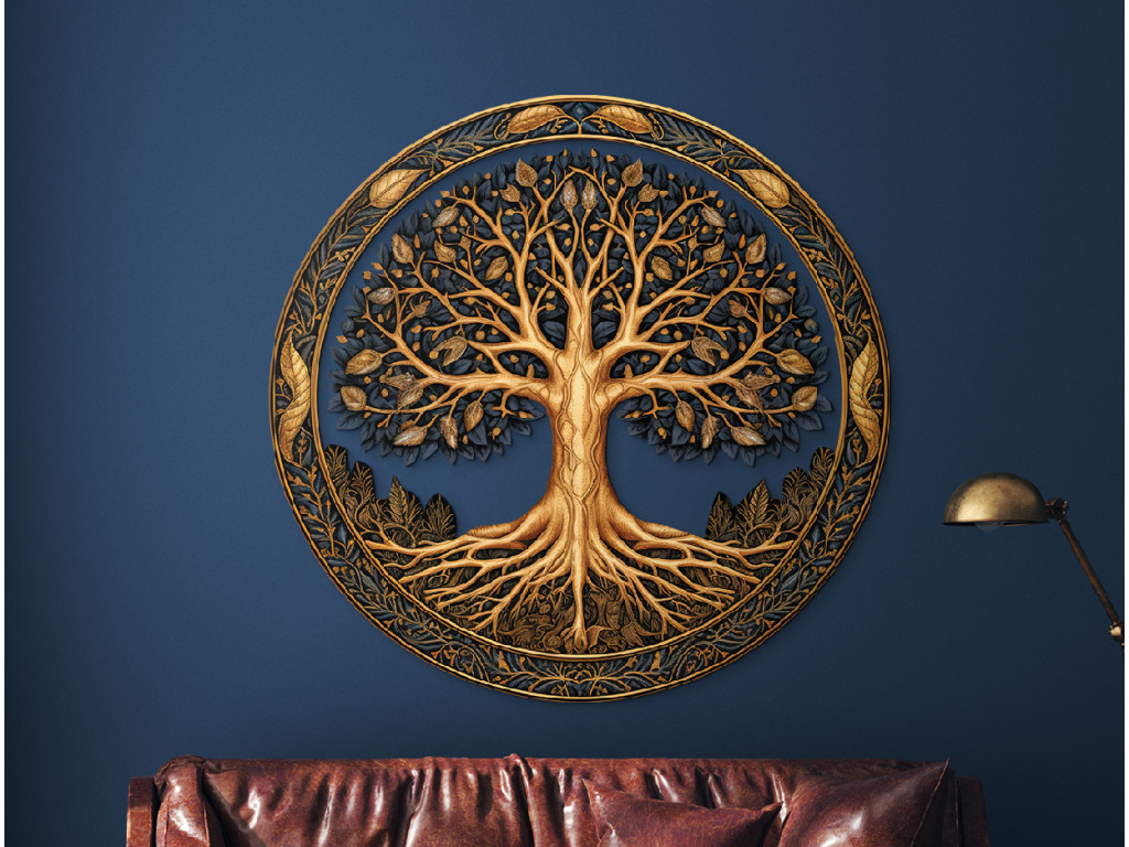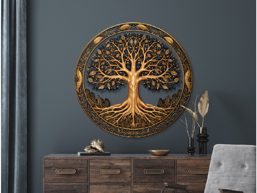 Die runde Wanddekoration zeigt den Baum des Lebens in Gold- und Bronzefarben, wobei der Schwerpunkt auf der detaillierten Gestaltung der Wurzeln, des Stammes und der Krone liegt. Das gesamte Motiv Gedächtnis der Erde ist von einem verzierten runden Rahmen mit Blattornamenten umgeben, der den Eindruck eines Artefakts aus einer alten Zivilisation vermittelt.