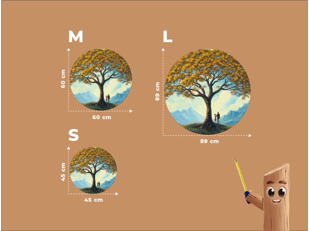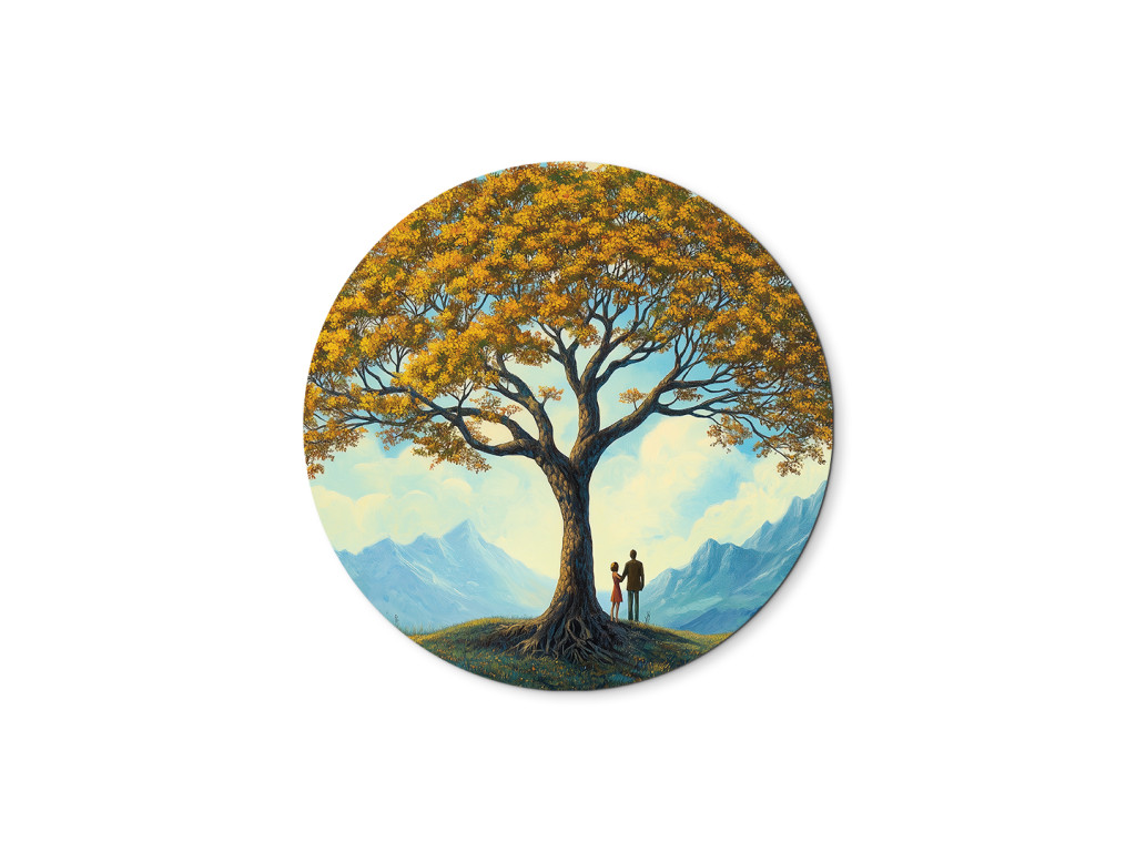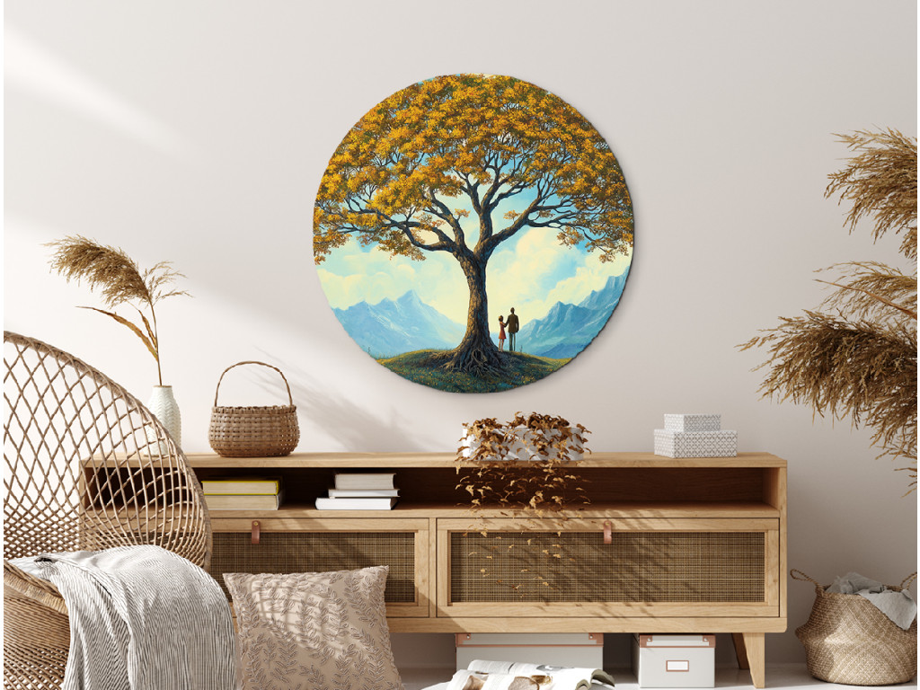 Ein ausladender goldener Baum mit sichtbaren Wurzeln steht im Zentrum der kreisförmigen Komposition und symbolisiert Stabilität und die Verbindung zwischen den Generationen. Zwei Figuren blicken auf die bläulichen Berge unter einem sanften Himmel, was ein Gefühl der Hoffnung und Kontinuität vermittelt. Das runde Format des Bildes unterstreicht die Zyklizität des Lebens und die Einheit des Menschen mit der Natur.