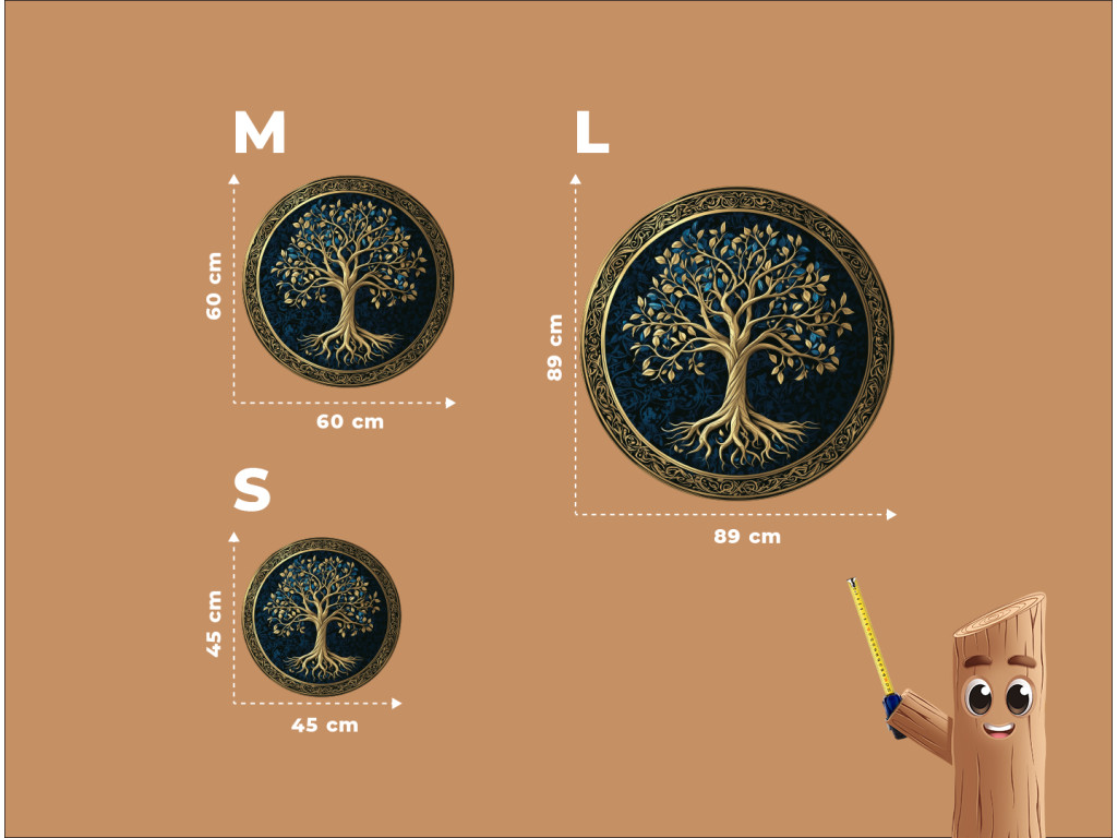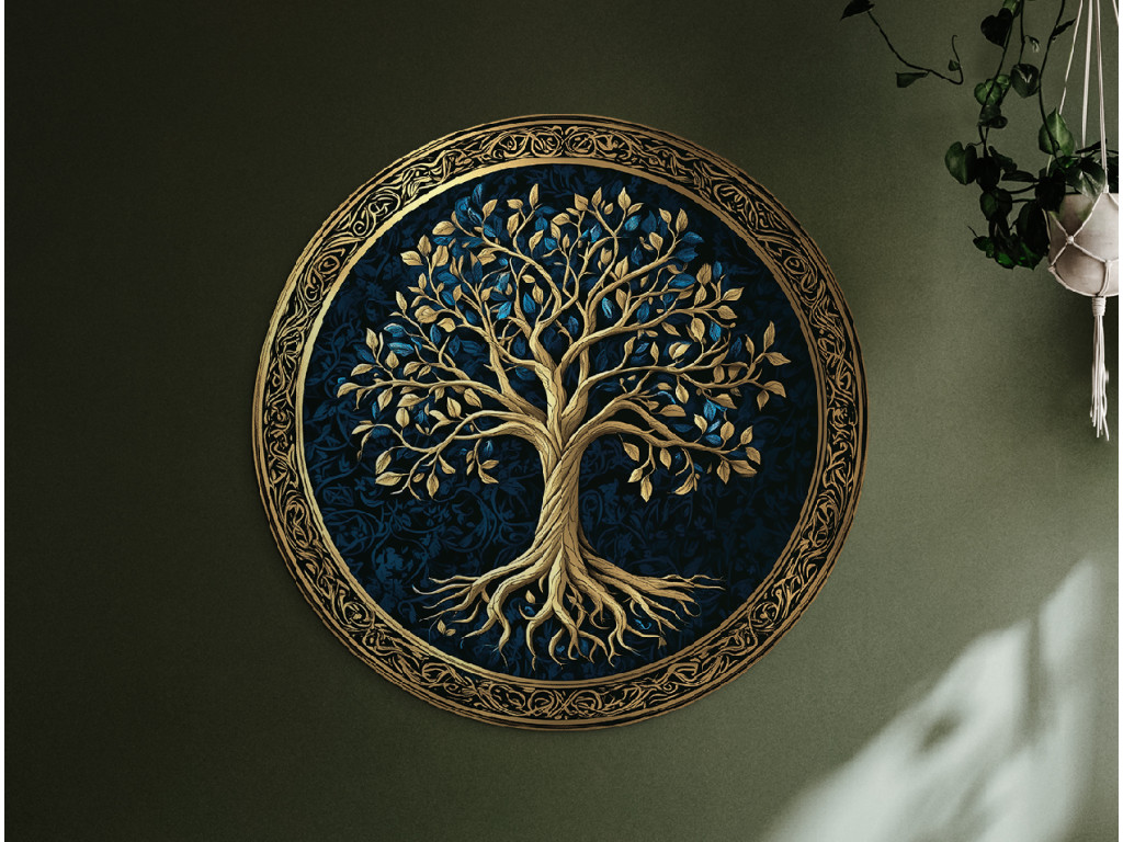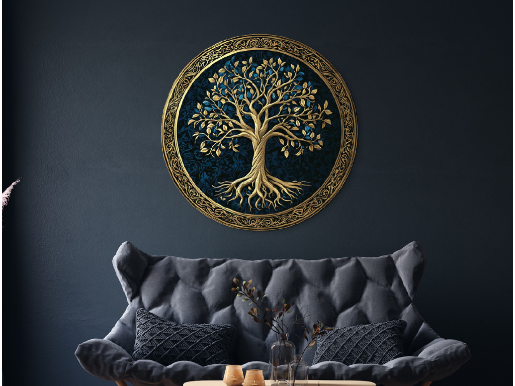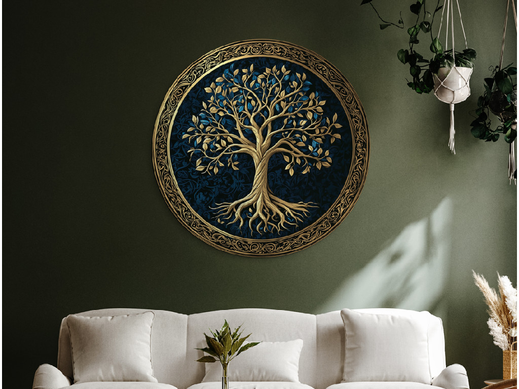 Die runde Wanddekoration mit dem Motiv Baum des Lebens zeigt reichhaltiges goldenes Laub und Wurzeln auf einem dunkelblauen gemusterten Hintergrund. Das Ganze wird von einem ornamentalen goldenen Kreis umrahmt, der die Symbolik der Ewigkeit und Harmonie unterstreicht. Geeignet als eleganter Akzent für moderne und klassische Innenräume.