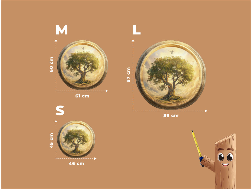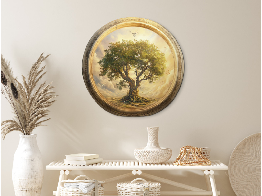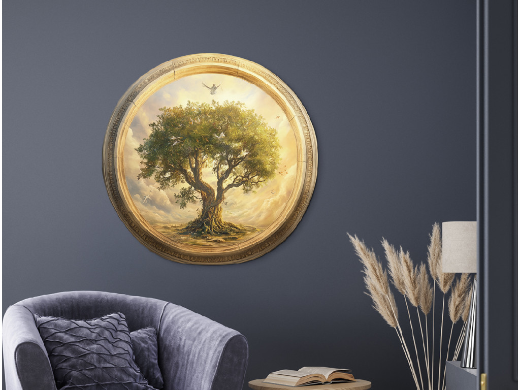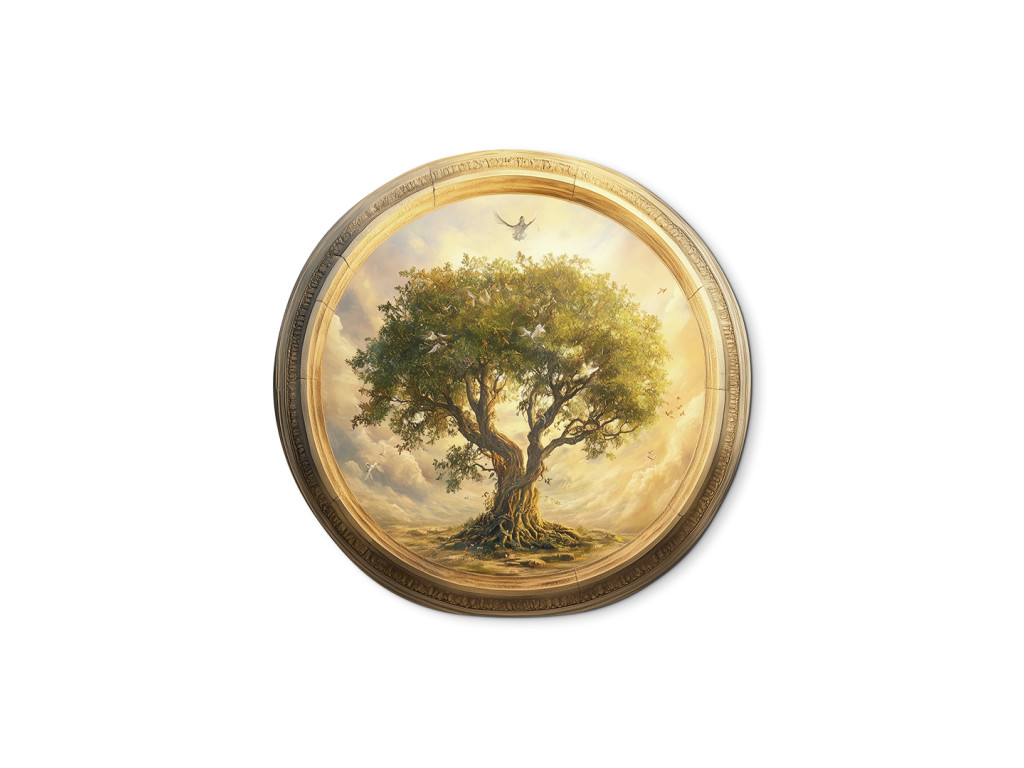 Das runde Bild im Stil eines antiken Medaillons zeigt den Baum des Lebens mit einer grünen Krone und reich verzweigten Wurzeln. Im Hintergrund schweben Vögel am Himmel, von denen einer an eine Friedenstaube erinnert. Das Ganze wird durch einen verzierten Rahmen in Goldtönen abgerundet, der elegant und zeitlos wirkt.