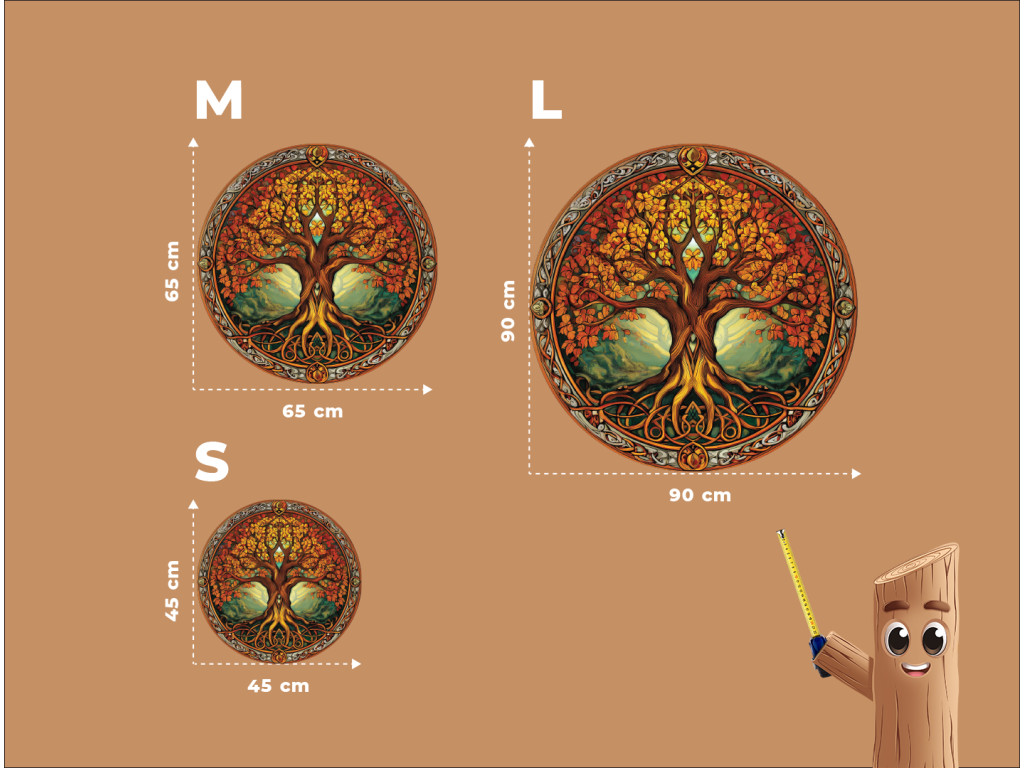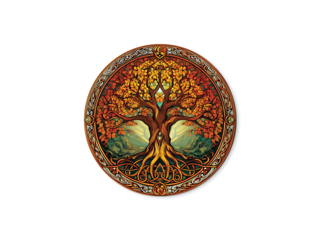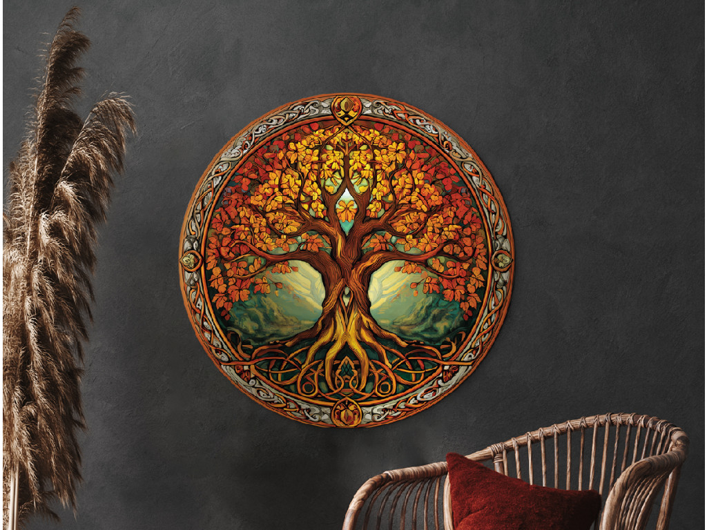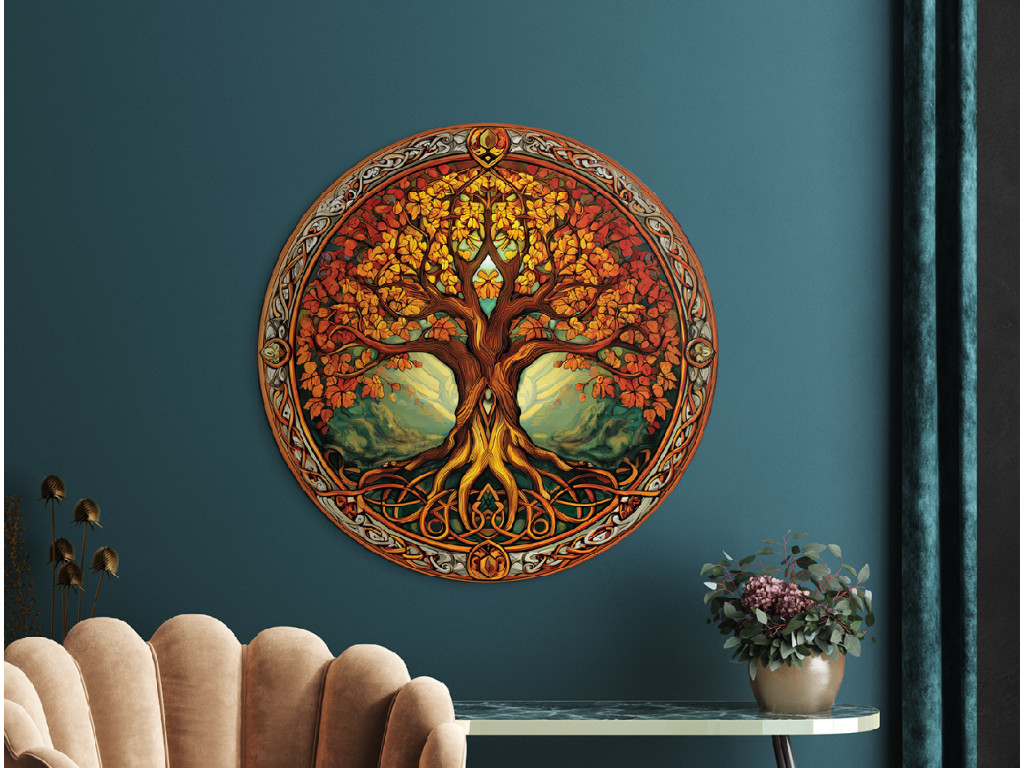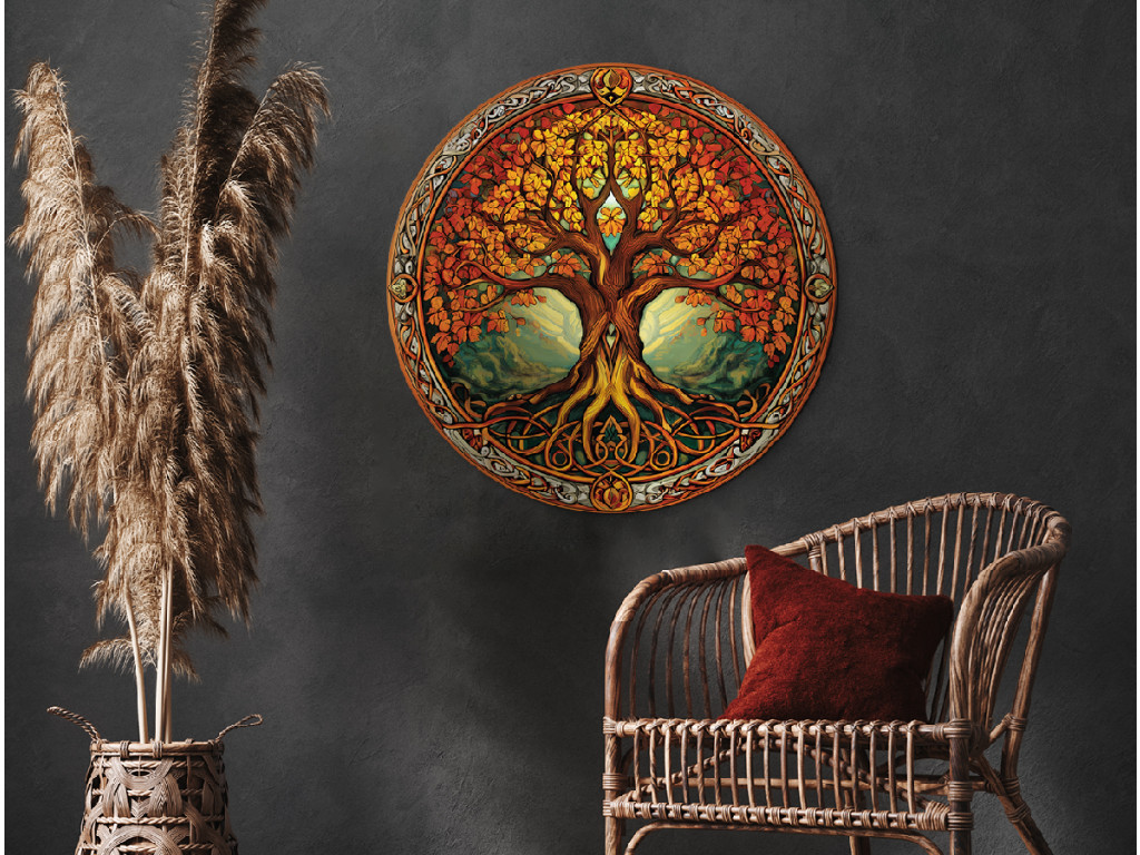 Der Baum des Lebens – Herbst verbindet die Symbolik des ewigen Kreislaufs mit den warmen Farben des Herbstes. Die Baumkrone in Orange-, Gelb- und Rottönen kontrastiert mit dem grünen Hintergrund und dem detailreichen Rahmen mit keltischen Ornamenten. Die reichhaltige Struktur des Bildes verleiht ihm einen mystischen und künstlerischen Charakter, der jedes Ambiente belebt.