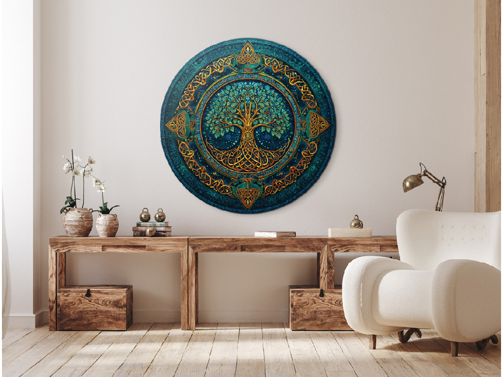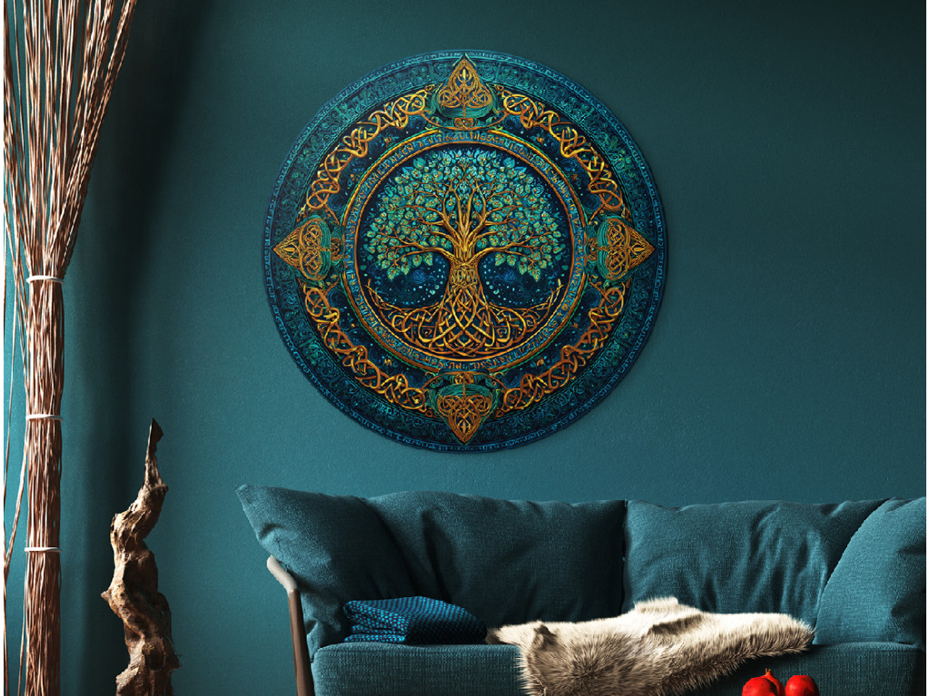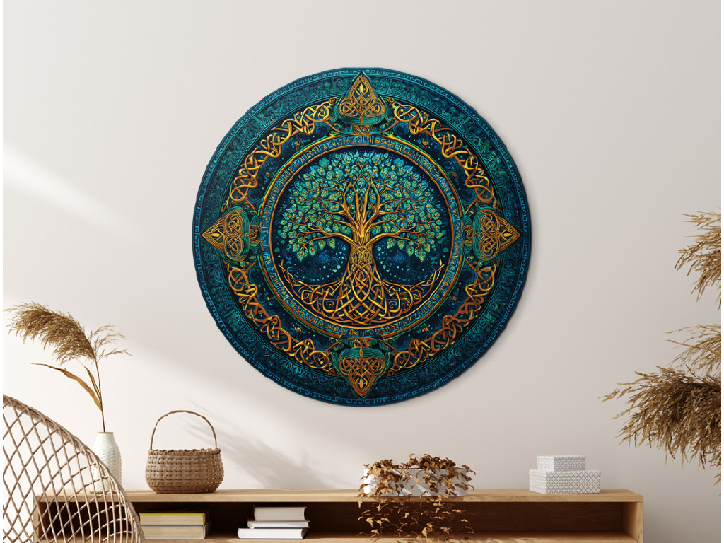 Der runde Baum des Lebens Mystik verbindet goldene Wurzeln, Stamm und Äste mit Blättern in Grün- und Türkistönen. Der reichhaltige Hintergrund in satten Farben und der detaillierte keltische Rahmen in Goldtönen verleihen dem Bild einen mystischen und luxuriösen Look, der die Kraft, Ewigkeit und Verbundenheit allen Lebens symbolisiert.